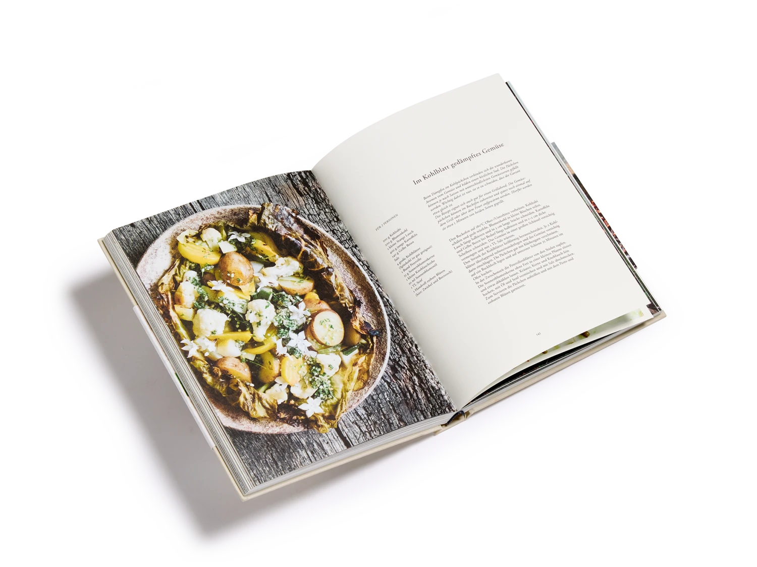 Durch die Zubereitung mit Hitze, am ursprünglichsten über der Glut, entfaltet sich eine Vielzahl an Geschmacksnuancen. Vom rohen Produkt über das Dünsten, Dämpfen, Braten, Rösten, Räuchern bis zum Verbrennen – Hitze verwandelt Lebensmittel, kann sie knusprig, zart, weich oder fest werden lassen, Aromen hervorheben und verstärken. Je nach Zutat und Rezept entstehen so aus der Kombination der drei Grundlagen Erde, Salz und Glut köstliche Gerichte, die sich stets im Rhythmus der Jahreszeiten verändern.