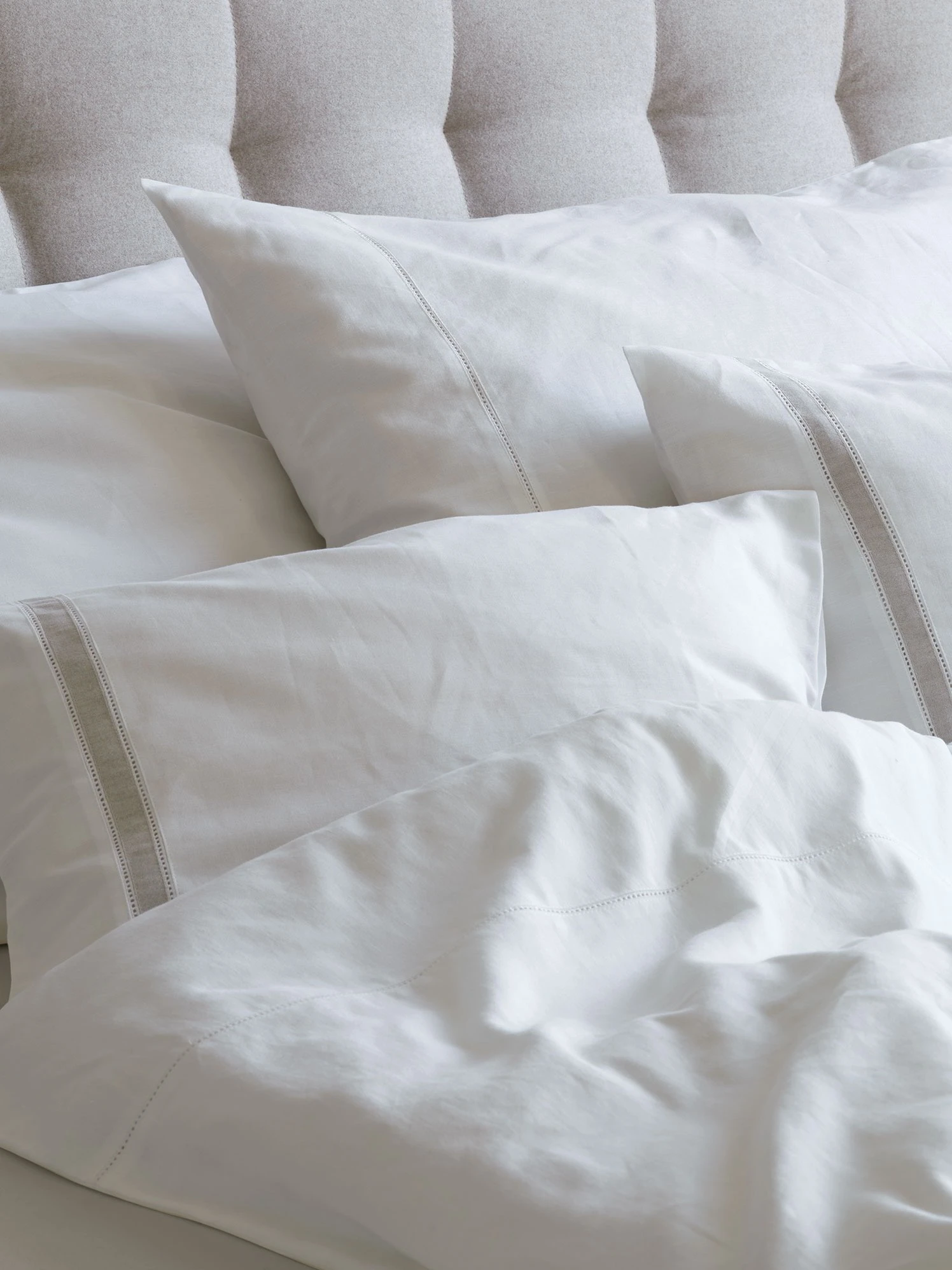 Diese Halbleinen-Bettwäsche überzeugt mit einer besonders hochwertigen Qualität, einer kompromisslosen Verarbeitung sowie einem edlen Dessin. Die Bettwäsche Josephine wird in Österreich gewebt und anschließend bei unserem Partnerbetrieb im Allgäu konfektioniert sowie nach dem strengen Global Organic Textile Standard zertifiziert. Dank der Kombination zweier Naturgarne – Leinen und gezwirnter Baumwolle – entsteht ein sehr strapazierfähiges Halbleinen-Gewebe, welches mit einer angenehmen Haptik besticht. Ein sorgfältig eingesetztes Ajourband am oberen Ende der Deckenbezüge sowie eingearbeitete Details in den Kissenbezügen sorgen für optische Akzente. Abgerundet wird das Modell mit einem sichtbaren Knopfverschluss mit Knöpfen aus natürlichen Steinnüssen.