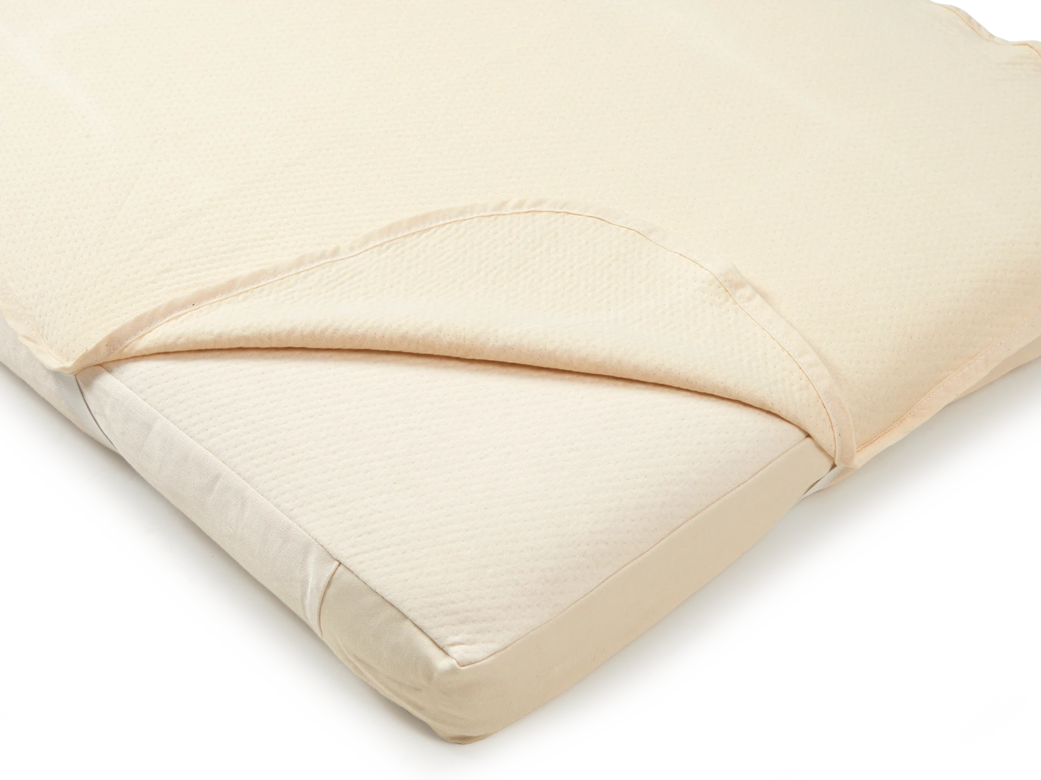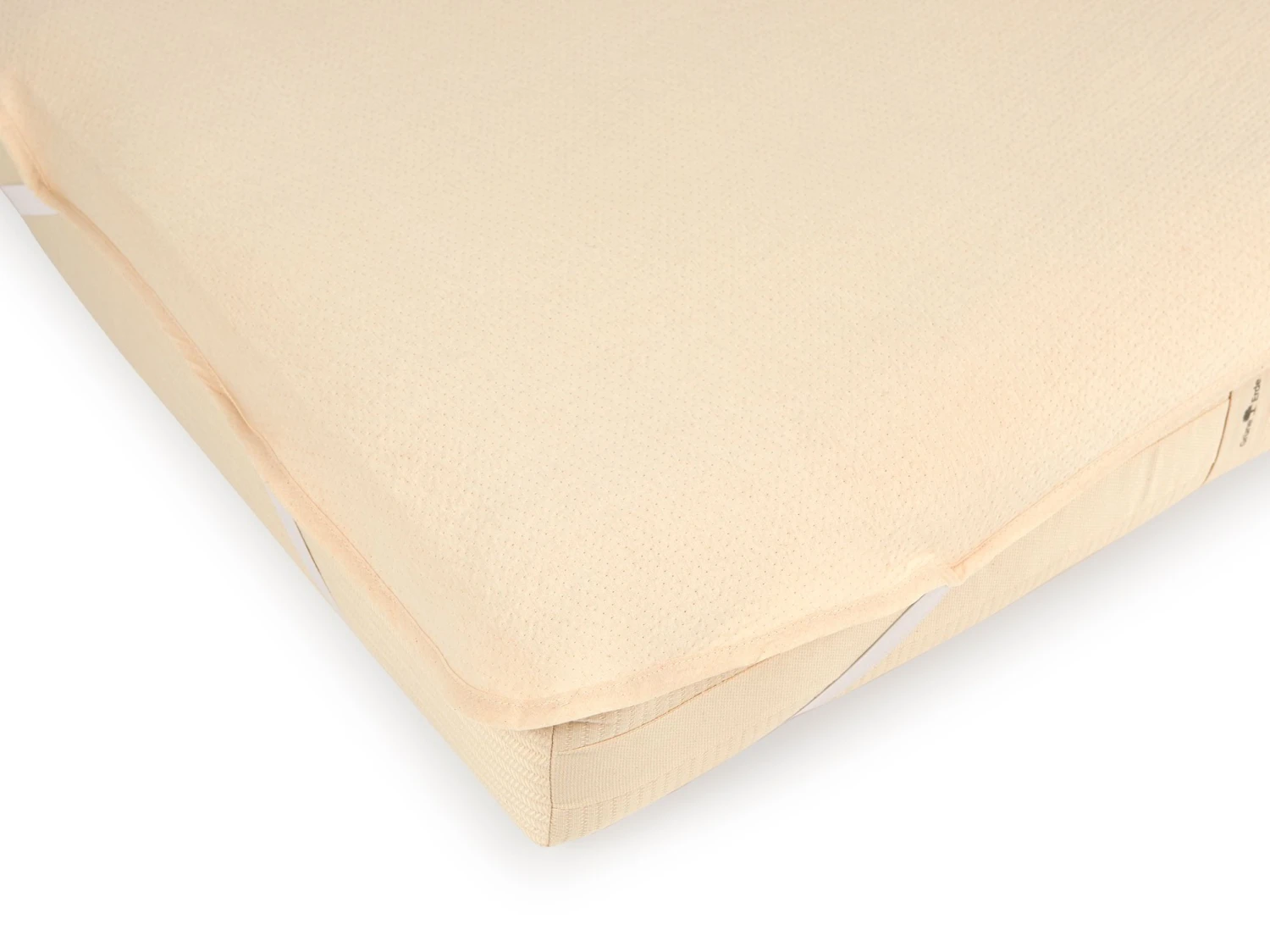 Besonders elastisch, dicke, saugfähige Auflage aus elastischem, 100 % Baumwoll-Doppelstrickstoff. Baumwolle aus kbA: Der Stoff ist aus einem Garn doppellagig gestrickt (nicht gewebt). So bekommt die Auflage mehr Volumen und Elastizität. Die Ränder sind sauber mit Schrägband eingefasst. Mit elastischen Naturlatexbändern an den Ecken – zum einfachen und schnellen Festmachen der Auflage an der Matratze. Ausschließlich aus pflanzlichen Fasern und waschbar, daher auch für (Tierhaar-) Allergiker gut geeignet.