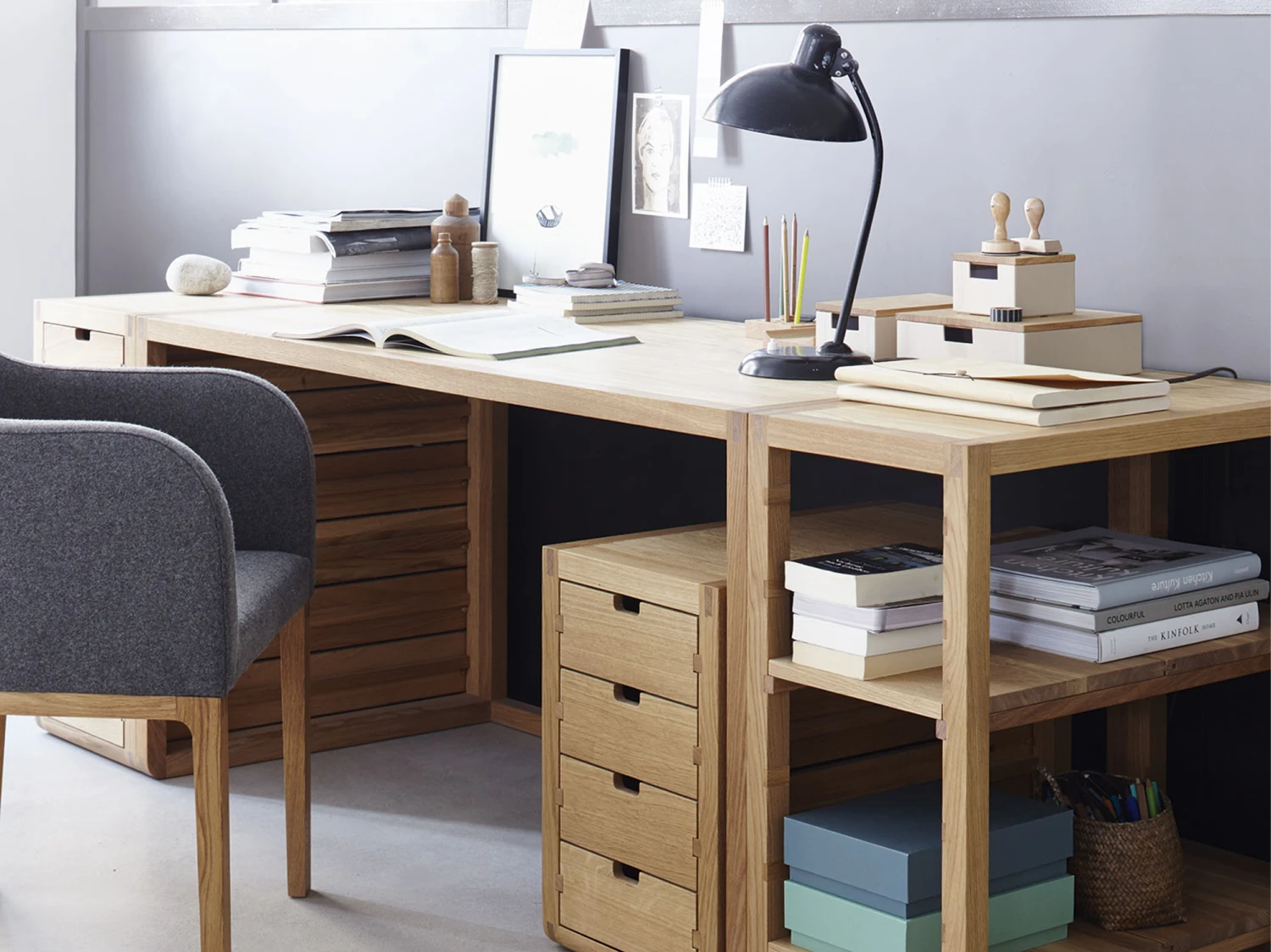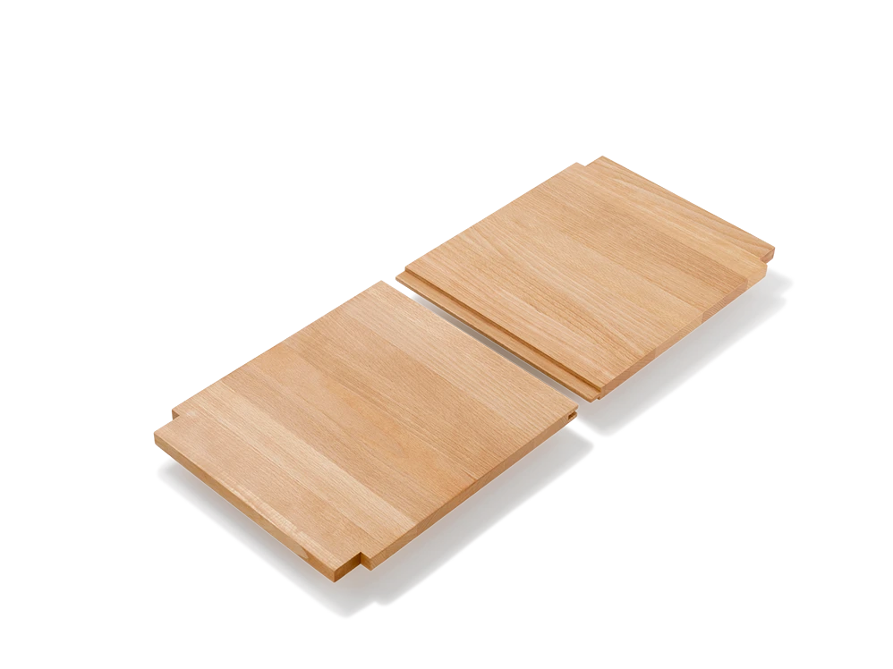 Fachbretter für das Grundgestell zum Schreibtisch Quint. Die Bretter aus stabilem Massivholz werden in gefräste Ausnehmungen des Rahmens geschoben, frei bleibende Ausnehmungen können durch passgenaue Holzteile abgedeckt werden.