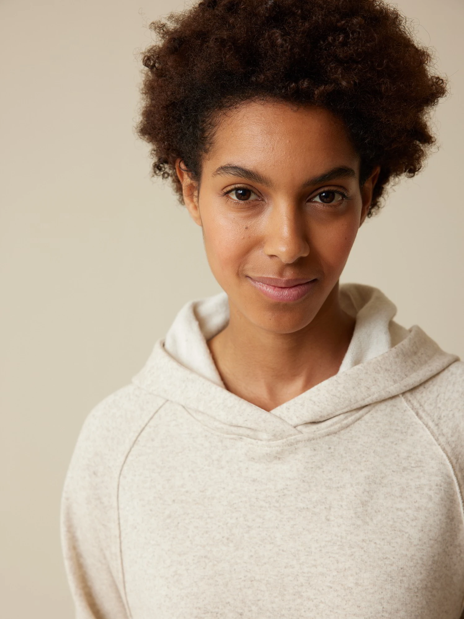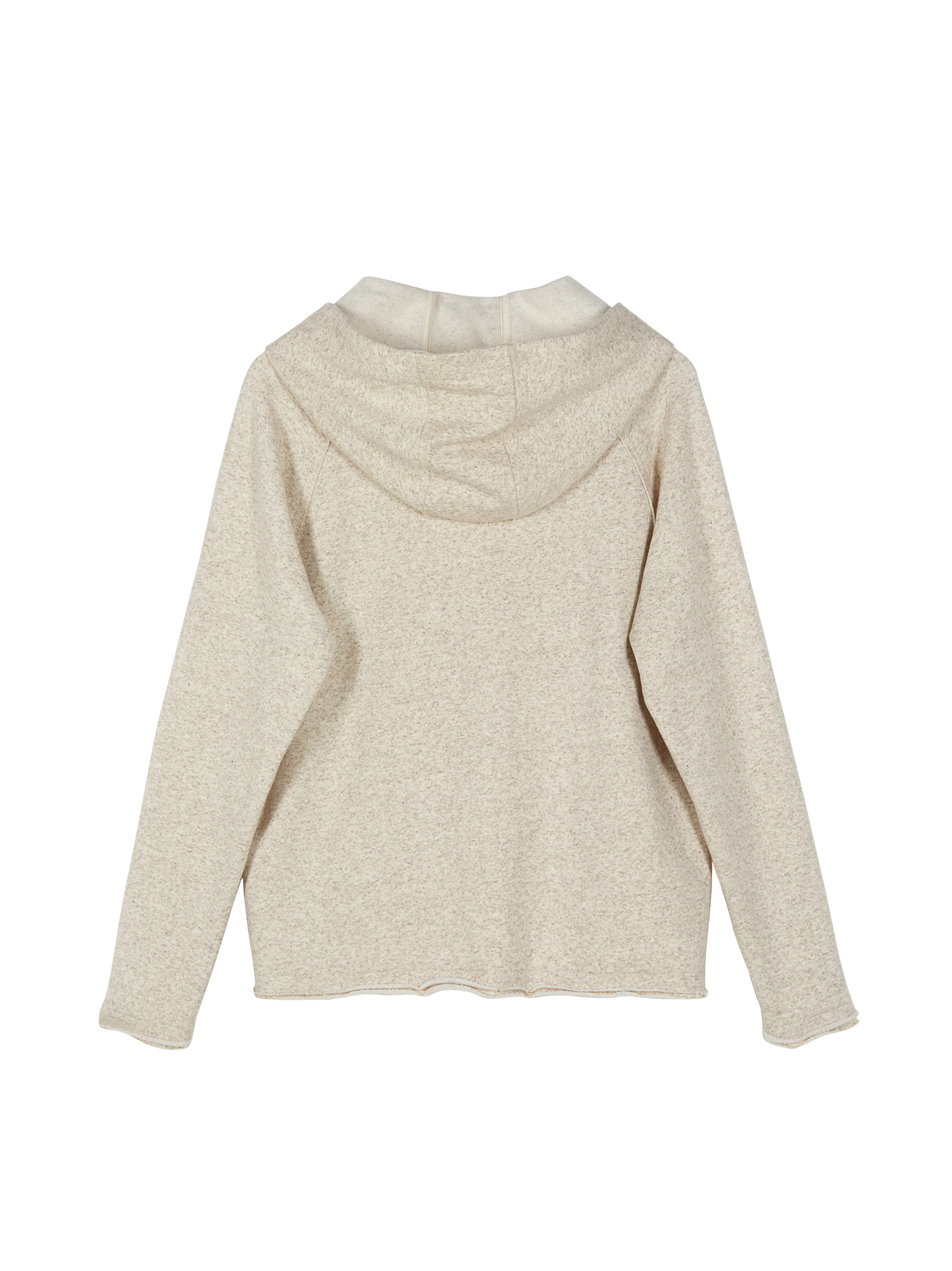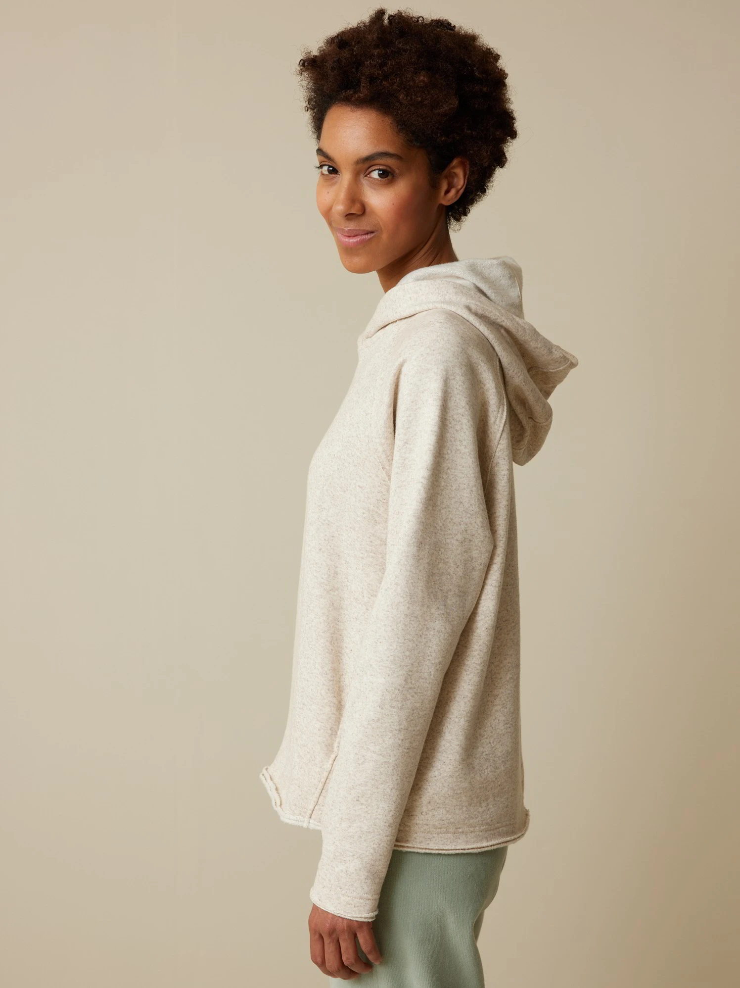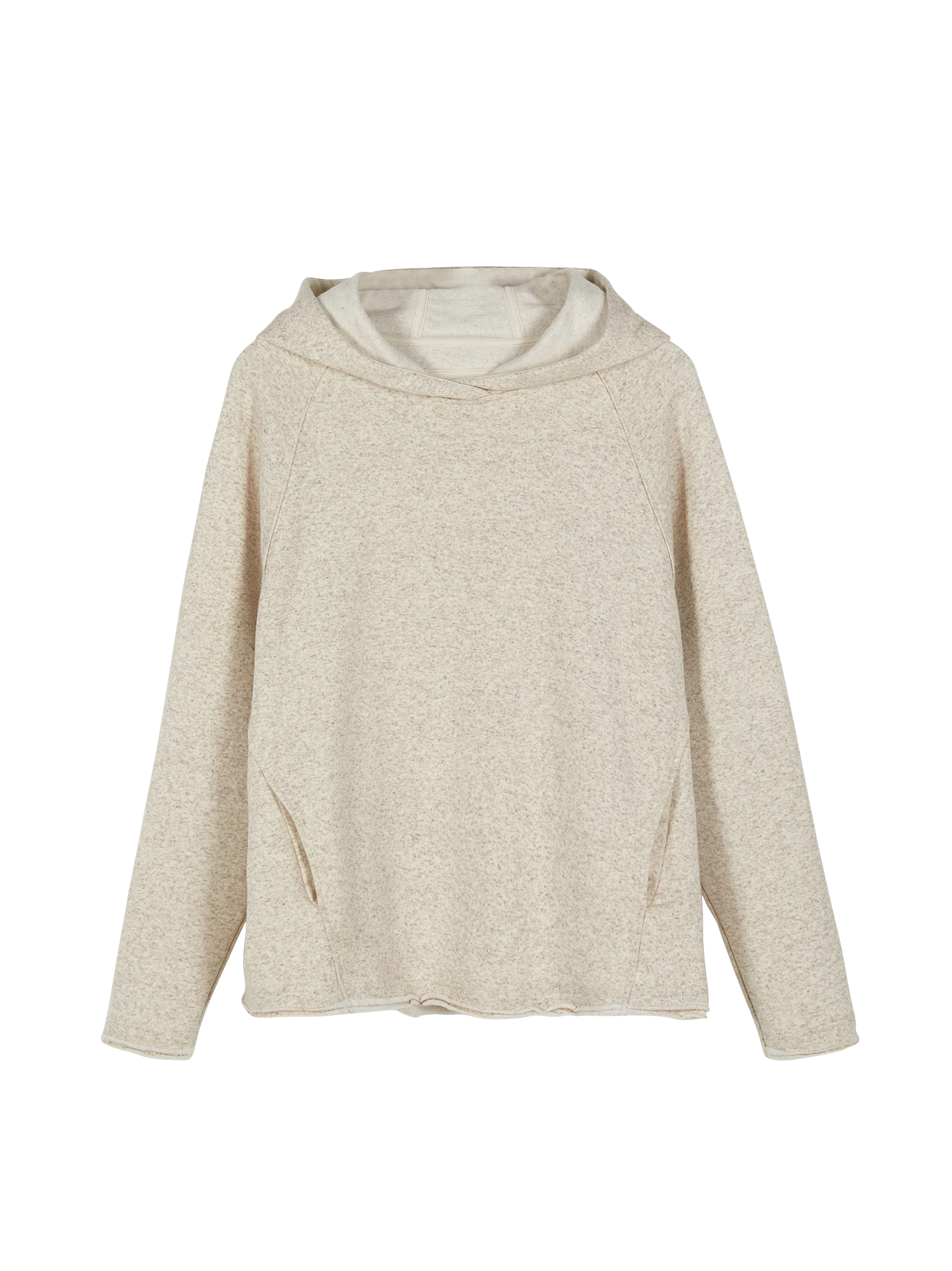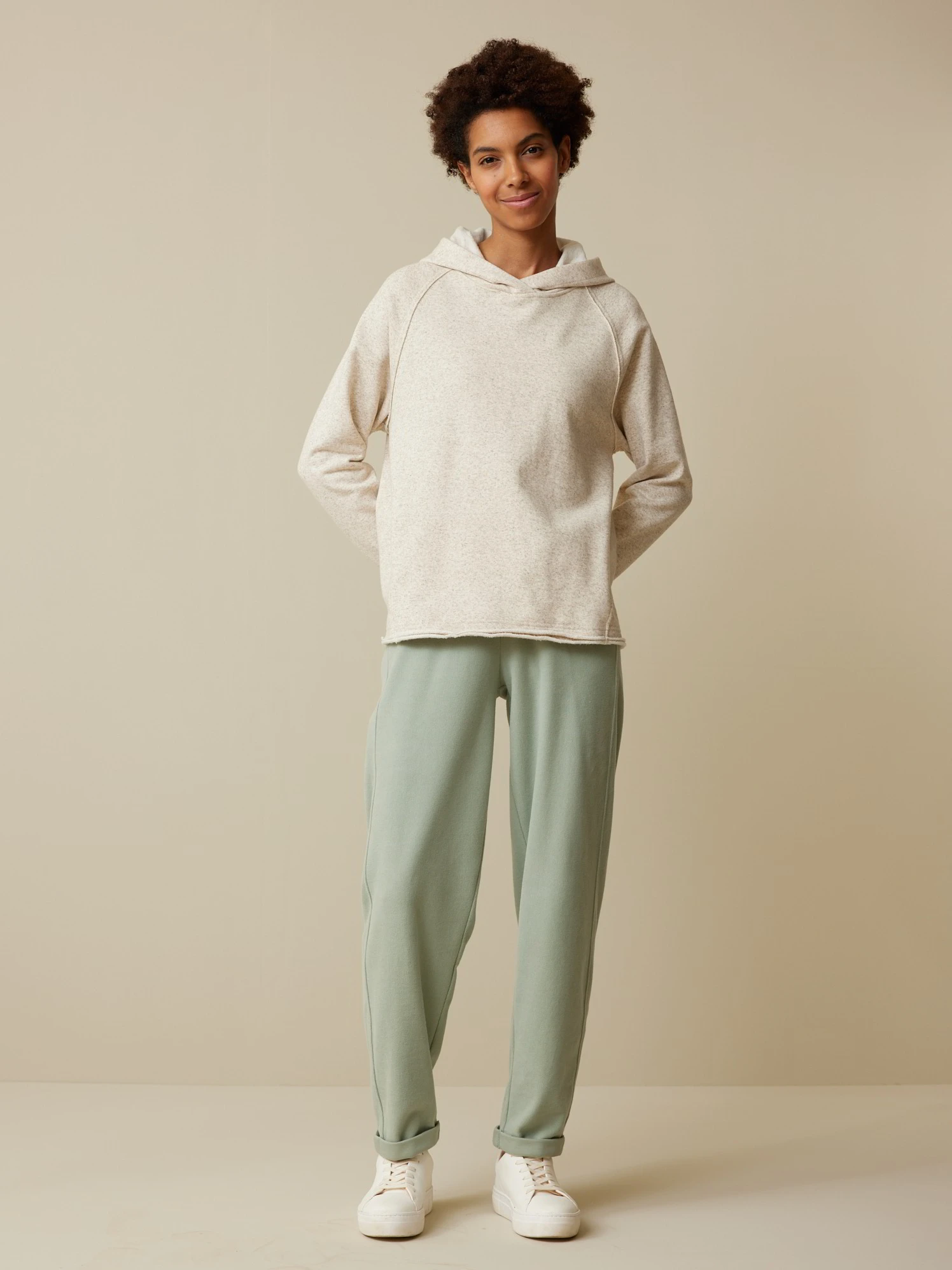 Ungefärbter Sweathoody mit leicht angerauhter Innenseite. Die Kapuze mit Zugband, die langen Raglanärmeln mit nach außen verarbeiteten Nahtzugaben und die zwei Nahttaschen auf der Vorderseite verleihen dem Oberteil aus Baumwolle und Hanf eine gemütliche Lässigkeit. Abgerundet wird das Modell in kuscheliger Fleece- Qualität mit einer Rollkante an den Ärmelabschlüssen sowie am Saum.