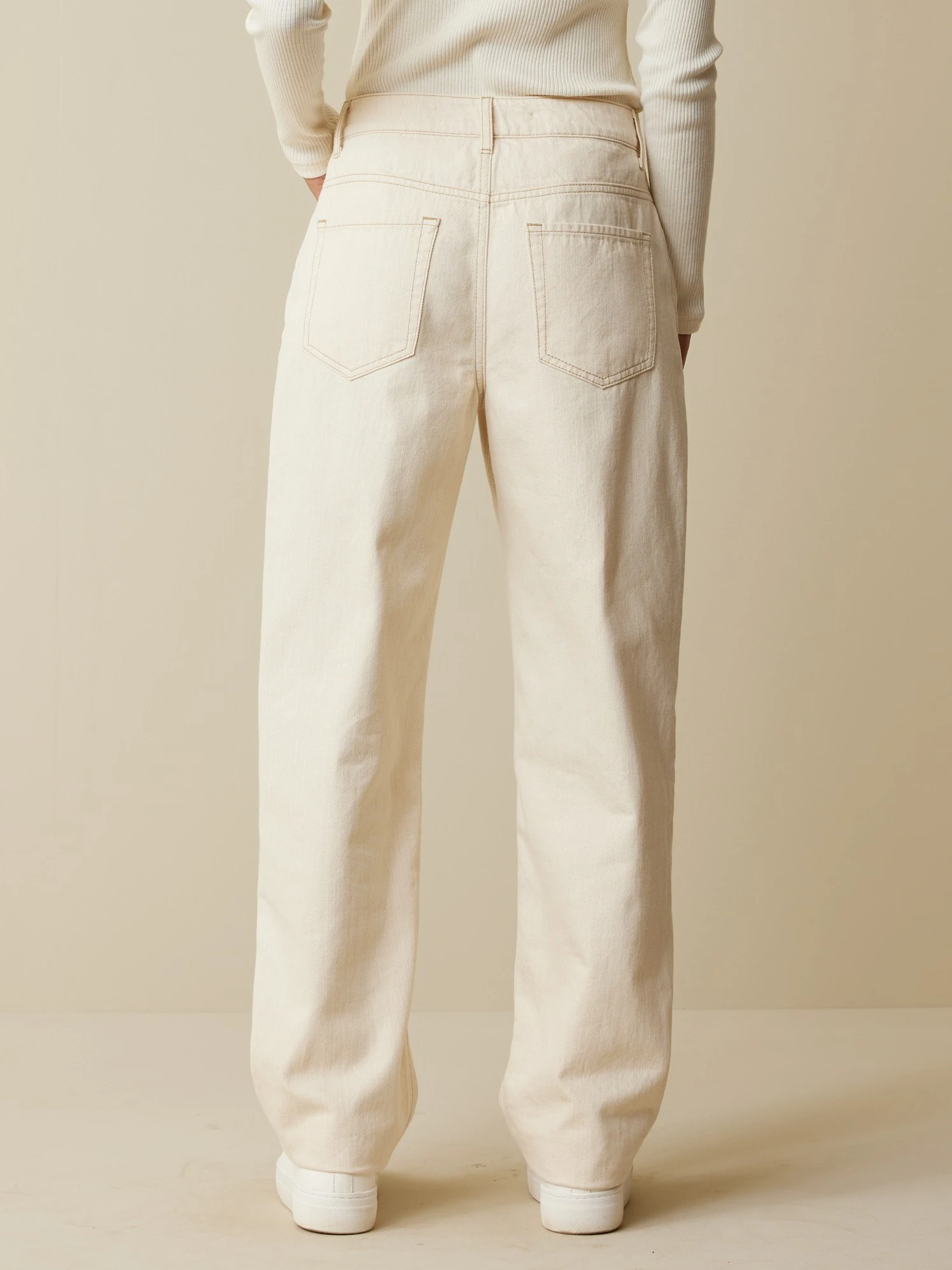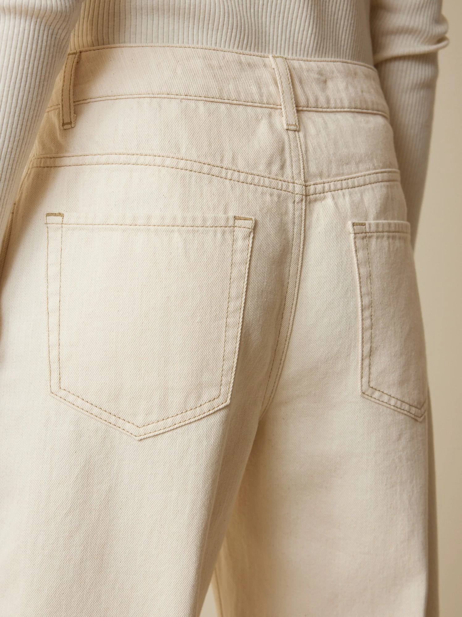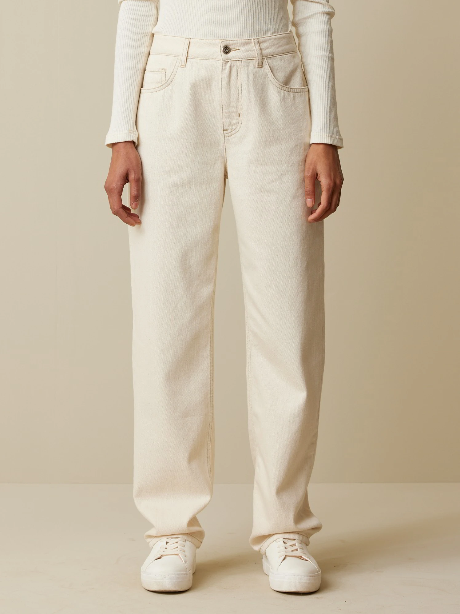 Ungefärbte Hose aus weicher Baumwolle – rein, unverfälscht, hautfreundlich. Das Modell mit der Kontraststeppung hat einen Jeansknopf, einen Reißverschluss und Gürtelschlaufen am Bund. Vorne mit zwei Eingriffstaschen inkl. einer Münztasche, hinten mit typischer Sattelverarbeitung und aufgesetzten Gesäßtaschen.