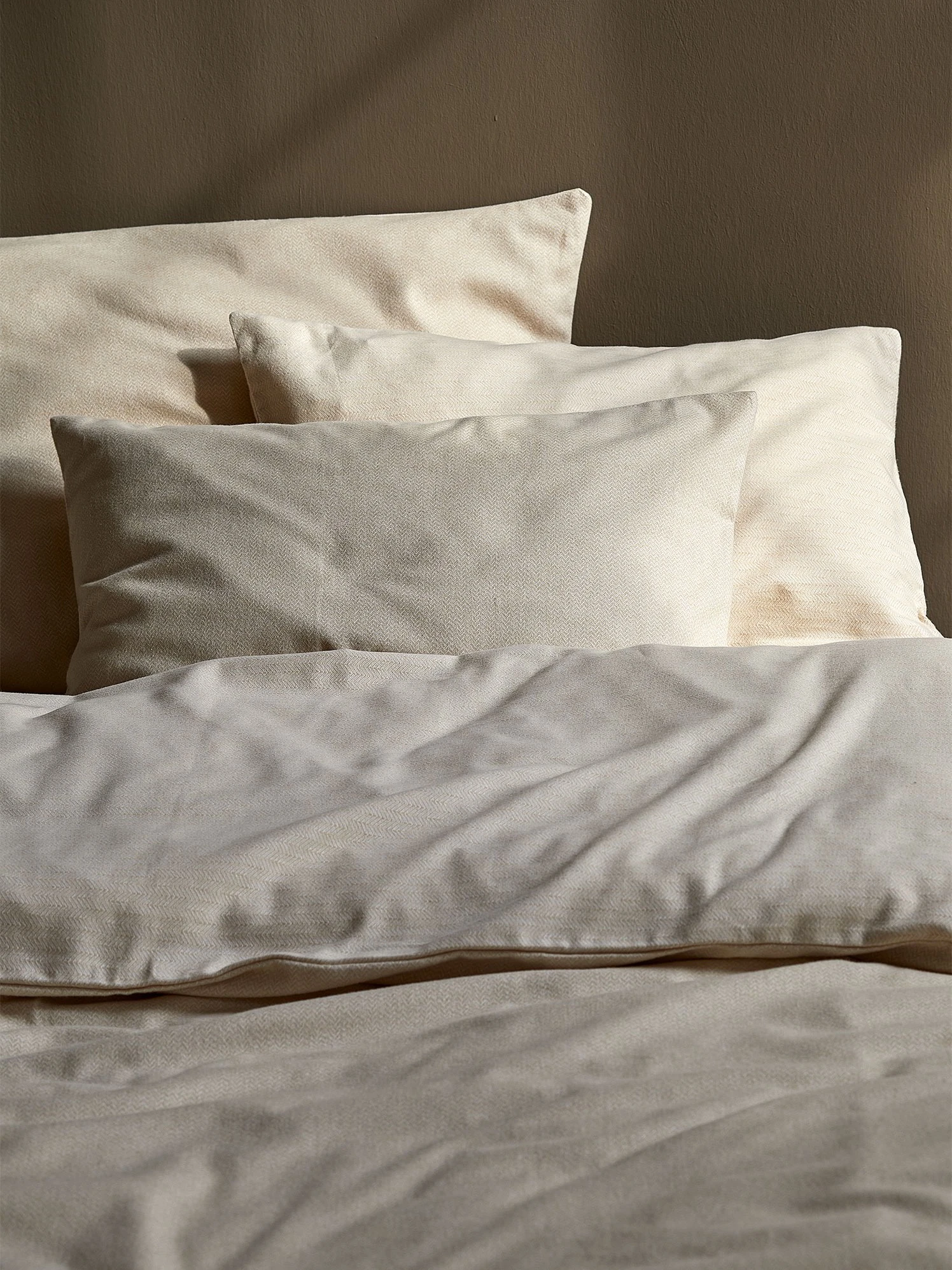Kuschelige Wendebettwäsche aus feinem Edelflanell mit unterschiedlicher Fischgrat-Webung/Richtung. Die aufwendige „Dobby“-Bindung verleiht dem Stoff ein markantes Zick-Zack Muster. Hergestellt aus 100 % Baumwolle.