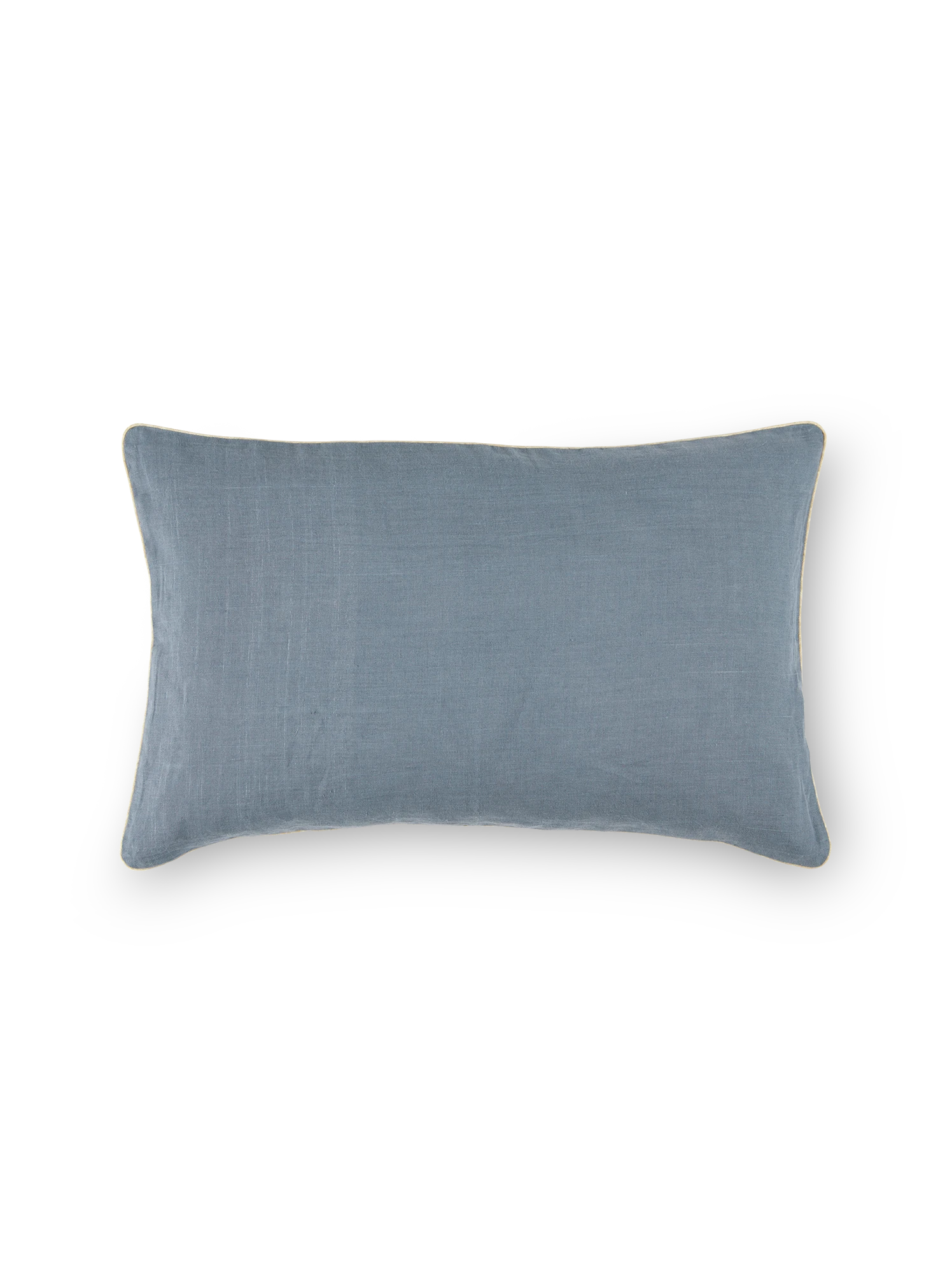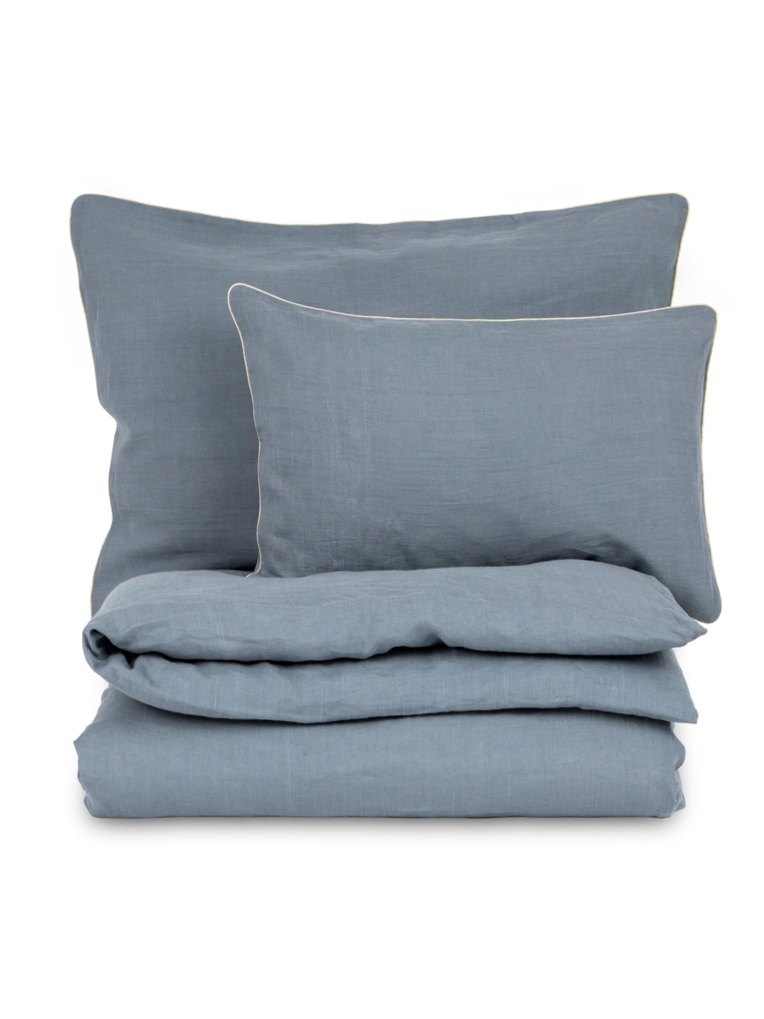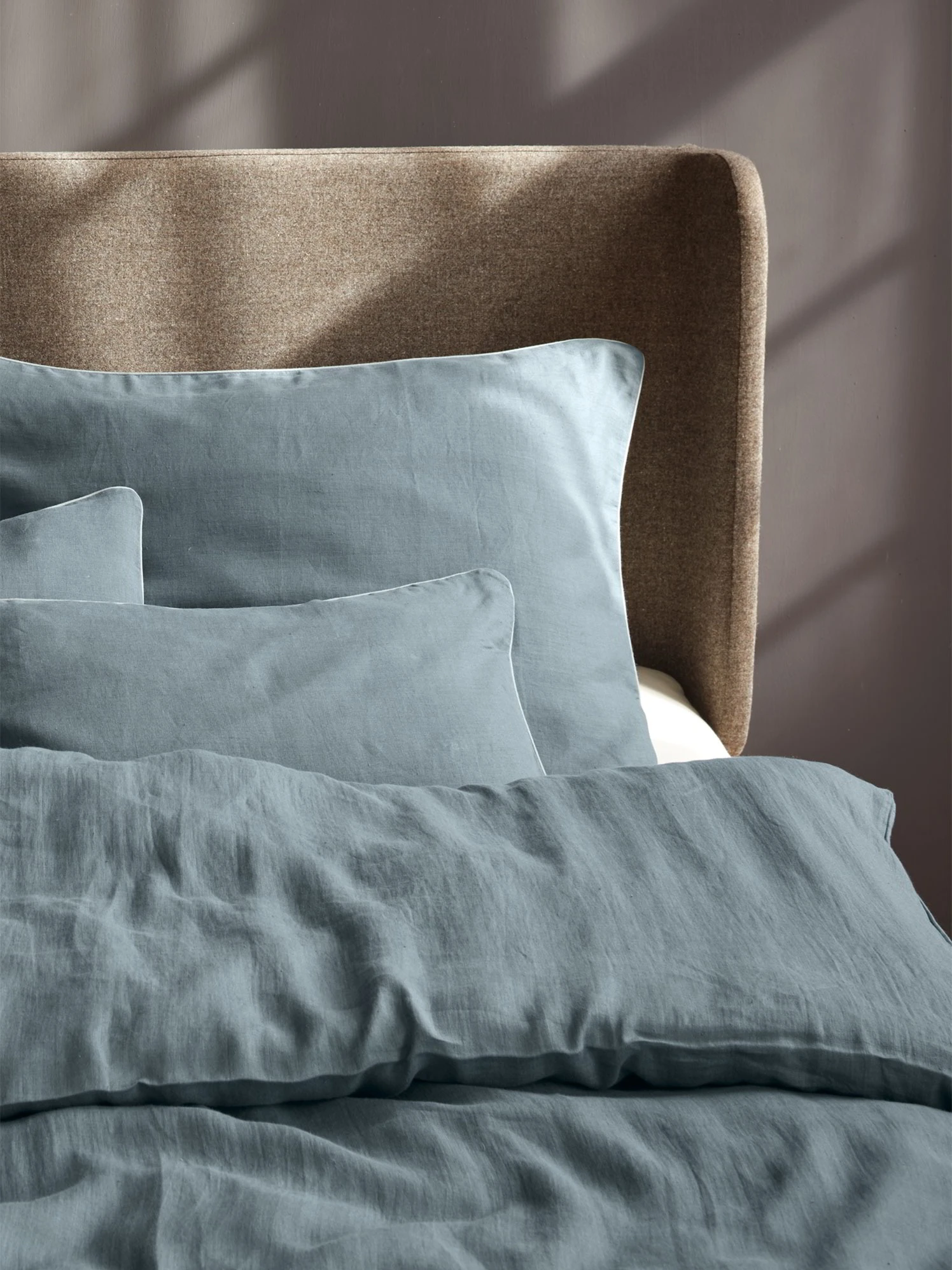 Hergestellt aus 100 % Leinen, in den Farbgebungen Blaugrau oder Graugrün. Kissenüberzüge mit Paspelband in Kontrastfarbe Natur umsäumt. Versetzter, sichtbarer Knopfverschluss mit Steinnussknöpfen in Natur.
