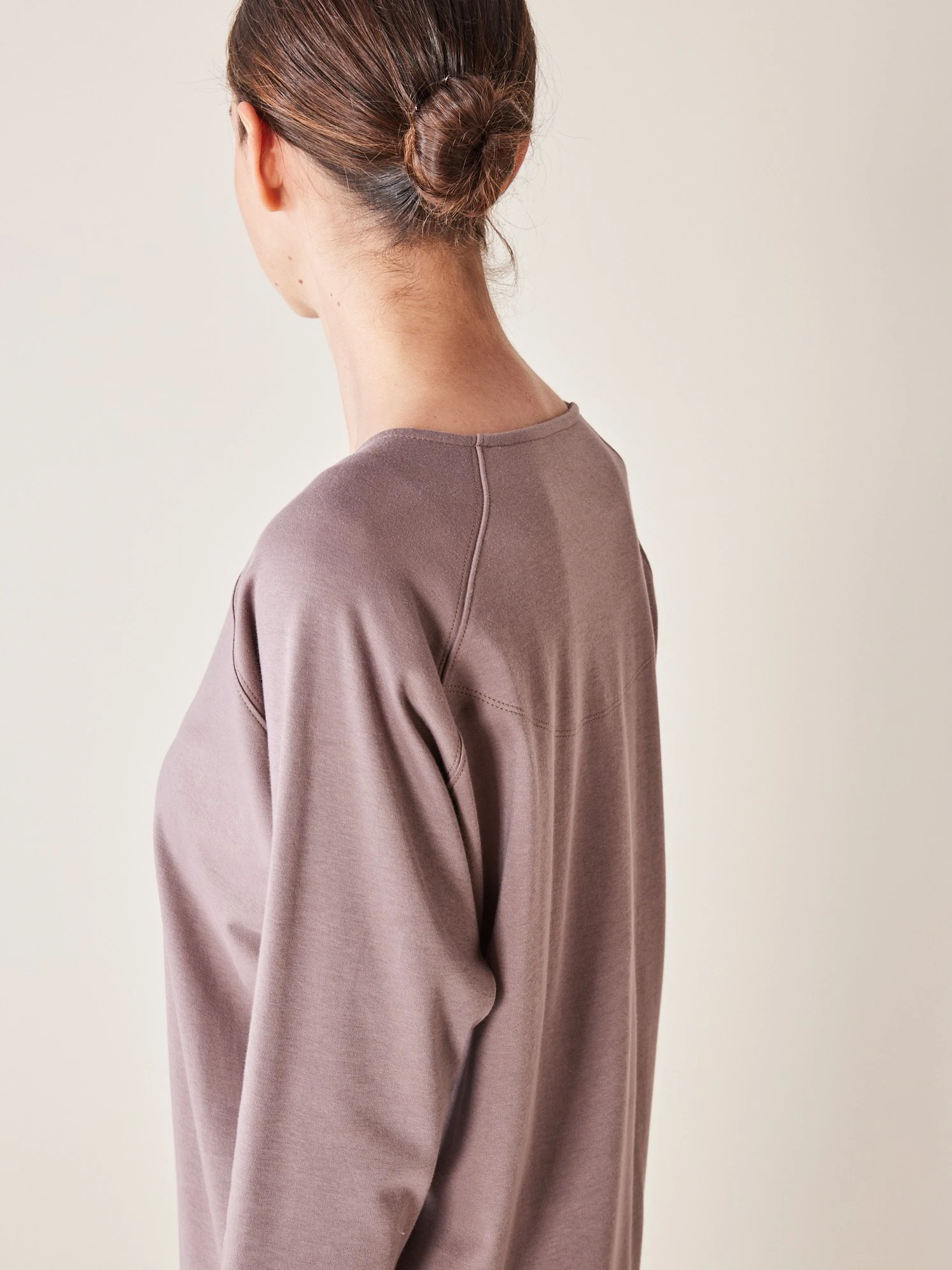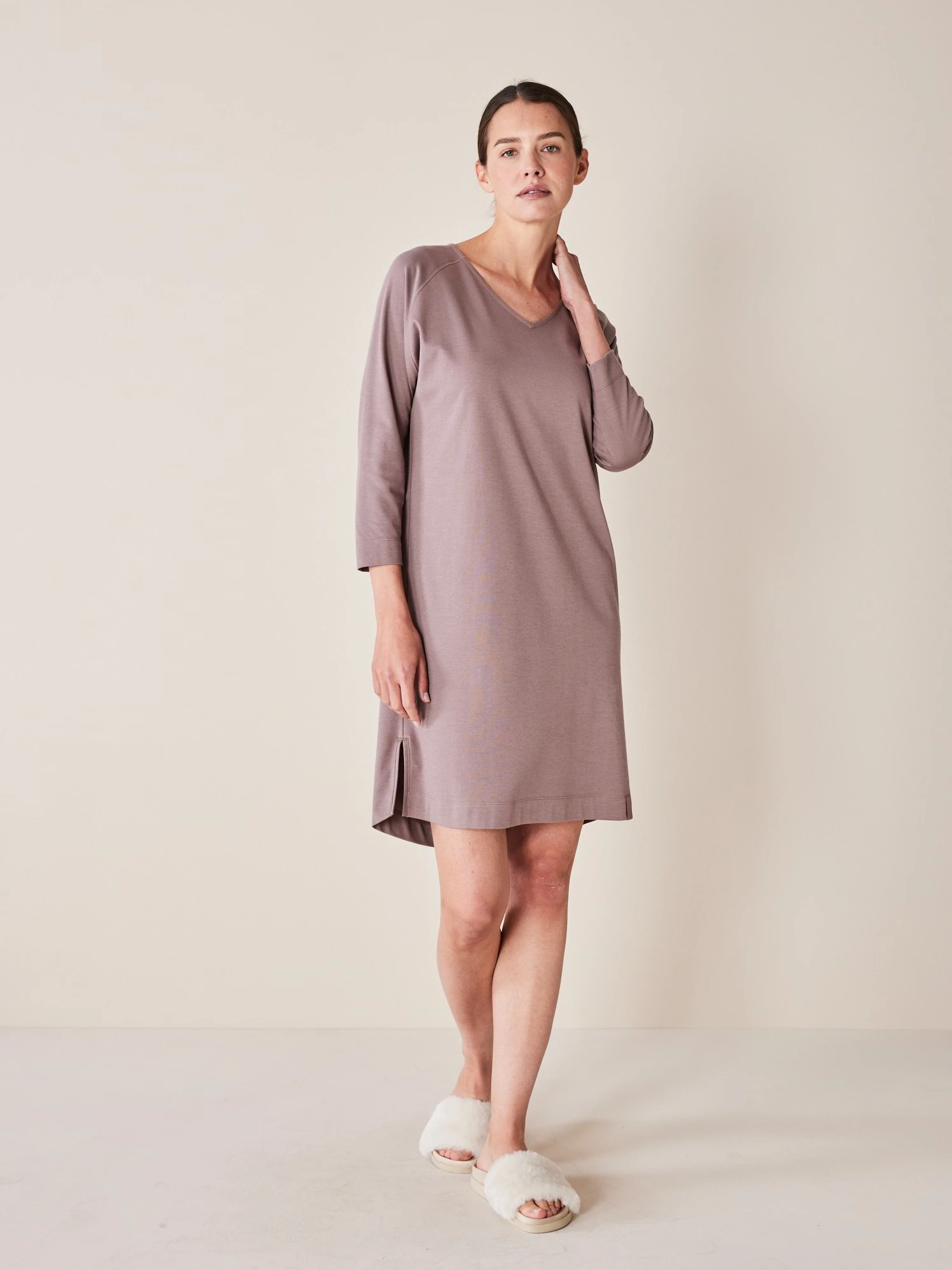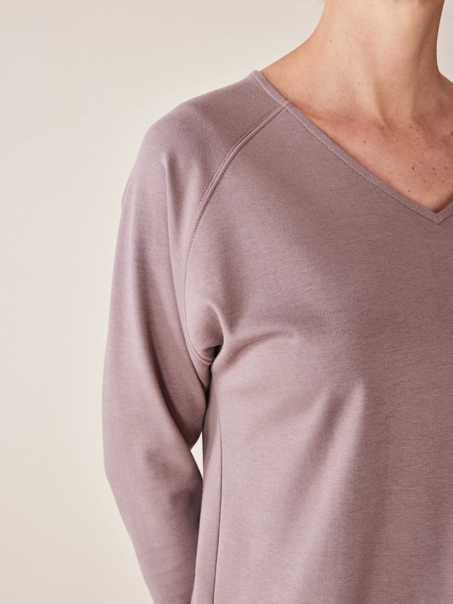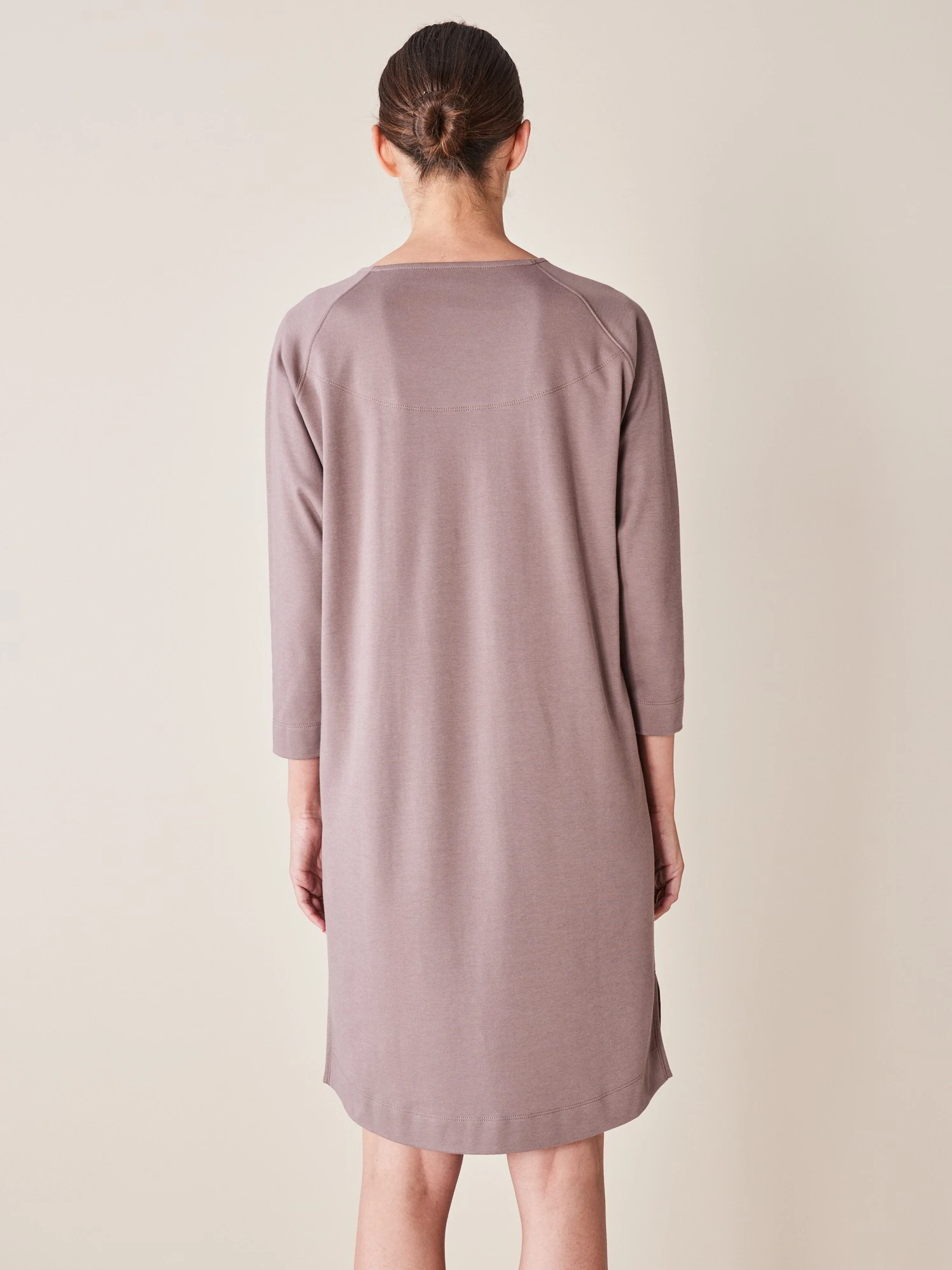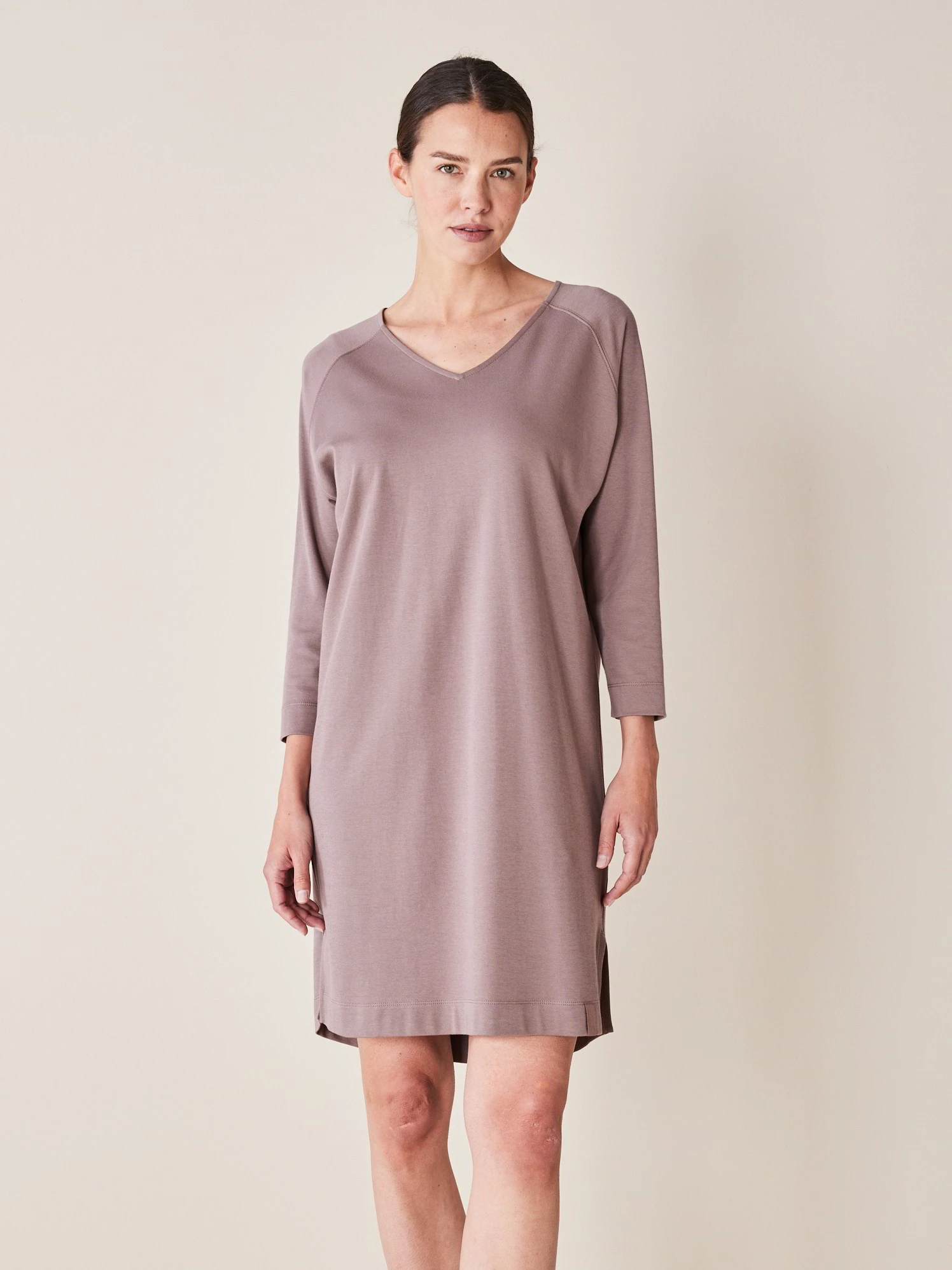 Das Modell aus feinem Baumwoll-Jersey überzeugt mit einer puristischen Optik sowie kleinen Details: V-Ausschnitt, Raglanärmel in 3/4-Länge und zwei Seitenschlitze am Saum.