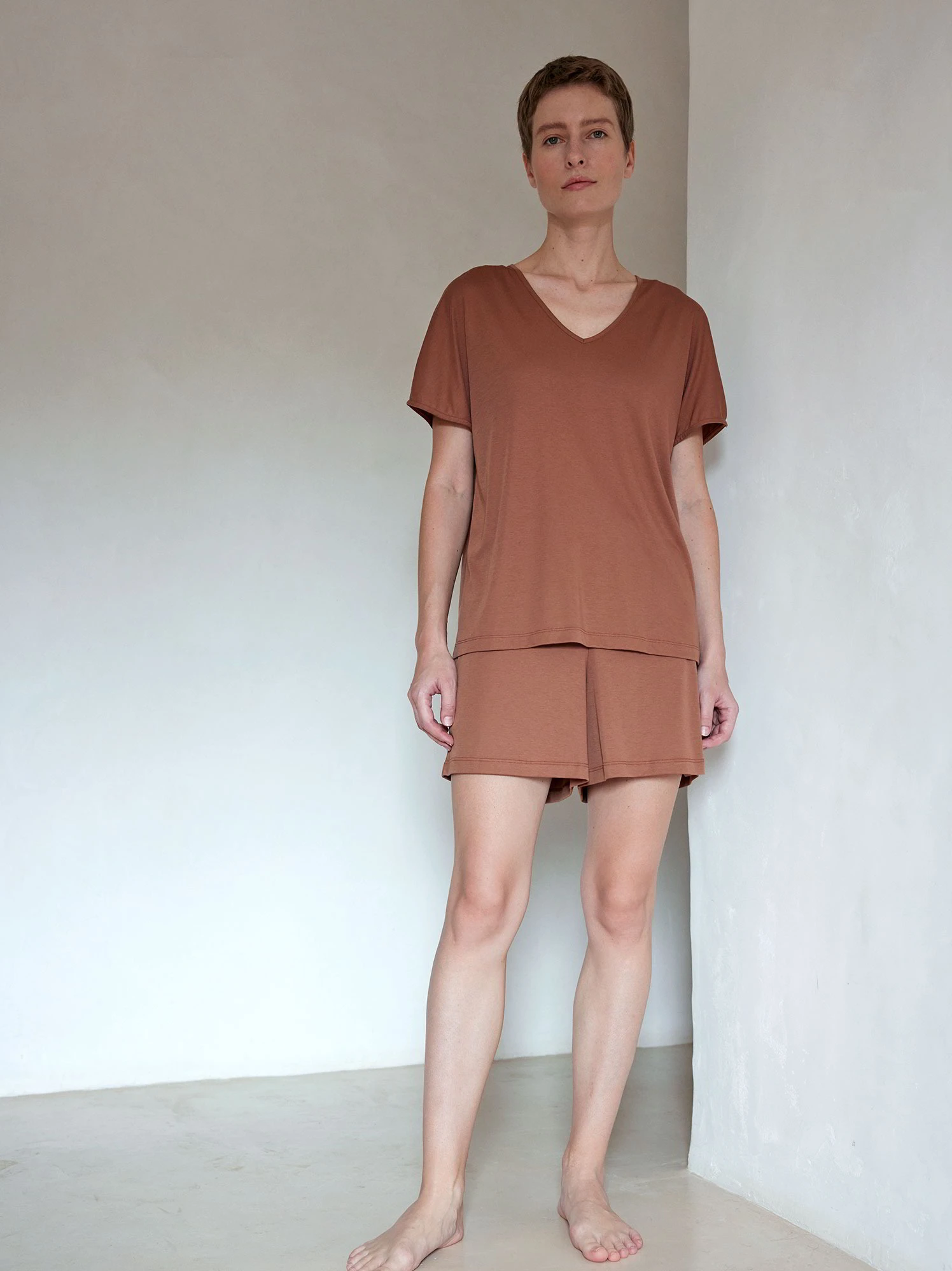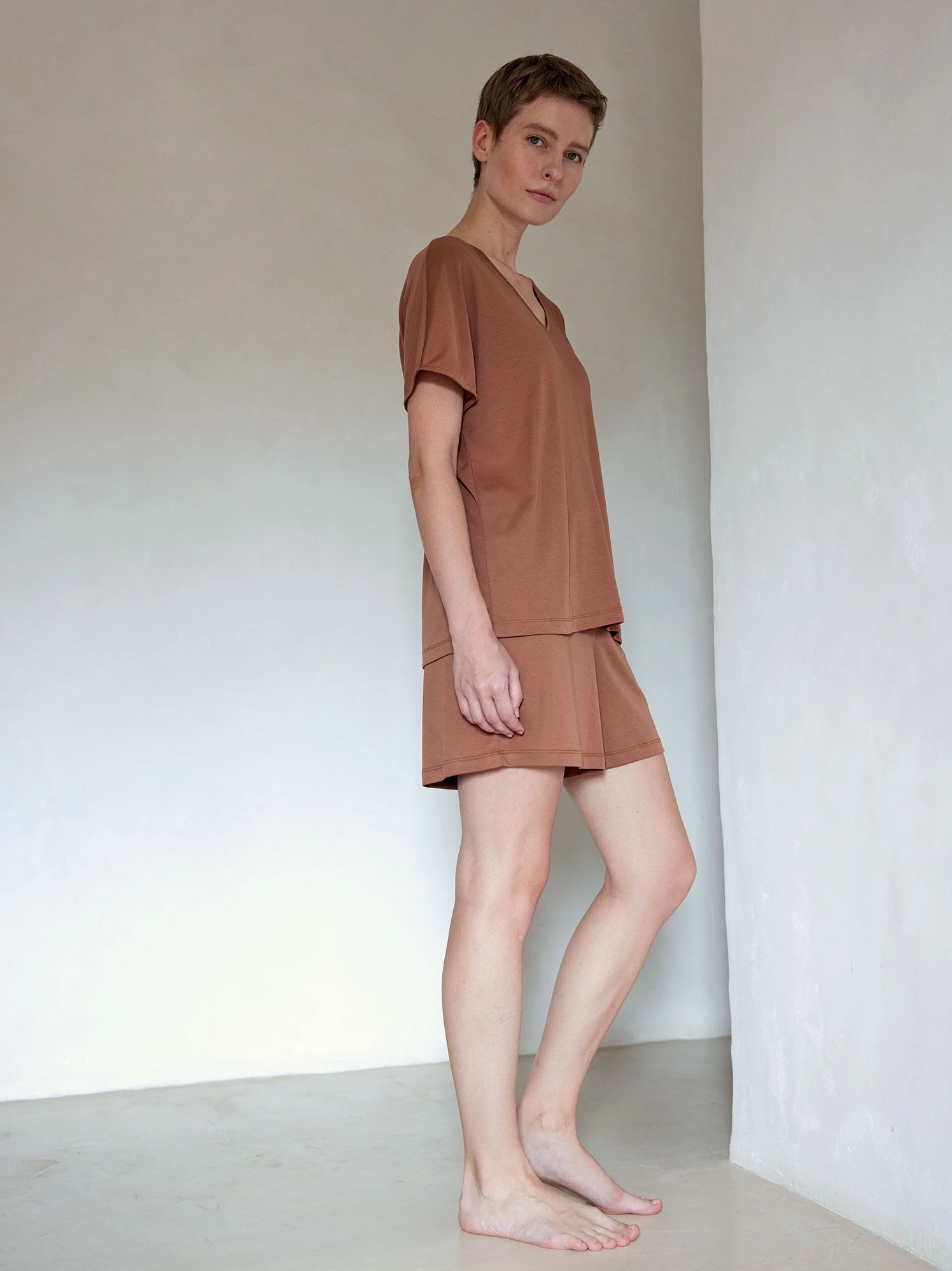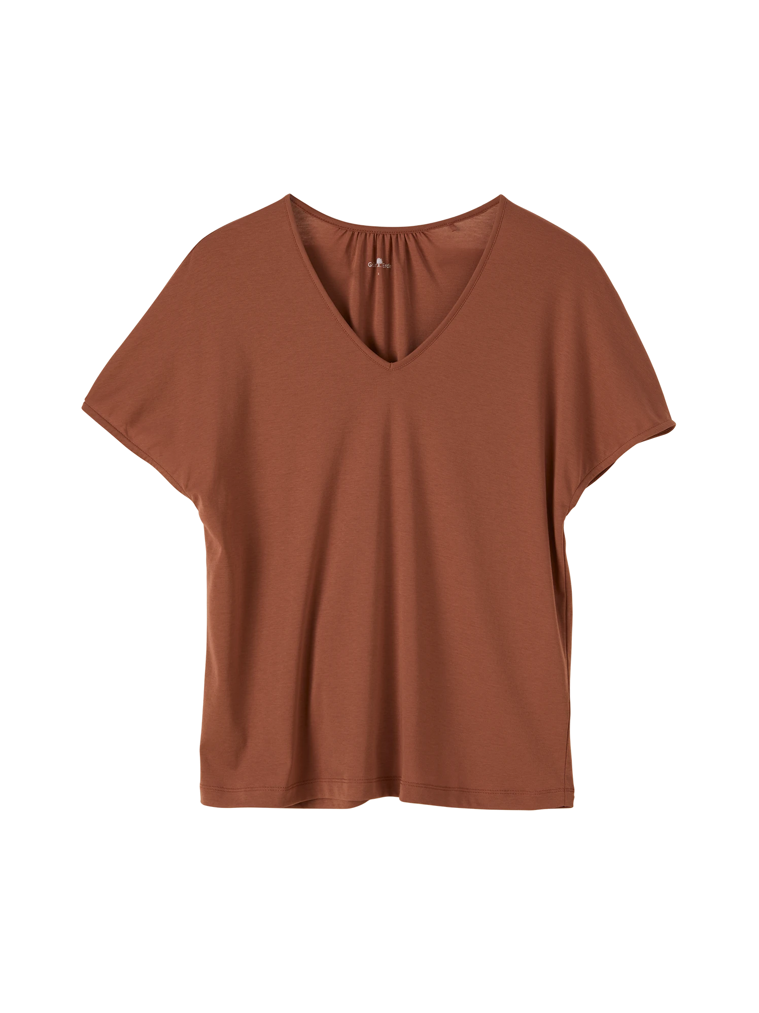 Locker geschnittenes Kurzarm-Schlafshirt aus fließender Jersey-Qualität. Die weiche Baumwolle umspielt sanft die Haut und sorgt für ein angenehmes Gefühl während der Nacht. Mit V-Ausschnitt, überschnittenen Schulterpartien und zarter Raffung auf der Rückseite.