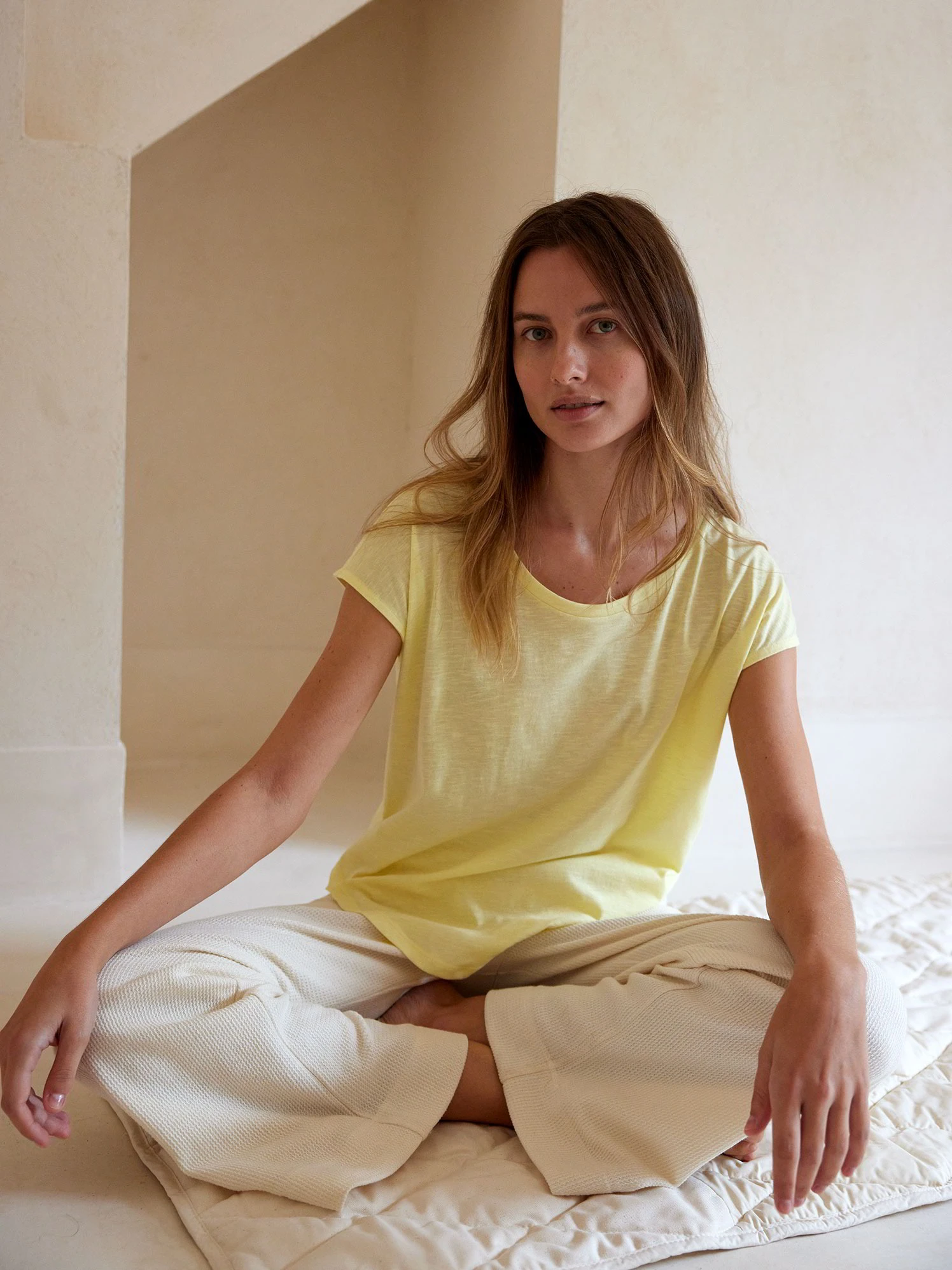 Zartes Dessin kombiniert mit einem besonderen Schnitt und einer hellen Farbe: Das Kurzarmshirt aus hautfreundlicher Baumwolle kbA überzeugt mit seiner Optik sowie dem angenehm-weichen Gefühl auf der Haut und sorgt für eine schöne Silhouette. Das sportive Modell mit der charakteristischen Flammé-Struktur hat einen Rundhalsausschnitt, überschnittene Schulterpartien sowie einem stark gerundeten Saum.