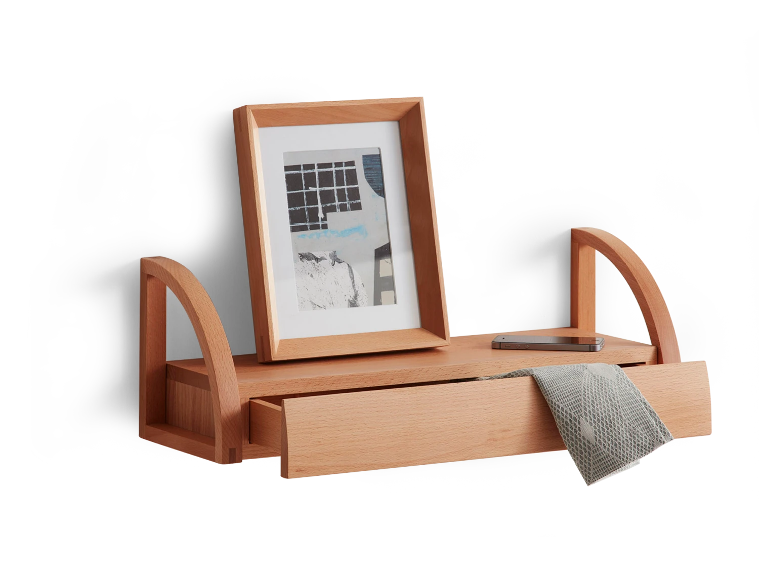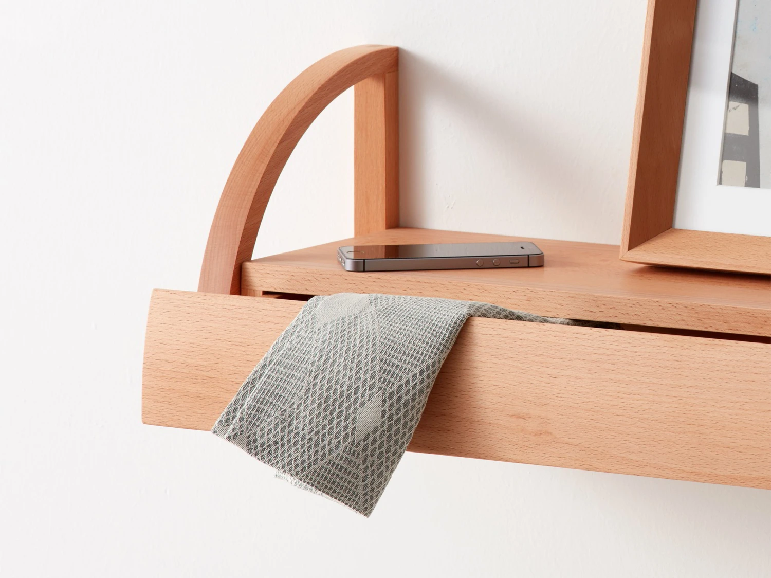 Ein ebenso elegantes wie funktionelles Wandregal für alle Wohnräume bis hin zur Garderobe, zum Ablegen und Abstellen, als Bücherregal. Das gewisse Etwas und stilprägende Element von Vela ist der aufwendig aus Holz gefräste Montagebügel in Form eines Viertelkreises – schnittig wie ein vom Wind geblähtes Segel (ital.: Vela).
