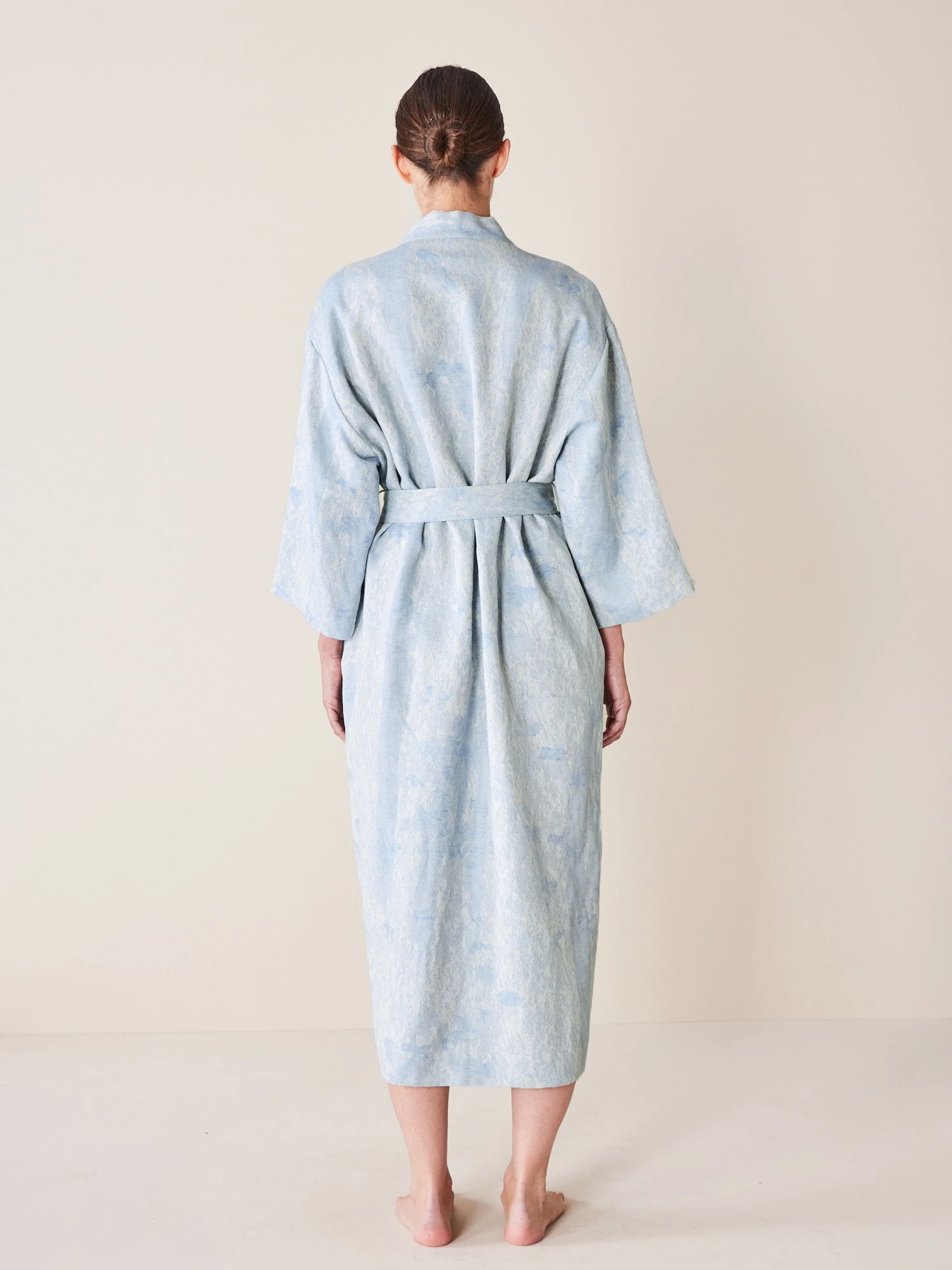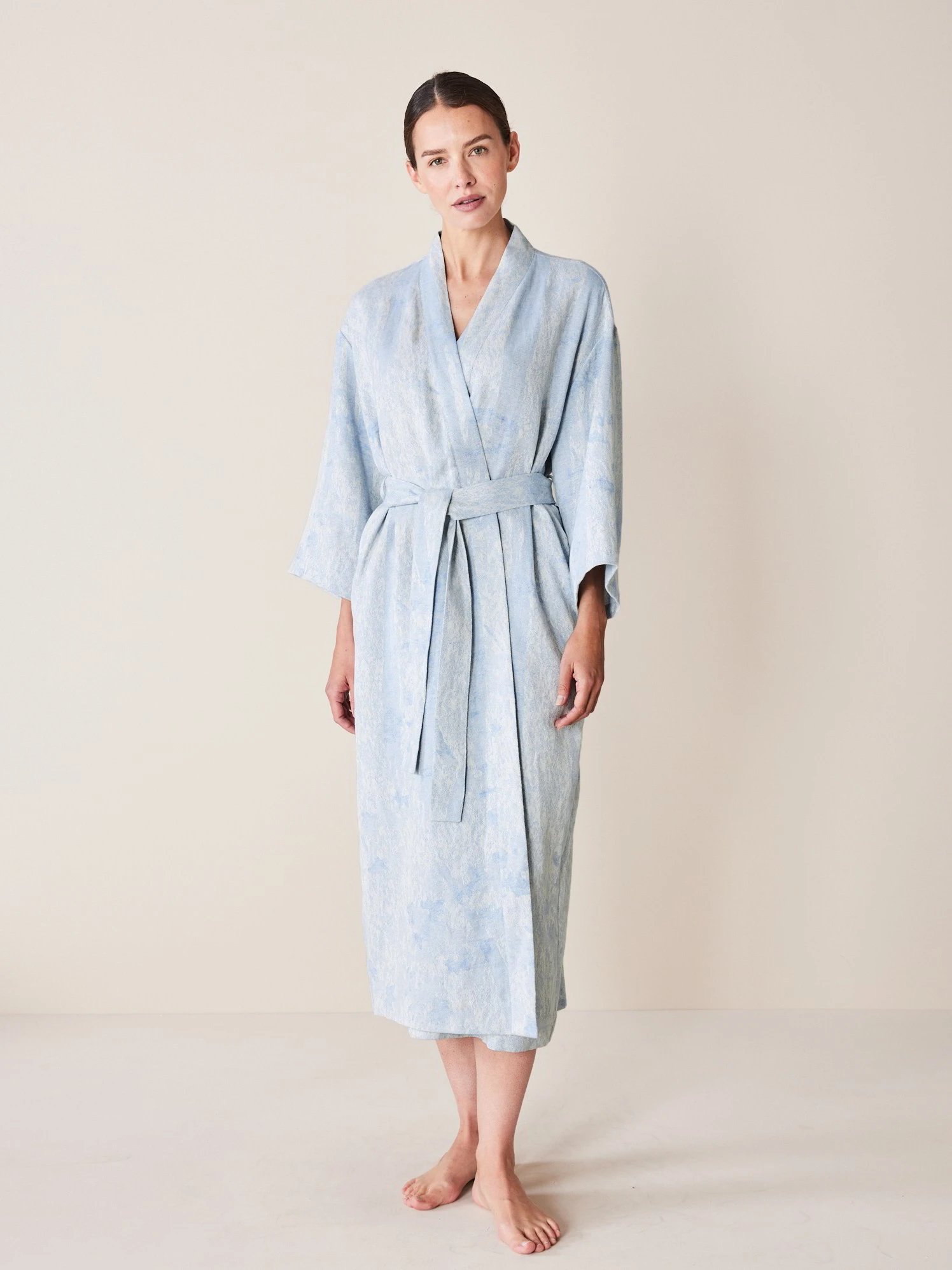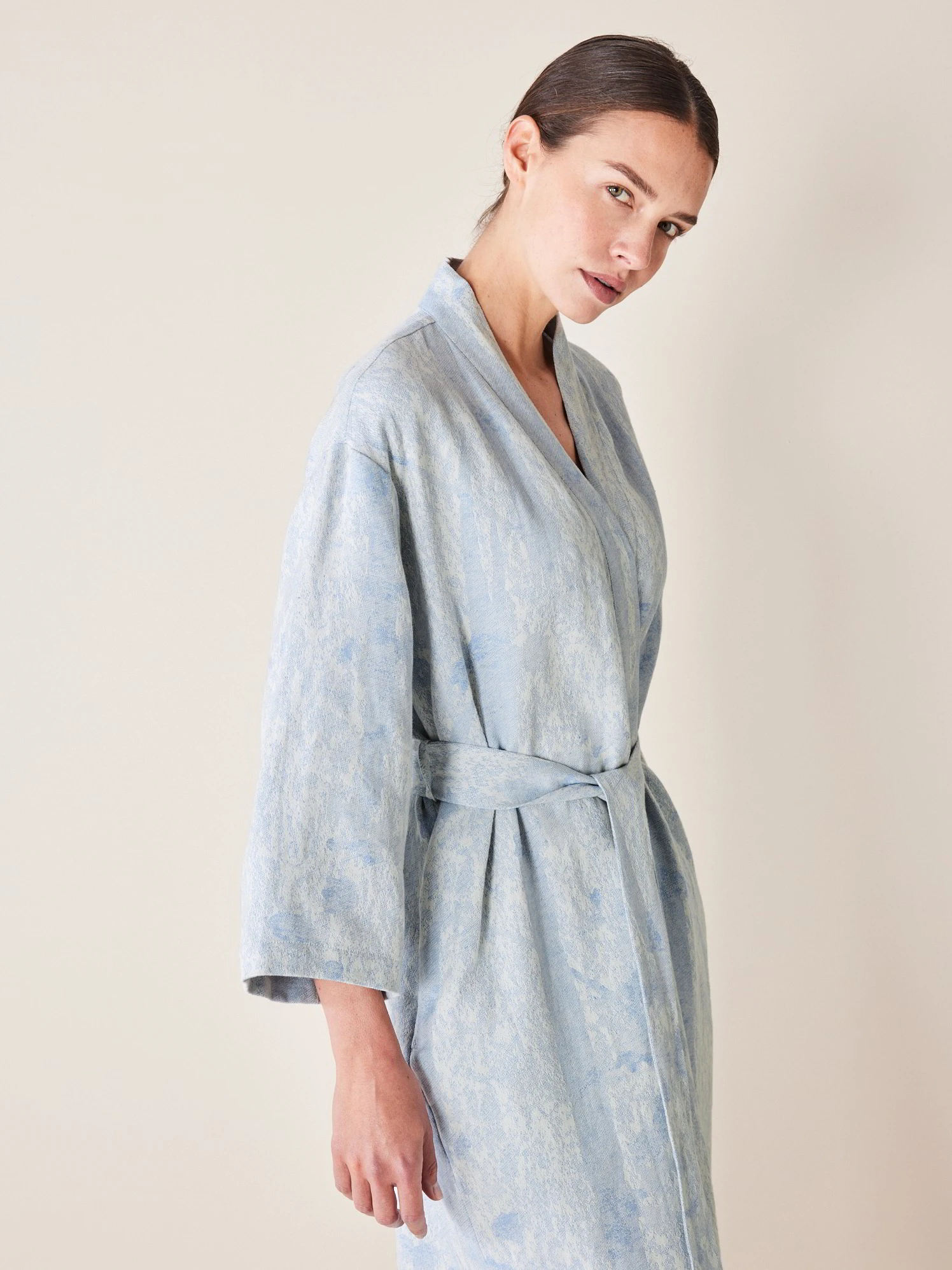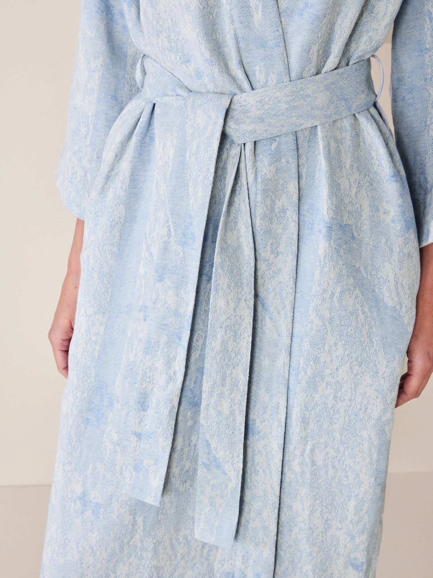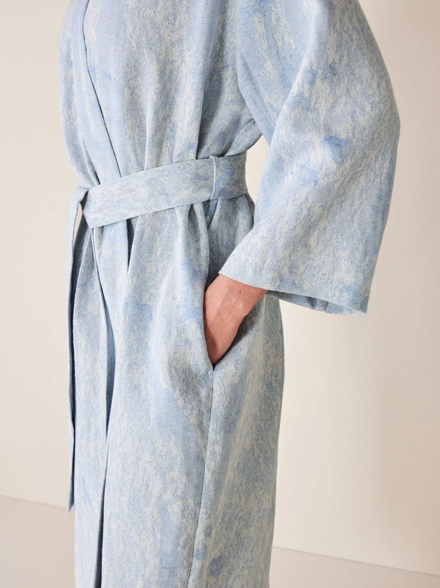 Dieser elegante Morgenmantel im Kimono-Schnitt ist ein edler Begleiter für den Start in den Tag. Dank der Kombination aus hochwertigem Leinen und wertvoller Baumwolle entsteht ein hautfreundliches und hochwertiges Lieblingsstück. Das besonders feine Jacquard-Gewebe wird mit einem Kimono-Schnitt und liebevoll durchdachten Details abgerundet – wie 3/4-Ärmel, zwei seitliche Eingriffstaschen und einem Bindegürtel.