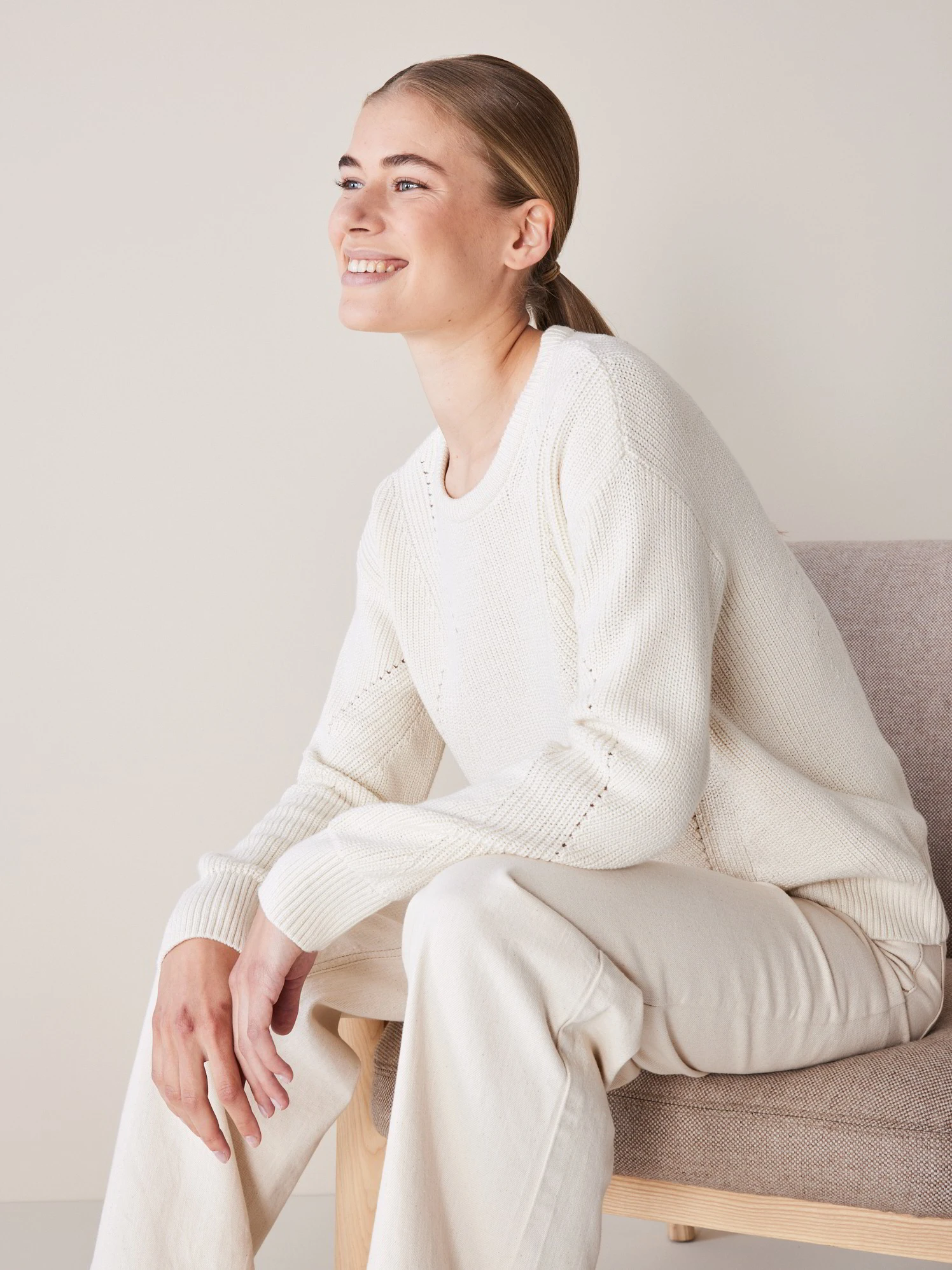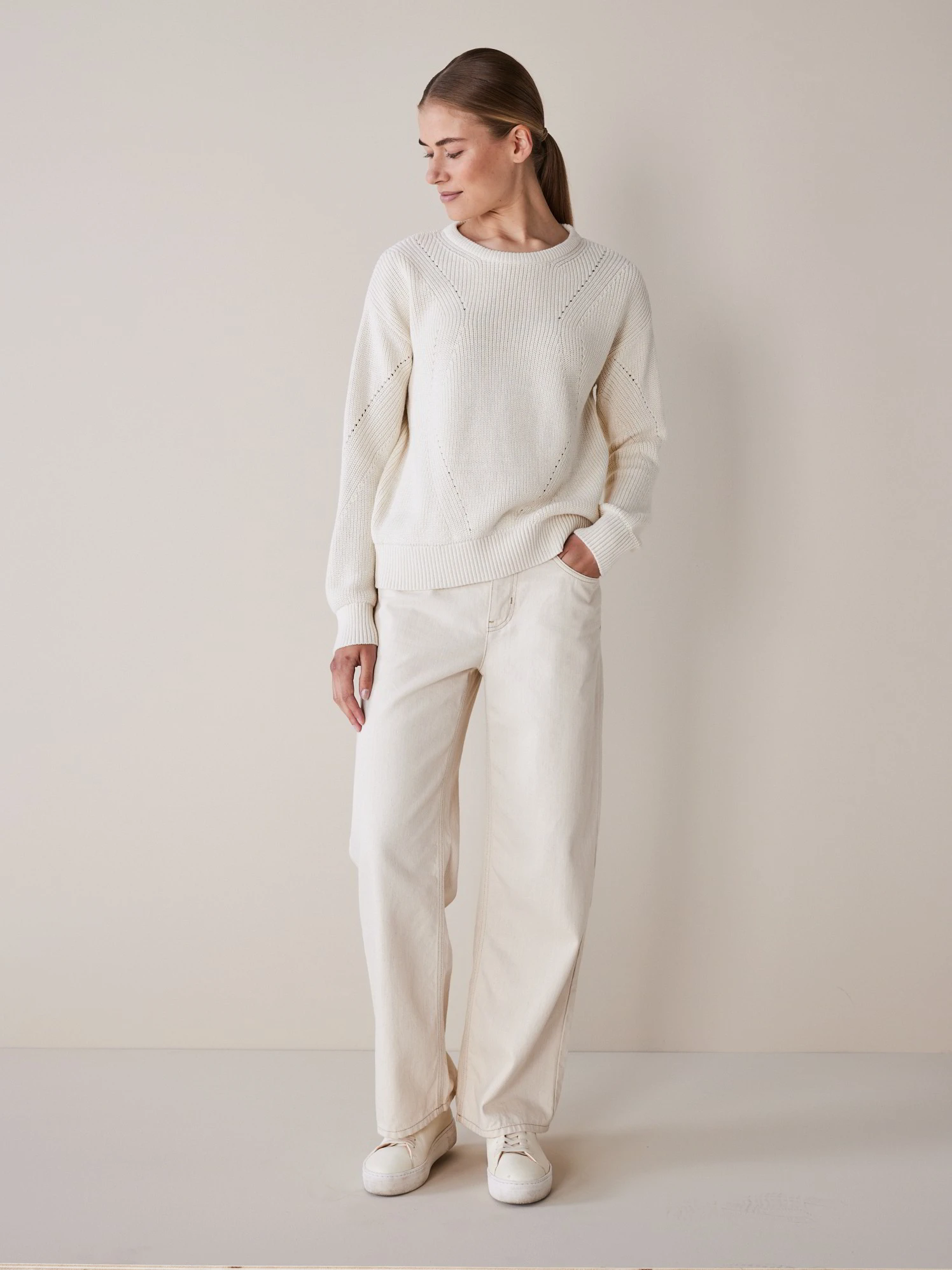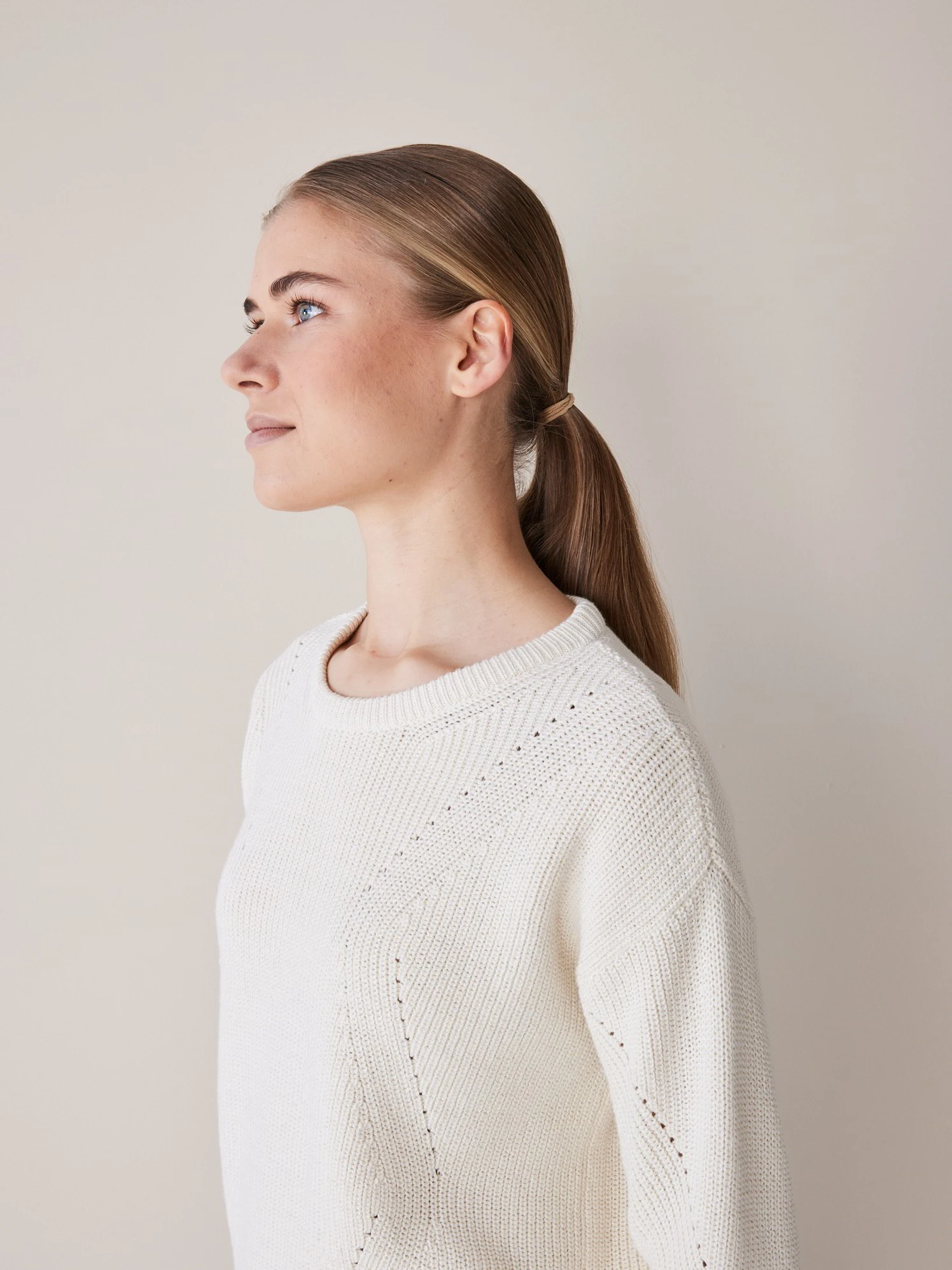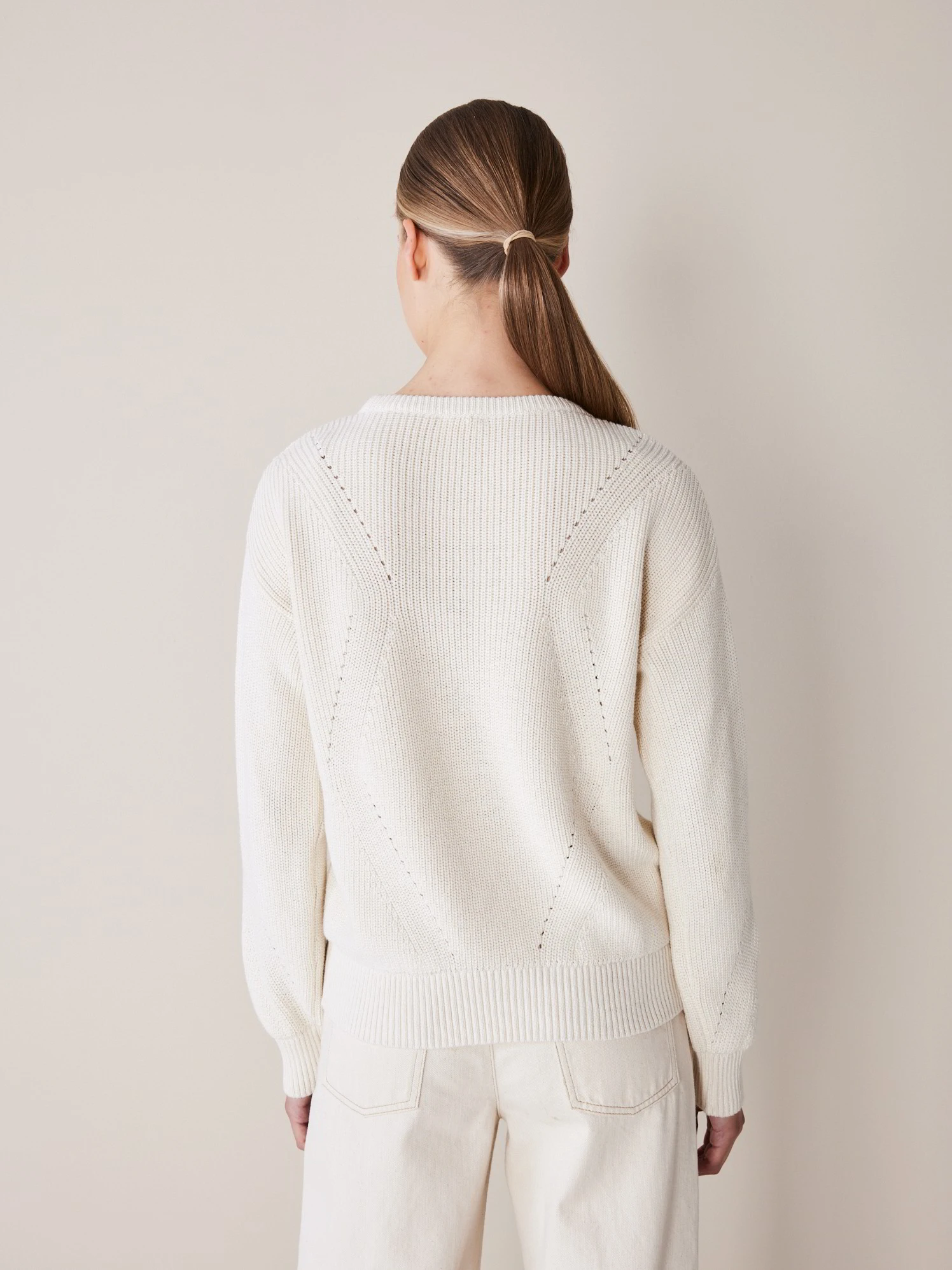Feminin und puristisch-anmutend: Der hochwertige und sehr weiche Strickpullover wird aus hautfreundlicher Pima-Baumwolle kbA bei unserem Partnerbetrieb sorgfältig und mit viel Liebe zum Detail in Patentstrick gefertigt.