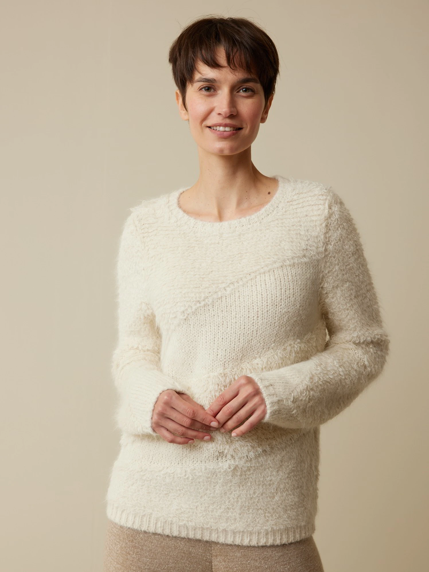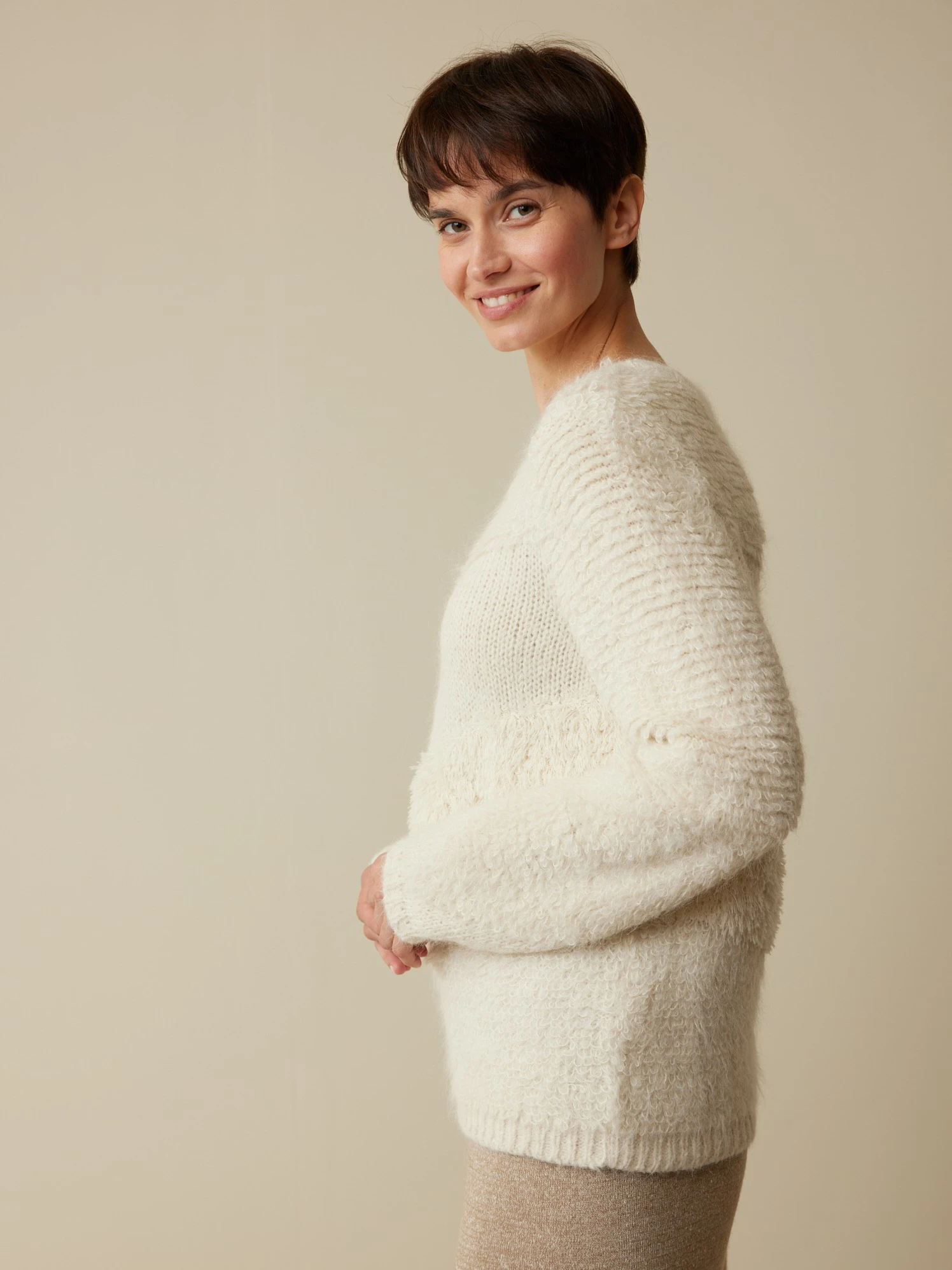 Ein besonderes Highlight: unser Strickpullover aus hochwertiger Alpakawolle. Dank der Kombination unterschiedlicher Garnarten, in asymmetrischer Anordnung, entsteht ein modernes Erscheinungsbild. Die haarige Struktur des Garns schenken dem zeitlosen Modell einen unverwechselbaren Look. Besonders wird der Pullover durch die flauschige Haptik mit Rippbündchen an Hals-, Ärmel- und Saumabschluss.
