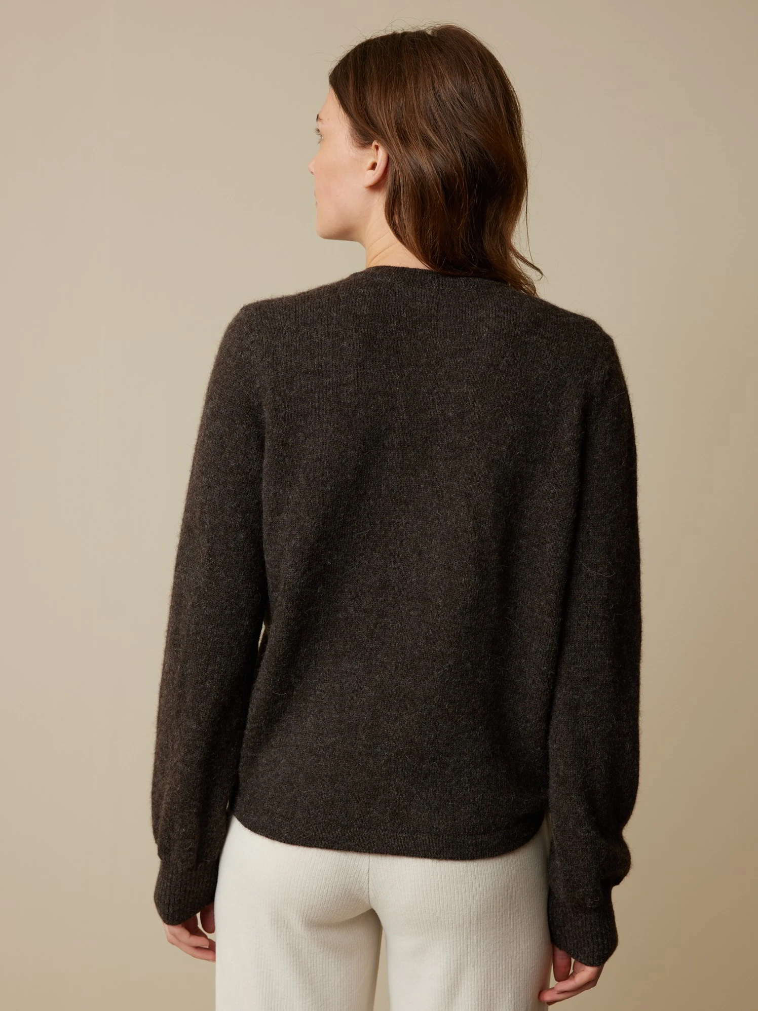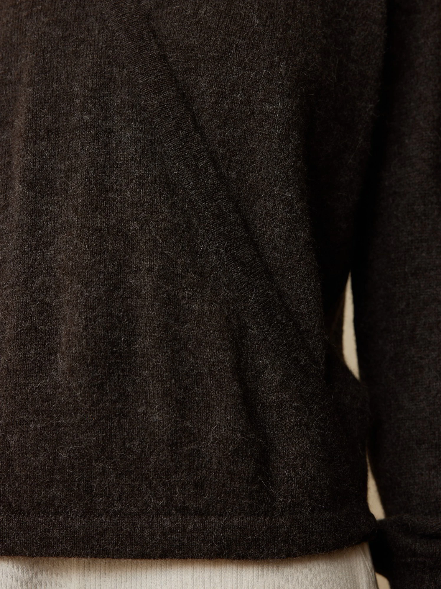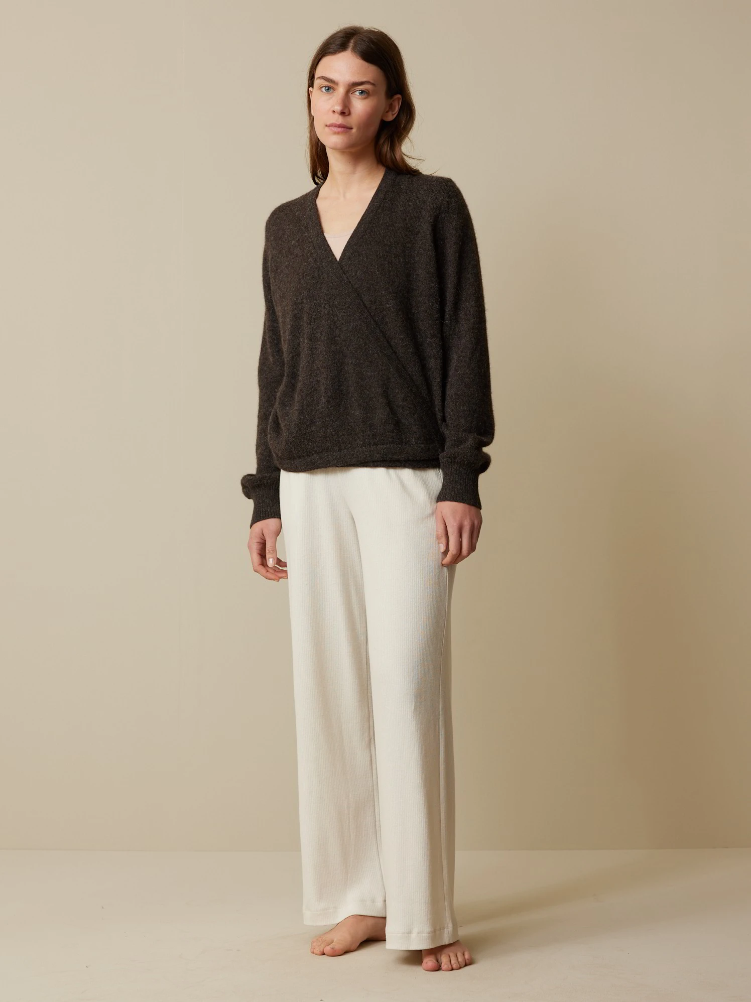 Ein wahrer Hingucker: ungefärbter Strickpullover in Wickeloptik. Das Modell kann als Pullover im Wickel oder als elegante Strickjacke offen getragen werden. Der weiche Griff der Alpakawolle unterstreicht den gemütlichen Look. Mit Bündchen am Ärmelsaum.