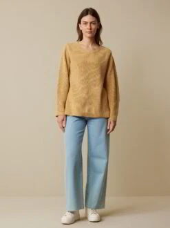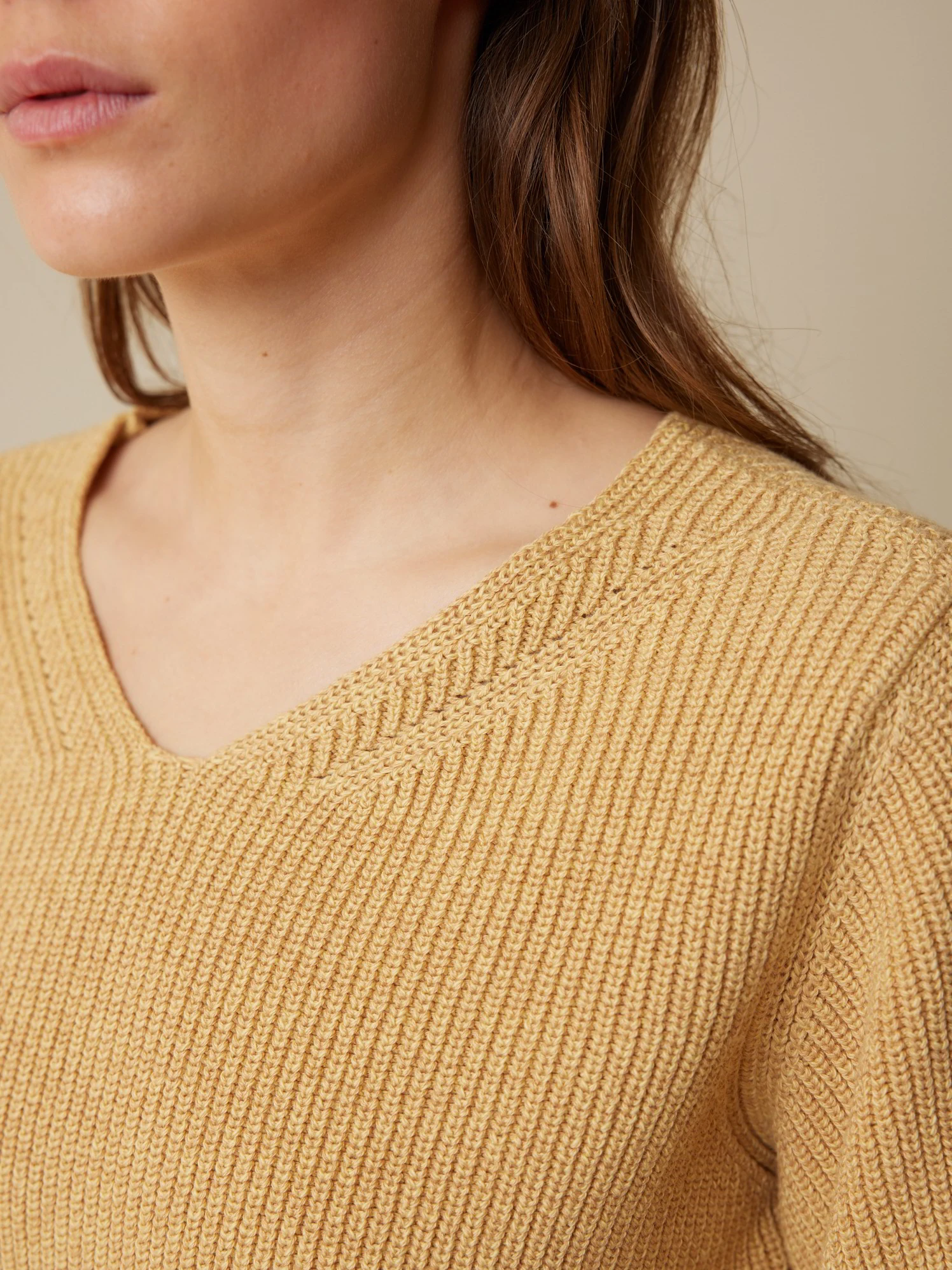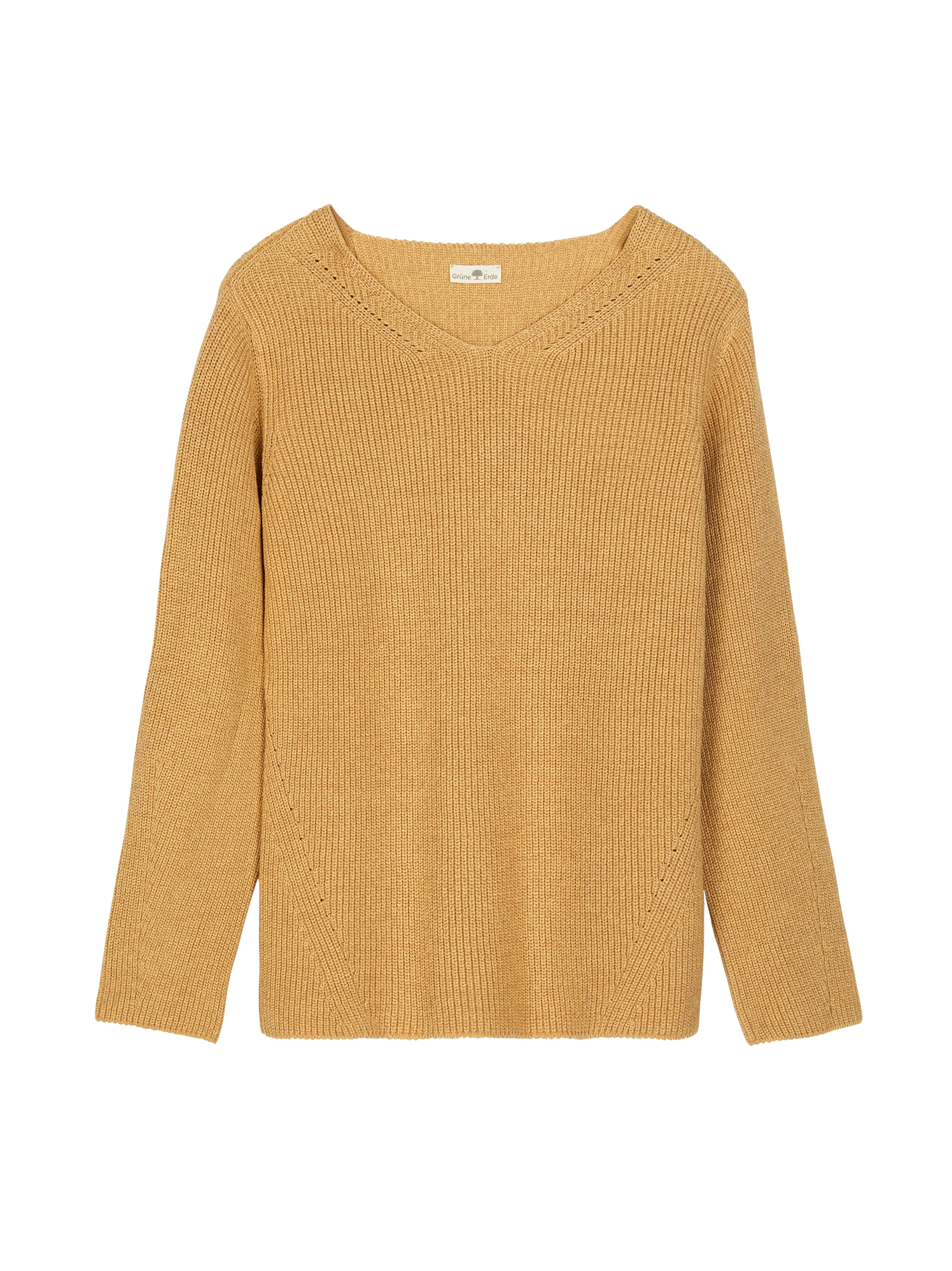 Anschmiegsam-weicher Pullover aus weicher Baumwolle und wärmender Wolle. Das Modell trägt sich angenehm, hat eine bequeme Passform und ist ein idealer Begleiter im Alltag. Das besondere Mouliné-Strick-Dessin entlang des V-Ausschnittes sowie auf der Vorderseite und entlang der langen Ärmeln runden den geraden Pullover zart ab.