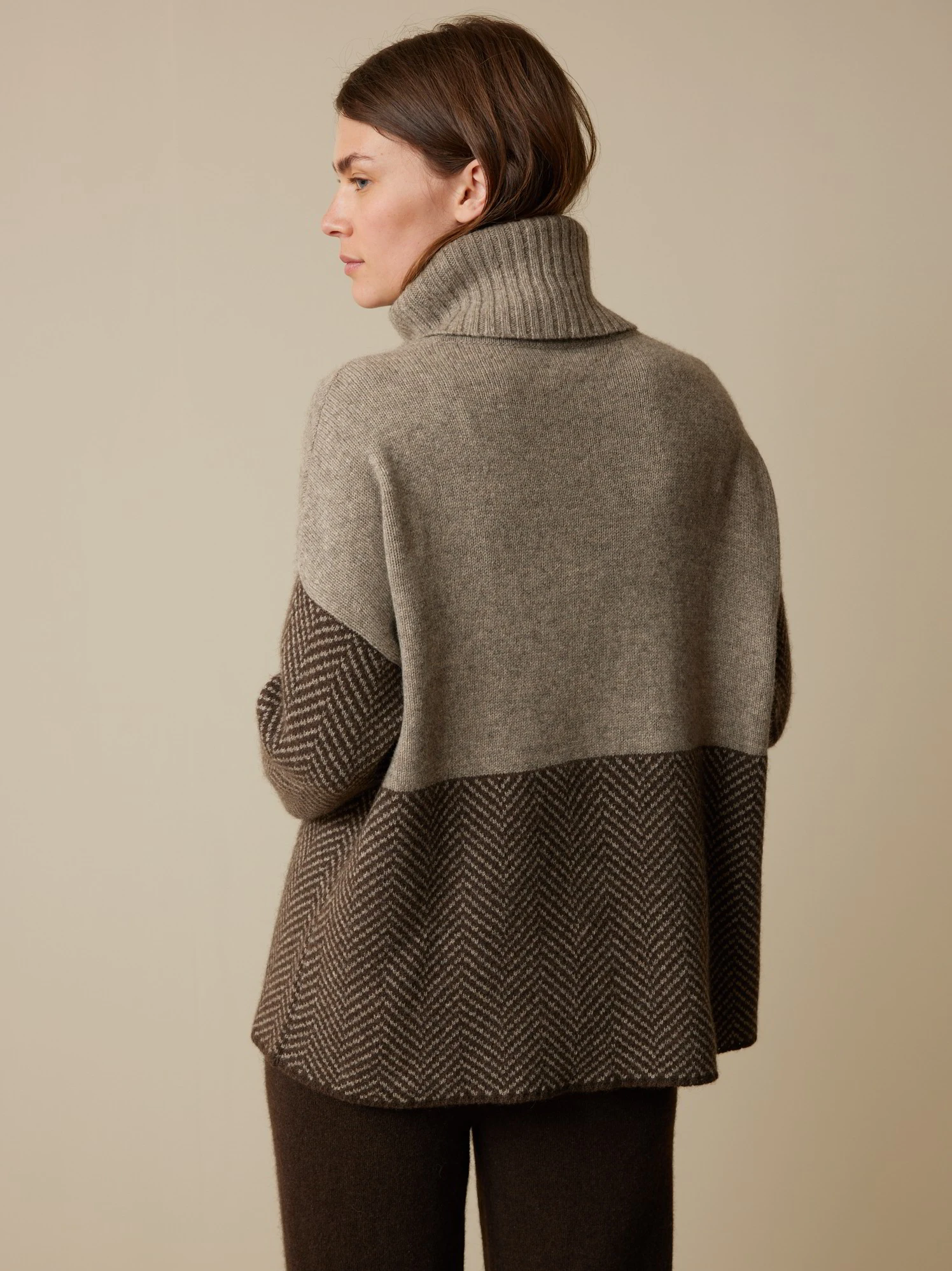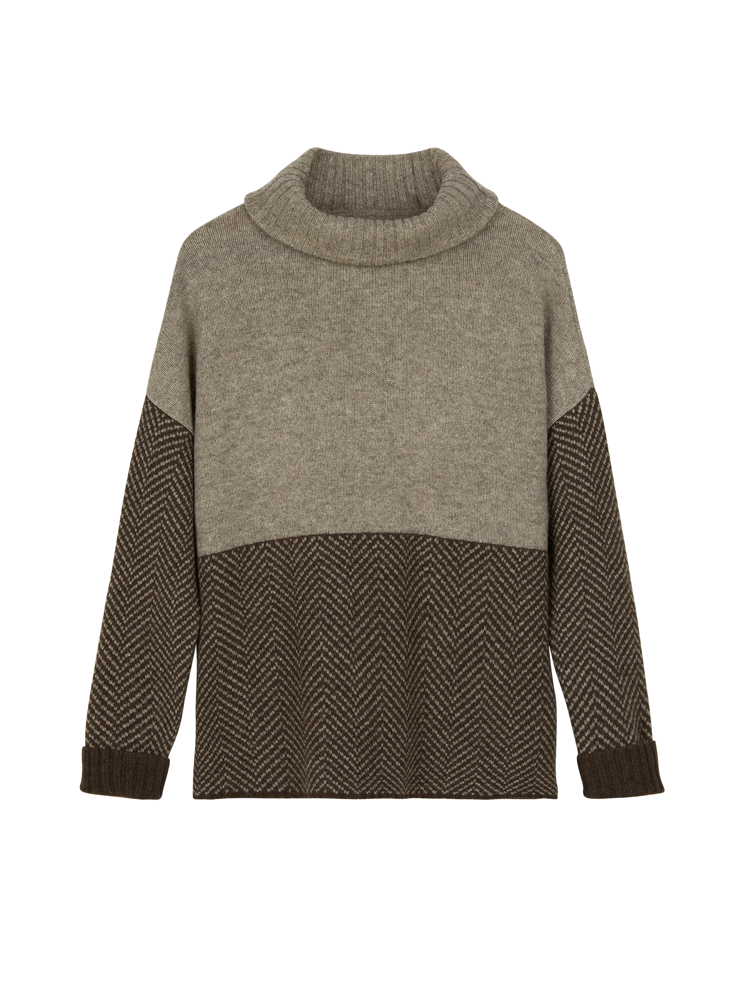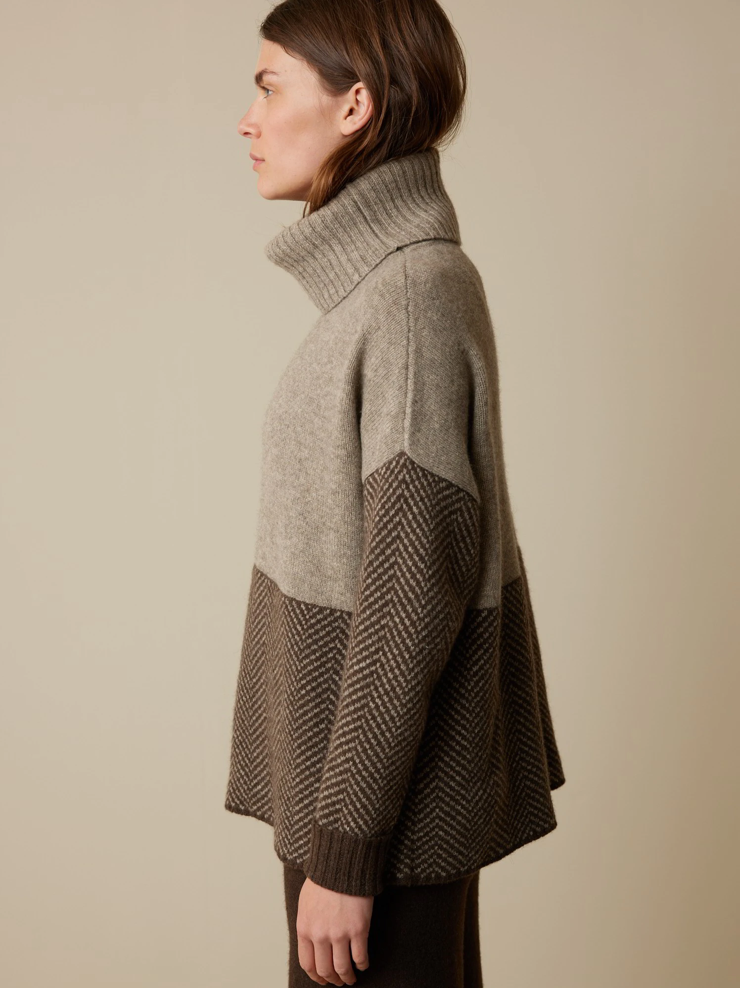 Ungefärbter Jacquard-Strickpullover mit feinster Struktur und natürlichem Colorblock. In den Vordergrund rückt die breite Fischgrat-Dessinierung am unteren Rumpf sowie an den langen Ärmeln. Abgerundet mit hohem Rollkragen, überschnittenen Schulterpartien sowie 2×2-Rippbündchen am Ärmelsaum und am Rollkragen. Die wertvolle Yakhaar-Qualität ist weich, anschmiegsam und angenehm auf der Haut.