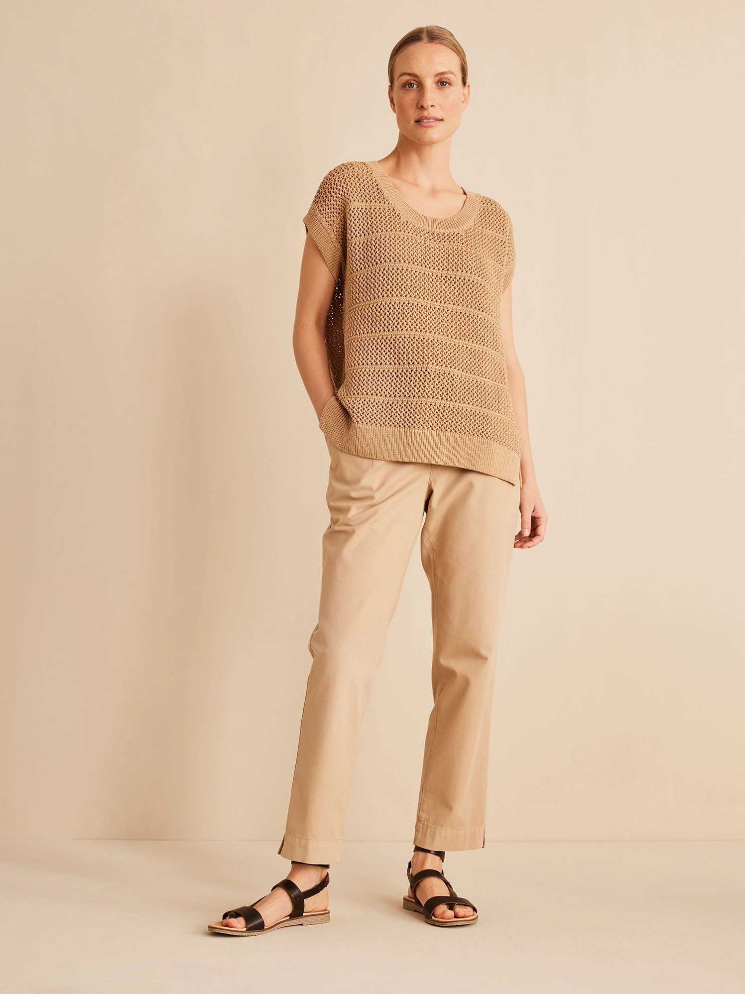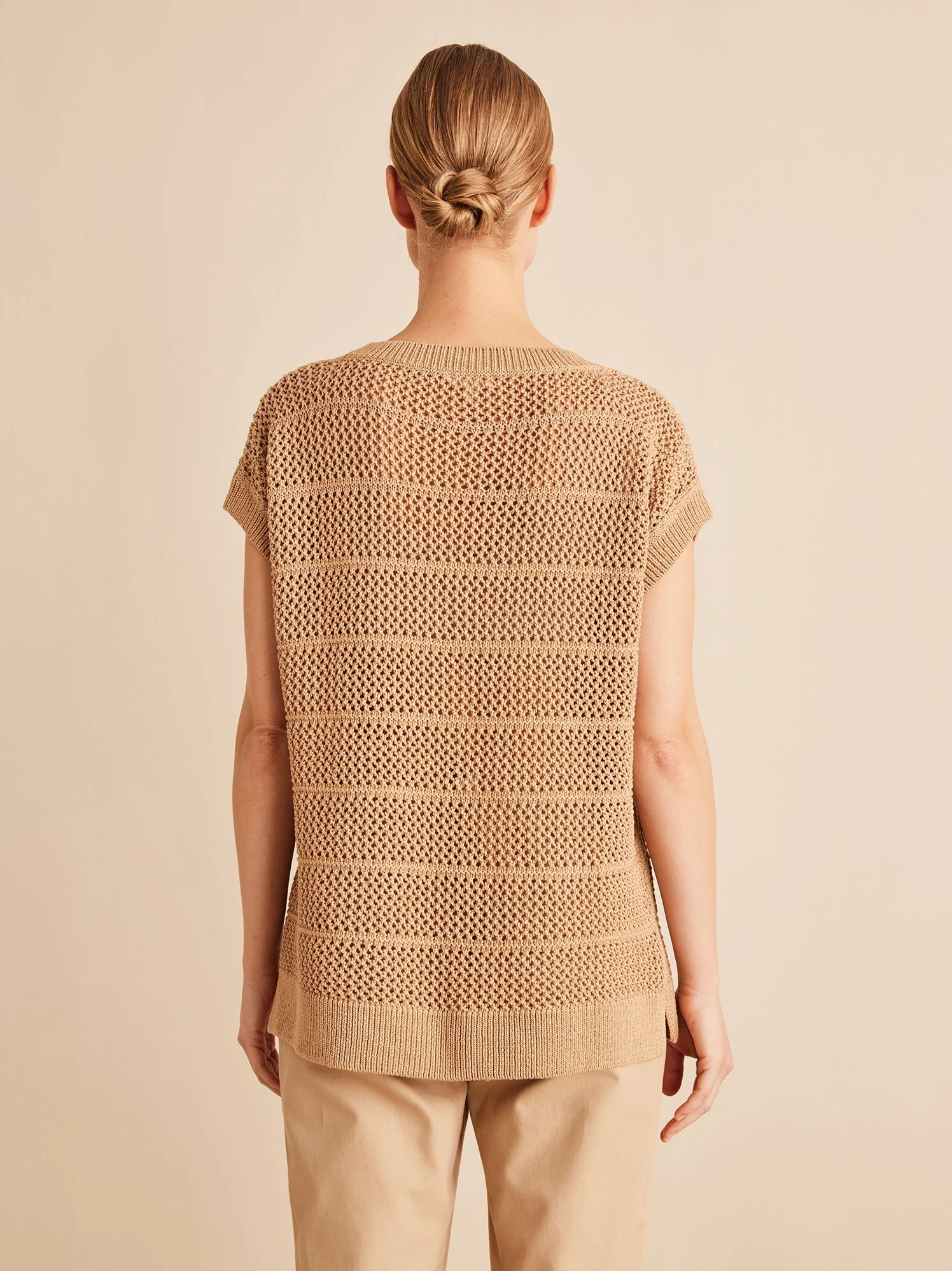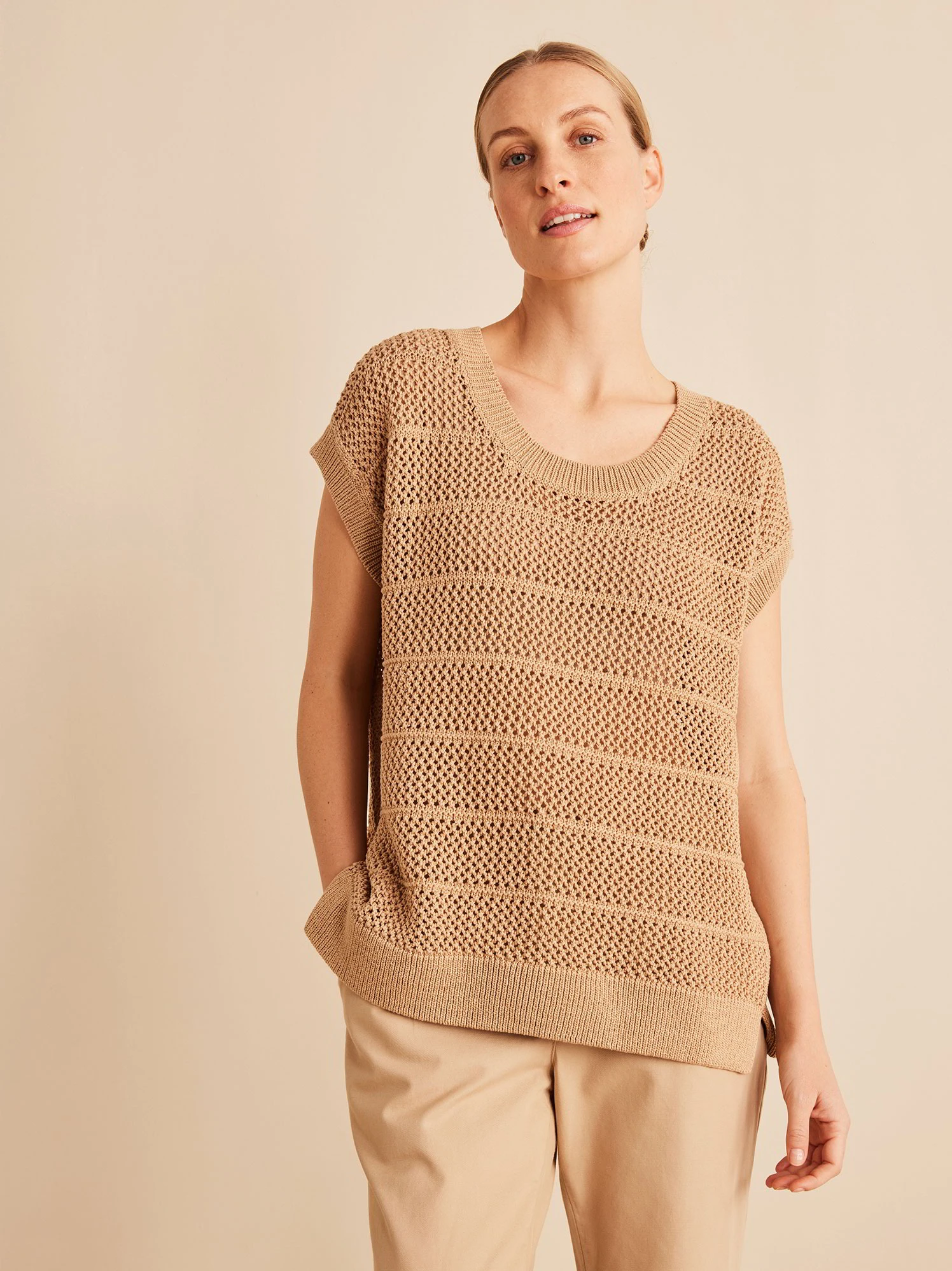 Dank des hochwertigen Naturmaterials entsteht ein besonders hochwertiges Tragegefühl. Der ärmellose Pullover mit Lochmuster hat einen tiefen Rundhalsausschnitt und breite Rippbündchen an Hals-, Saum- sowie Ärmelabschluss.