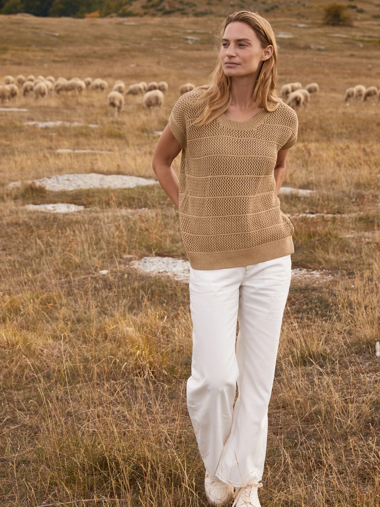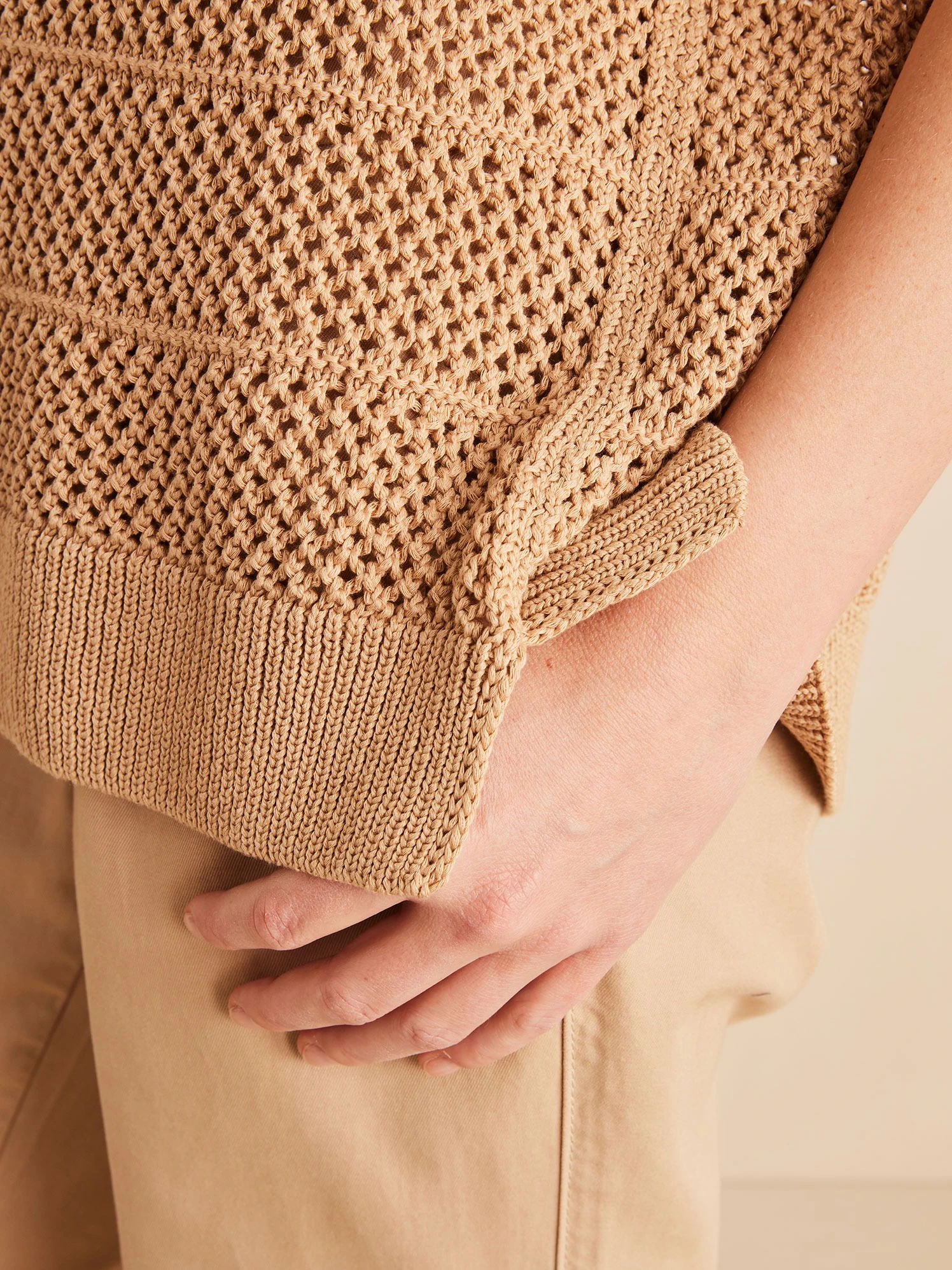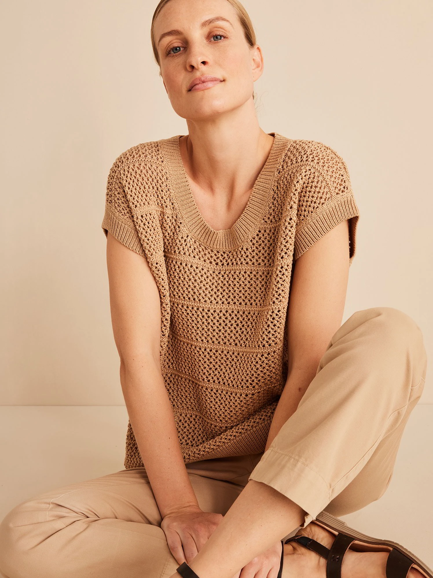 Dank des hochwertigen Naturmaterials entsteht ein besonders hochwertiges Tragegefühl. Der ärmellose Pullover mit Lochmuster hat einen tiefen Rundhalsausschnitt und breite Rippbündchen an Hals-, Saum- sowie Ärmelabschluss.