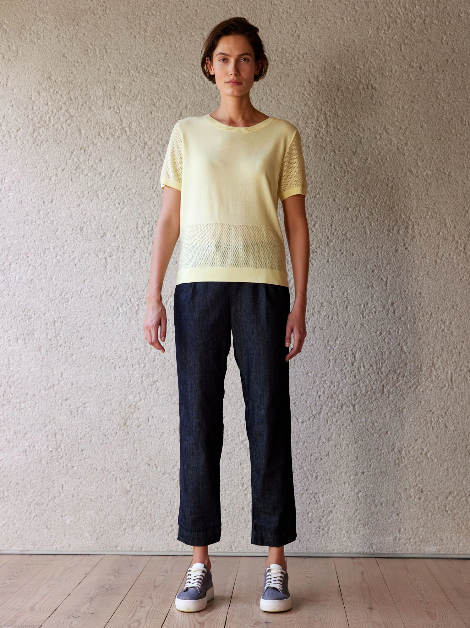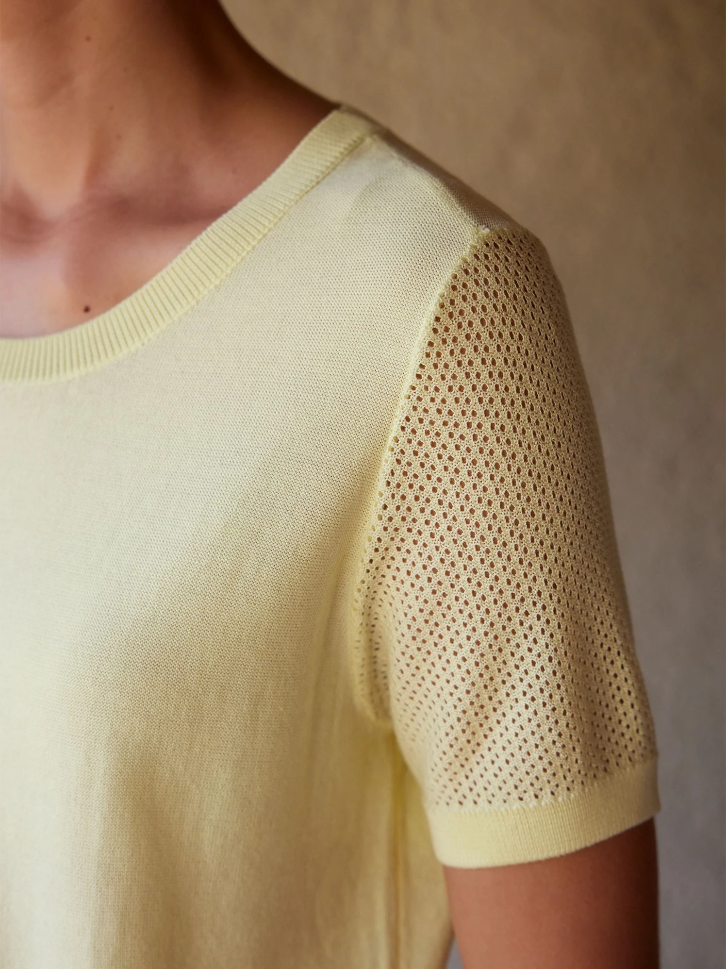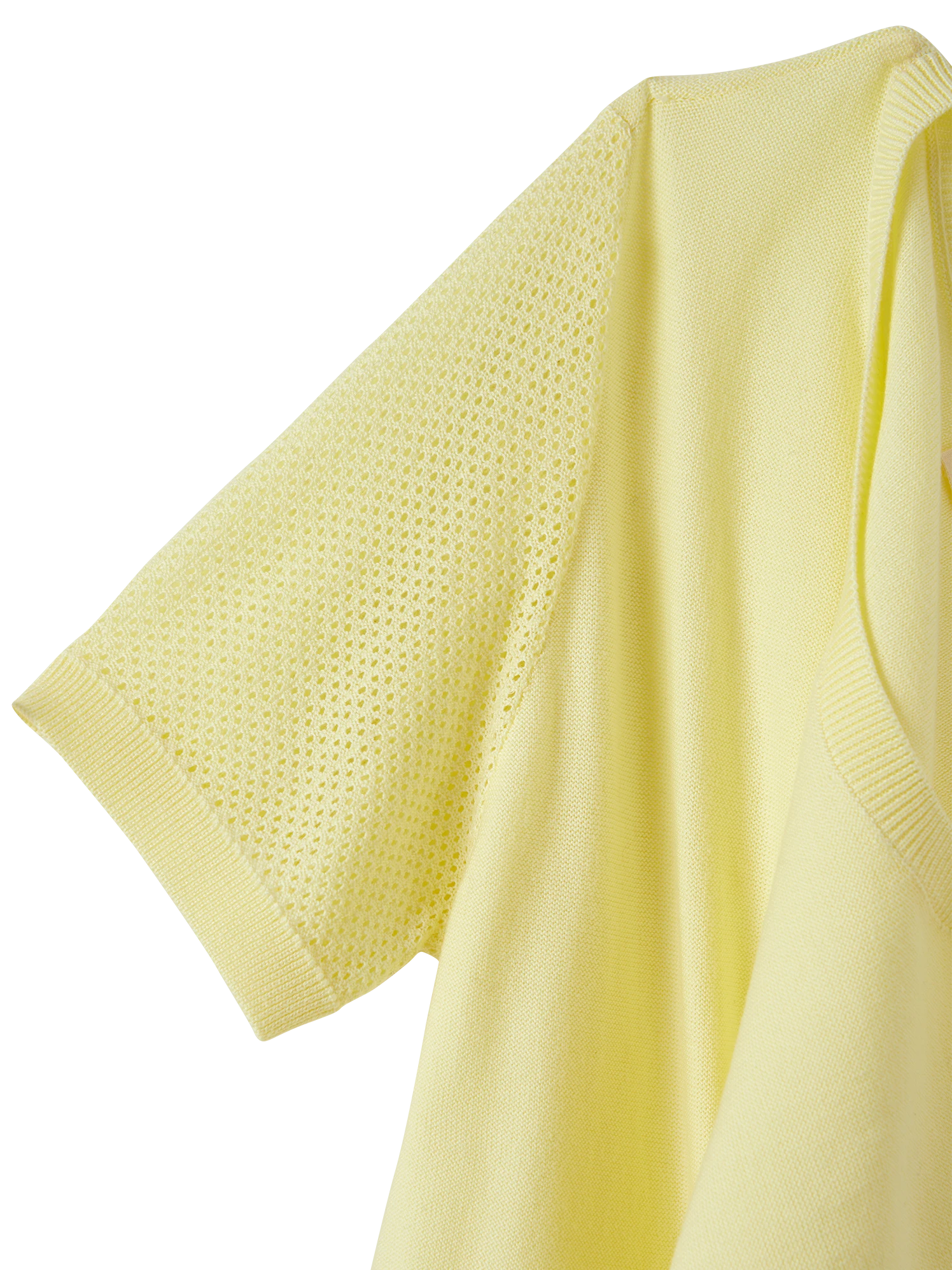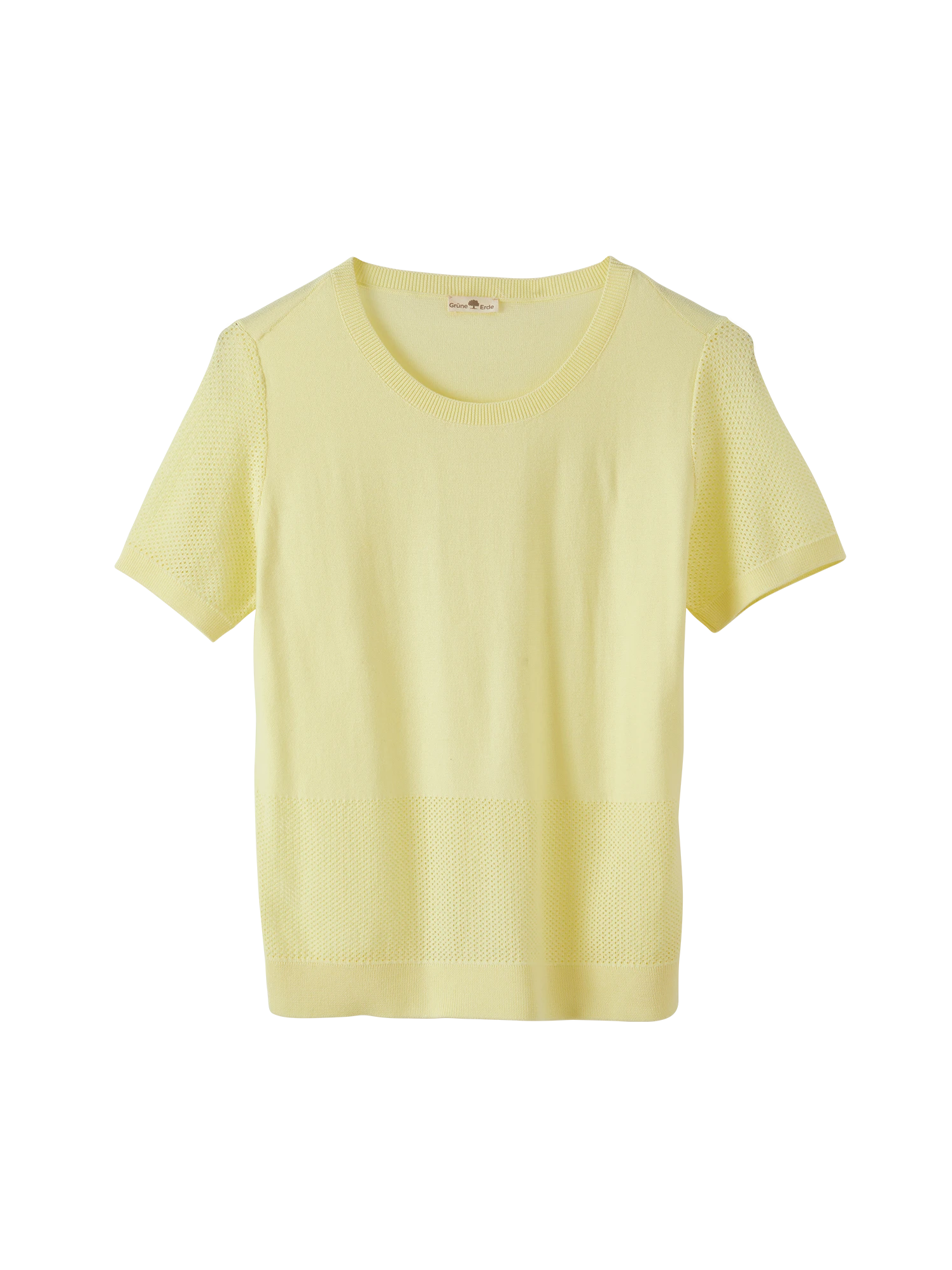 Dieser angenehm-weiche Strickpullover besticht mit seiner besonderen Optik: Die kurzen Ärmel sowie der untere Bereich des Modells entstehen aus hochwertigem Ajour-Lochstrick und verleihen dem Kleidungsstück das gewisse Etwas. Der Pullover aus weicher Baumwolle kbA hat einen Rundhalsausschnitt, kurze Ärmel und Seitenschlitze am Saum. Das Modell ist hinten länger geschnitten. Abgerundet wird der Pullover mit Rippbündchen am Halsausschnitt, an den Ärmelabschlüssen sowie am Saum.