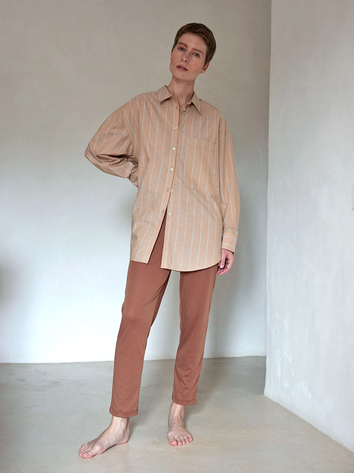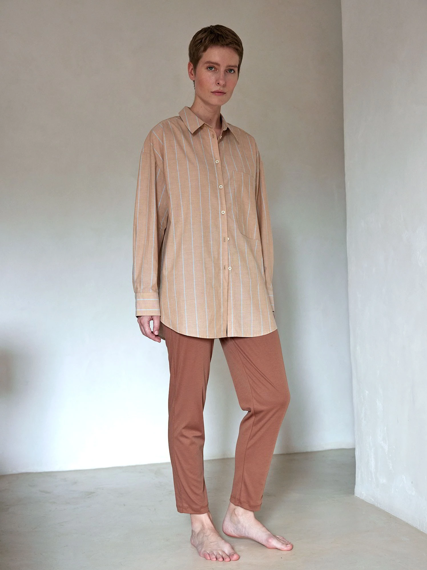 Dieses sehr feine Pyjamahemd aus hochwertiger Baumwolle kbA überzeugt mit einem besonders weichen Griff. Das gemütliche Modell hat eine legere Passform, einen Kragen und eine durchgehende Knopfleiste sowie eine Brusttasche auf der Vorderseite. Das Hemd mit der zarten Streifendessinierung wird mit einer Passe und einer eingelegten Falte auf der Rückseite sowie einem abgerundeten Saum komplementiert.