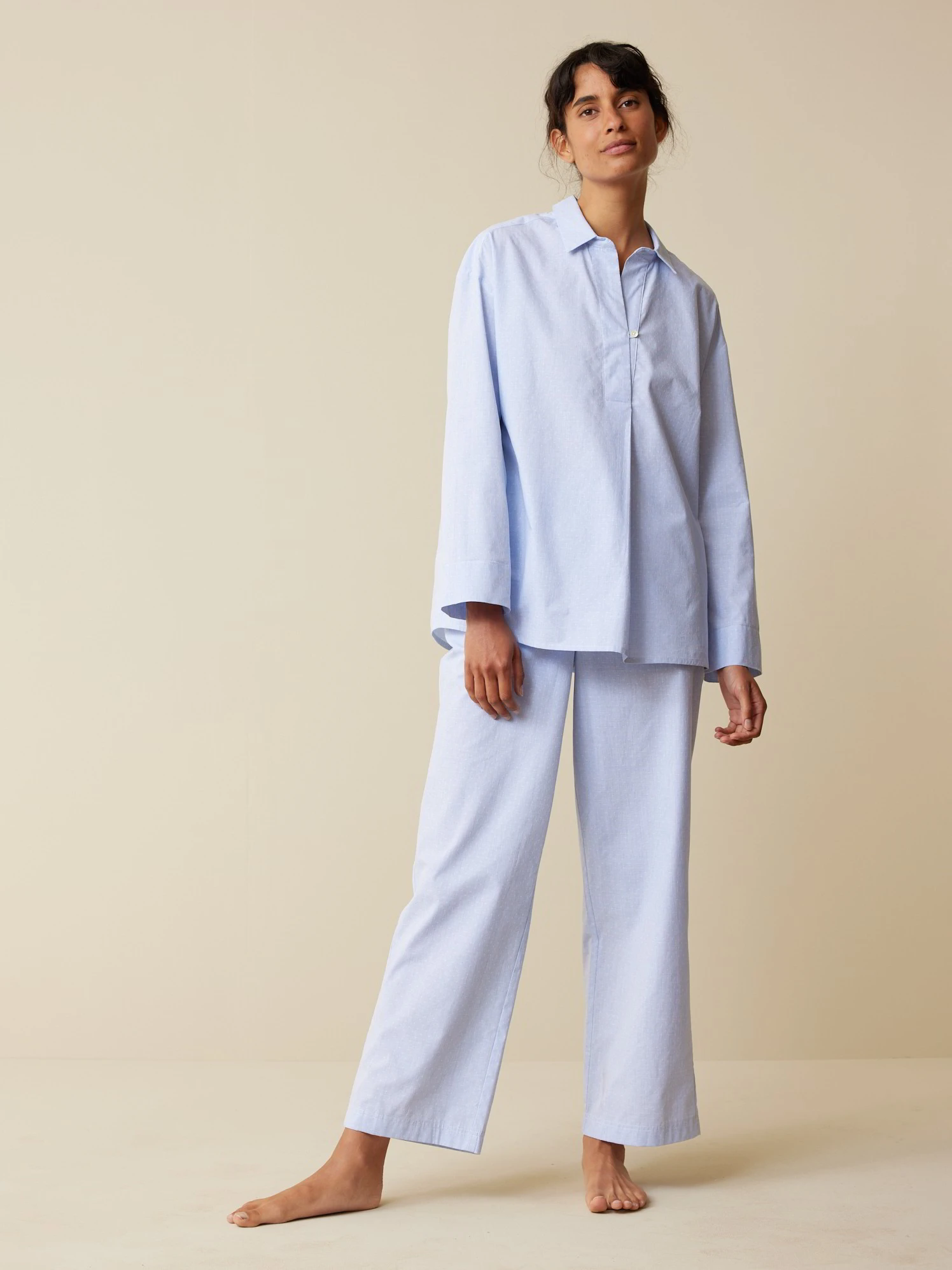 Ein Klassiker für jede Nacht: stilvolles Pyjamahemd aus feinem Faconné-Gewebe. Die weiche Baumwolle spendet ein unglaublich sanftes Gefühl. Das in leichter A-Linie geschnittene Modell hat einen Kragen, eine eingelegte Falte mit integriertem Schlaufenverschluss in der vorderen Mitte sowie eine Schulterpasse und eine Bewegungsfalte auf der Rückseite.