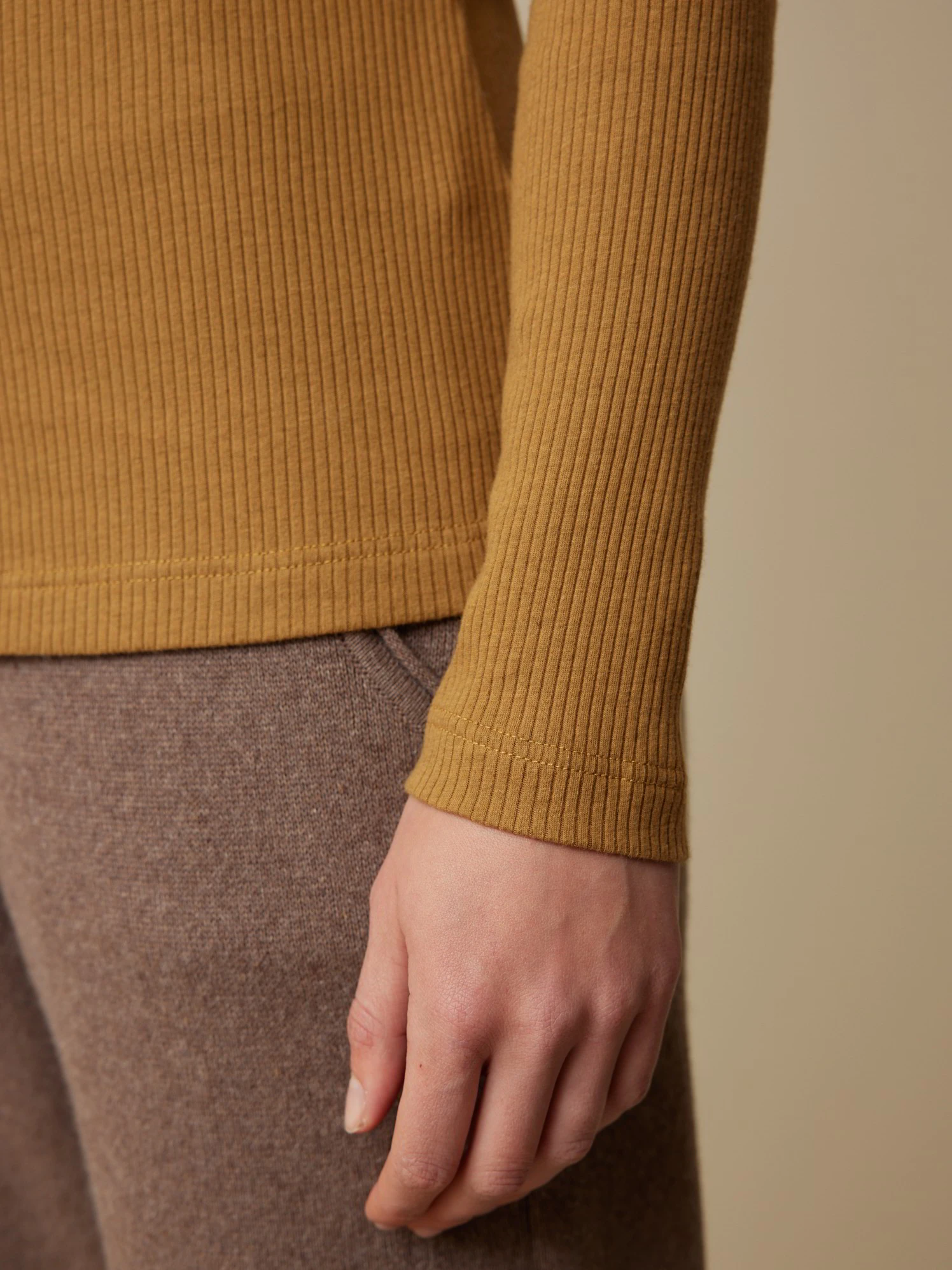 Zeitloses Langarm-Shirt mit feiner Ripp-Struktur, abgerundet mit Rollkragen und langen Ärmeln. Die hautfreundliche Kombination aus weicher Baumwolle und temperaturausgleichender Wolle ist die perfekte Mischung für die ersten kalten Tage. Figurumspielend geschnitten, vielseitig kombinierbar – für zuhause oder unterwegs.