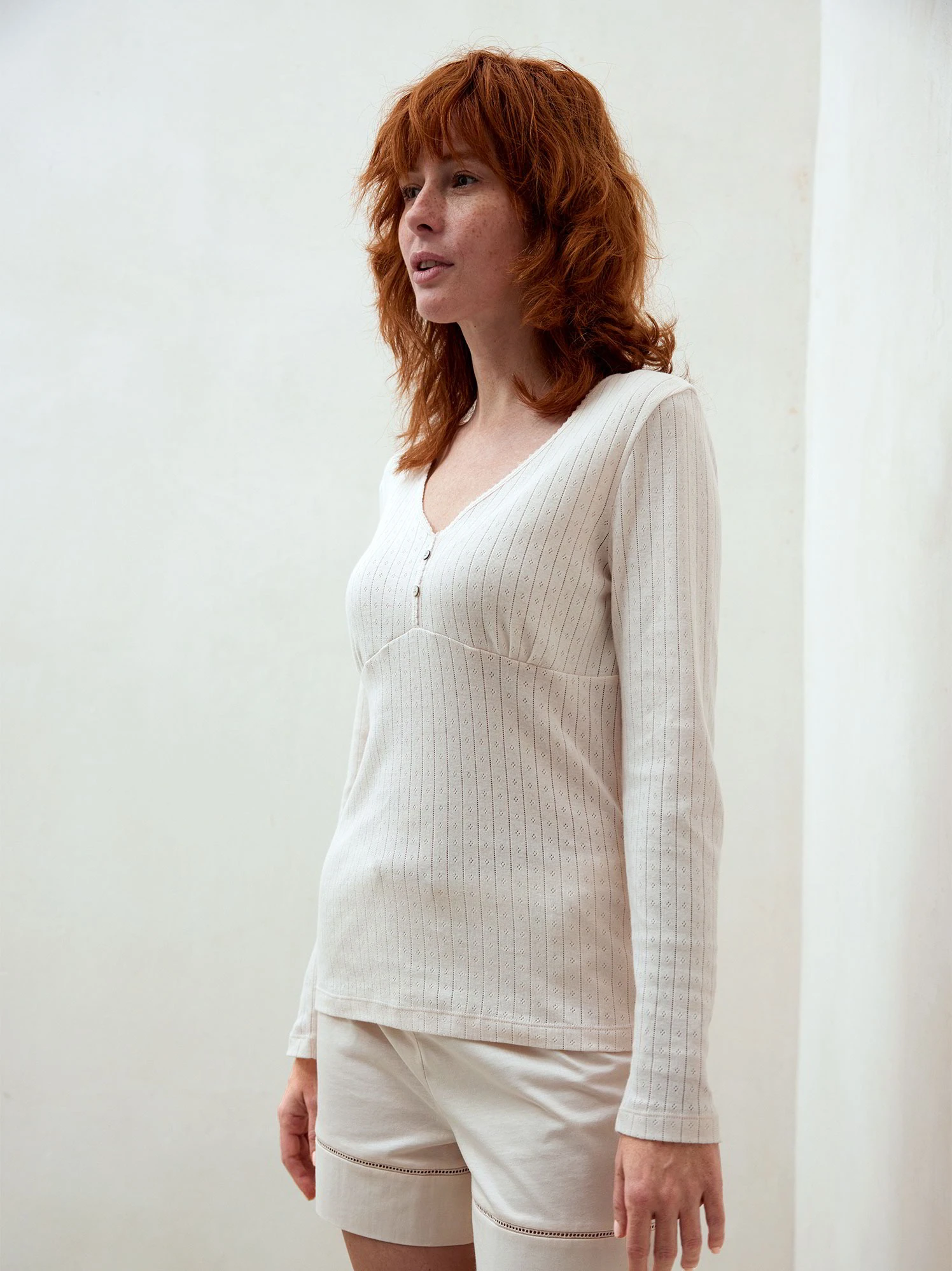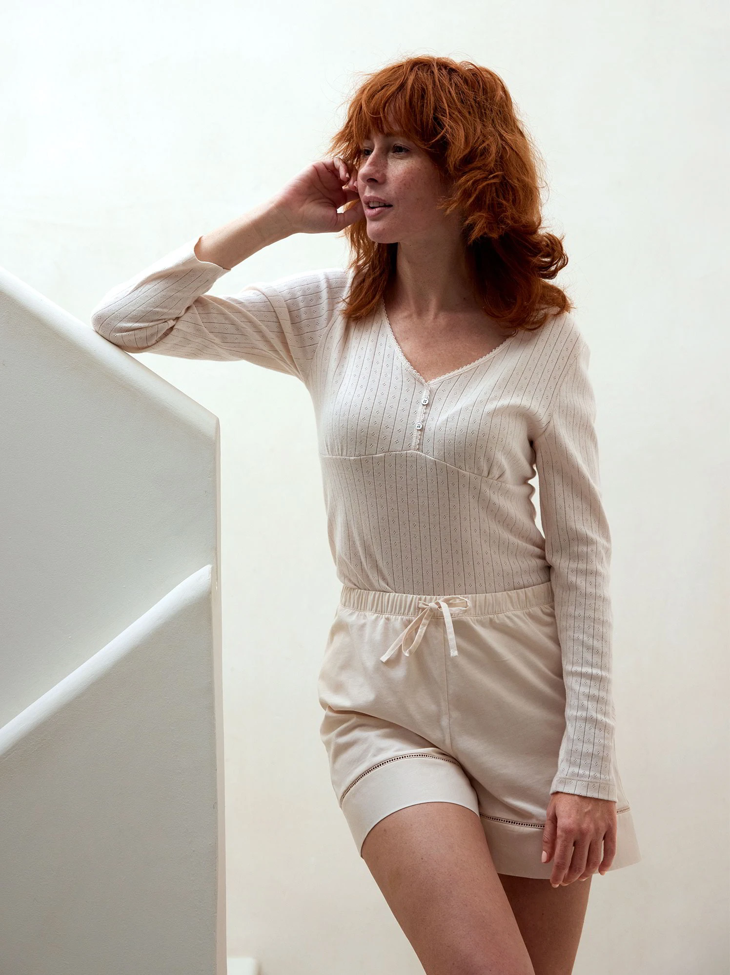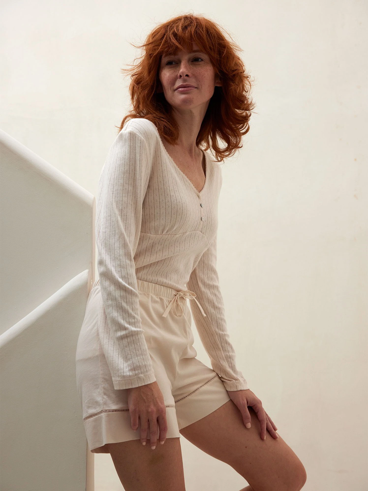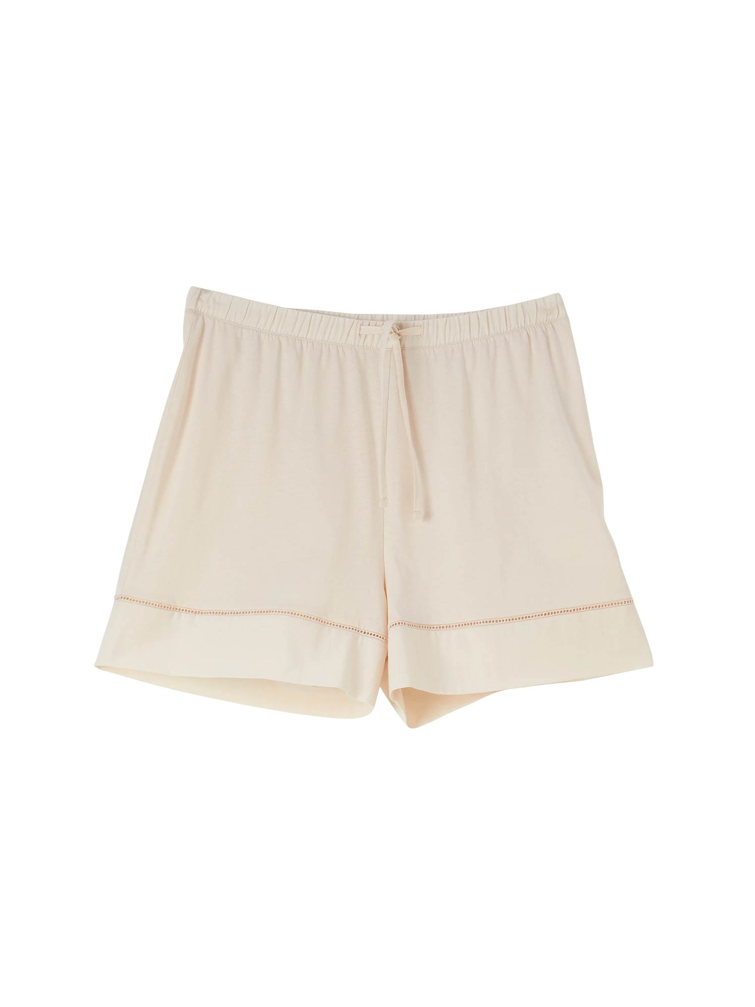 Diese angenehm-weiche Pyjama-Short entsteht aus weicher, hautfreundlicher Baumwolle kbA. Der lockere Schnitt und das besonders feine Material sorgen für ein herrliches Gefühl auf der Haut – leicht, zart und angenehm-luftig. Das Modell in feiner Jersey-Qualität hat einen schmalen Gummibund mit Taillenband. Ein besonderes Highlight ist die elegante Saumblende aus Baumwoll-Popeline inklusive edlem Hohlsaum.