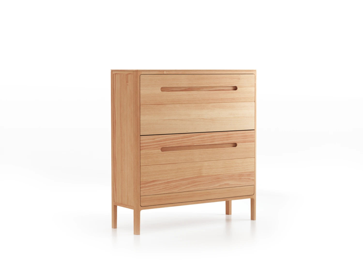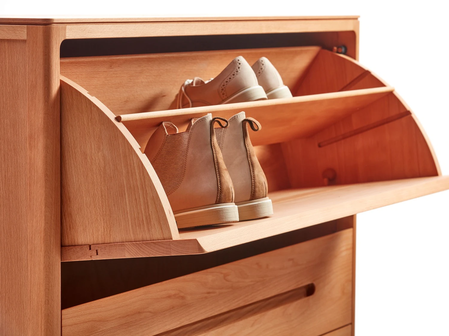 Die Schuhschränke tragen alle Gestaltungsmerkmale der Tenso-Serie: zarte, elegante, finessenreiche Anmutung; auf ein funktionelles Minimum reduzierte Holzdimensionen; schlichte, klare Linienführung; feine Schattenfugen gliedern die Front; gerundete Ecken, Kanten und Übergänge; sauber gefräste, optisch und haptisch „weiche“ Griffrillen an den Klappfächern.
