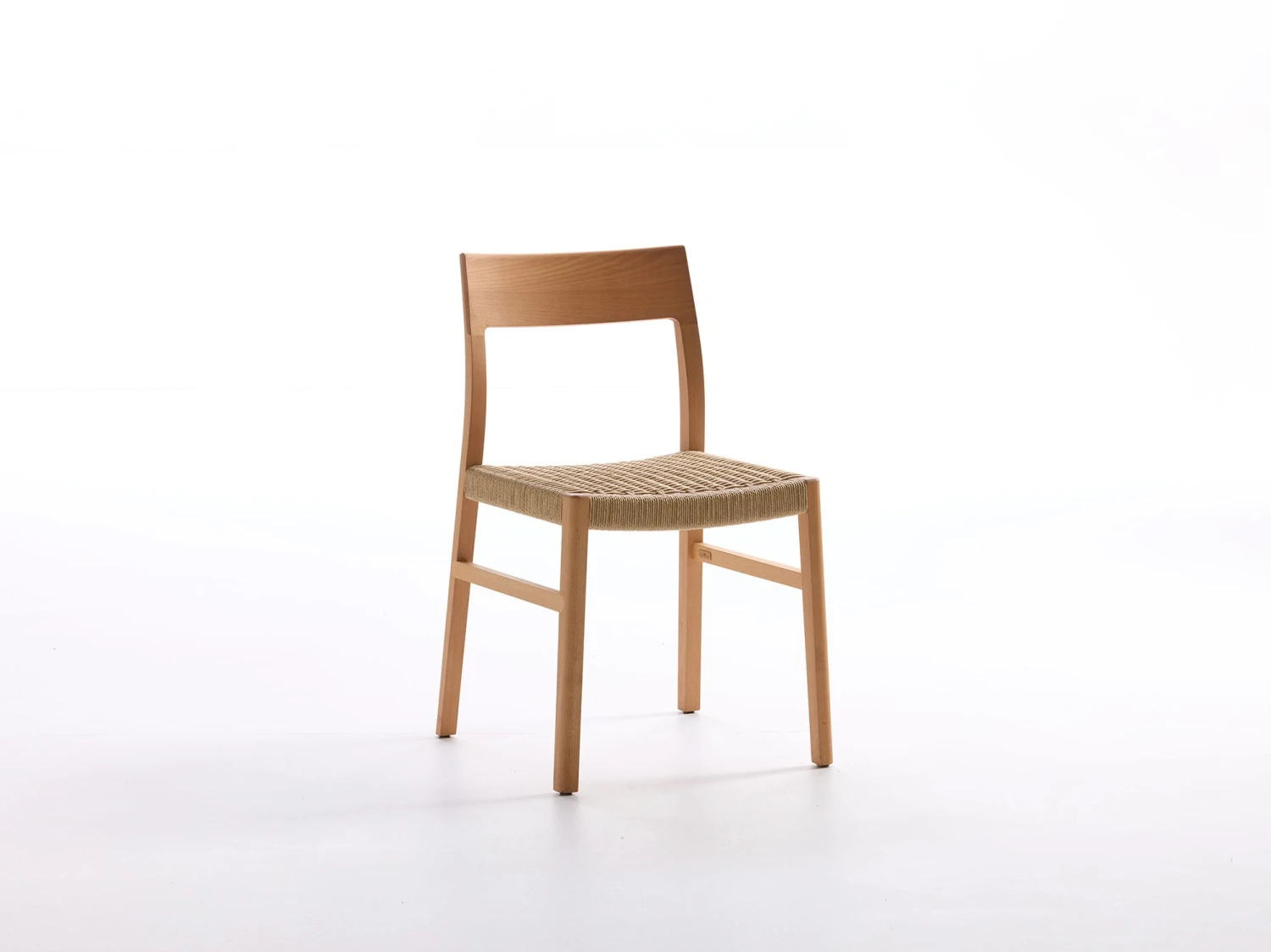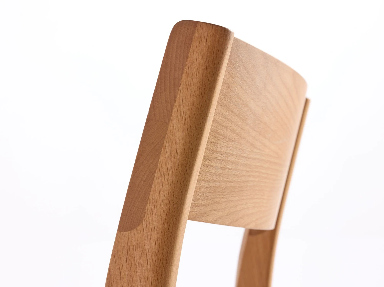 Der bequeme Stuhl ist aus Massivholz, dennoch leicht, seine Formgebung durch feine Rundungen gekennzeichnet. Die beiden nach hinten geneigten Holme und die rückengerecht gebogene Rückenlehne sind „überblattet“, ebenso die Stuhlbeine und deren Verbindungssprossen: eine feinsinnige, hochentwickelte, elegante Holzfügetechnik, die es nur in der Massivholztischlerei gibt.