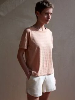 Das Kurzarm-Shirt aus weicher Bio-Baumwolle sorgt mit dem gewirkten Schattenstreifen für Aufsehen und ist der ideale Begleiter für Freizeit & Büro. Das Modell in feiner Jersey-Qualität hat einen zeitlos-schönen Schnitt und überzeugt mit kleinen Details – wie überschnittene Schulterpartien, einem Aufschlag am Ärmelsaum, zwei kleinen Seitenschlitzen sowie der feinen Rippenstruktur entlang des Rundhalsausschnittes.