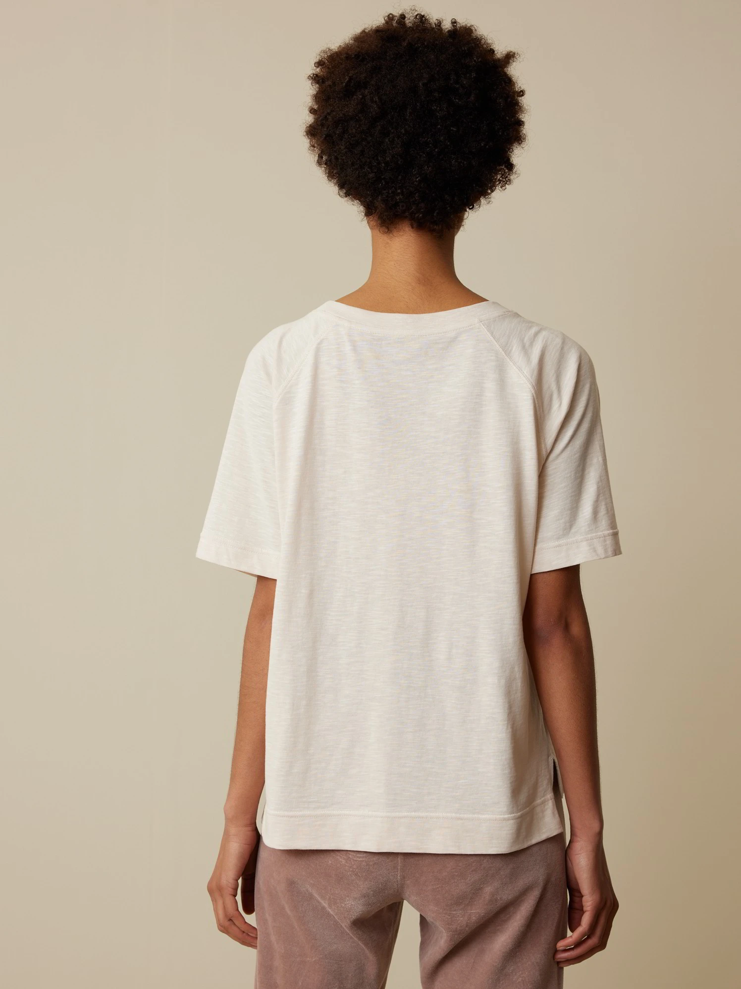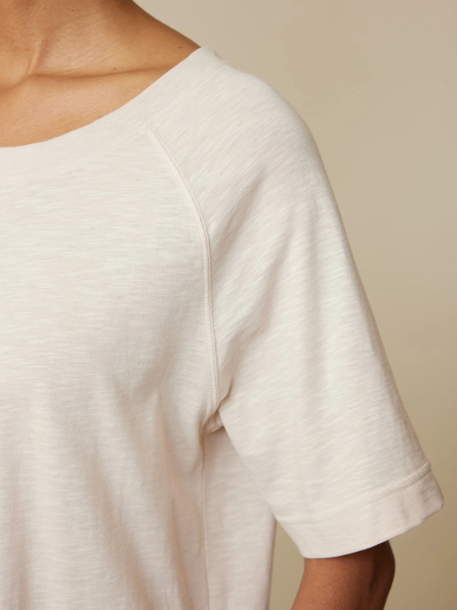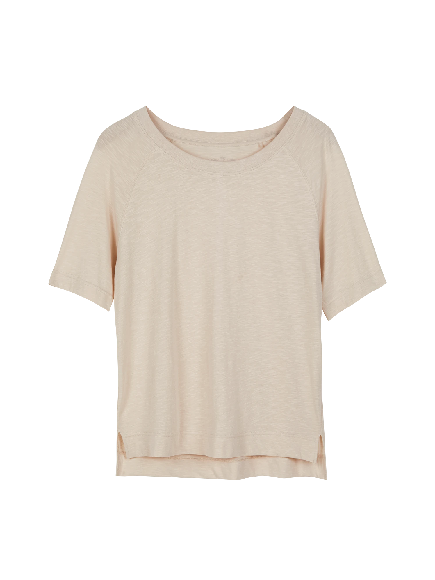 Zartes Dessin kombiniert mit einem besonderen Schnitt und einer zurückhaltend-hellen Farbe: Halbarm-Shirt aus hautfreundlicher Baumwolle. Das Modell mit der charakteristischen Flammé-Struktur hat einen Rundhalsausschnitt mit 1×1-Rippbündchen, Raglanärmel und Seitenschlitze. Die Vorderseite ist verkürzt.