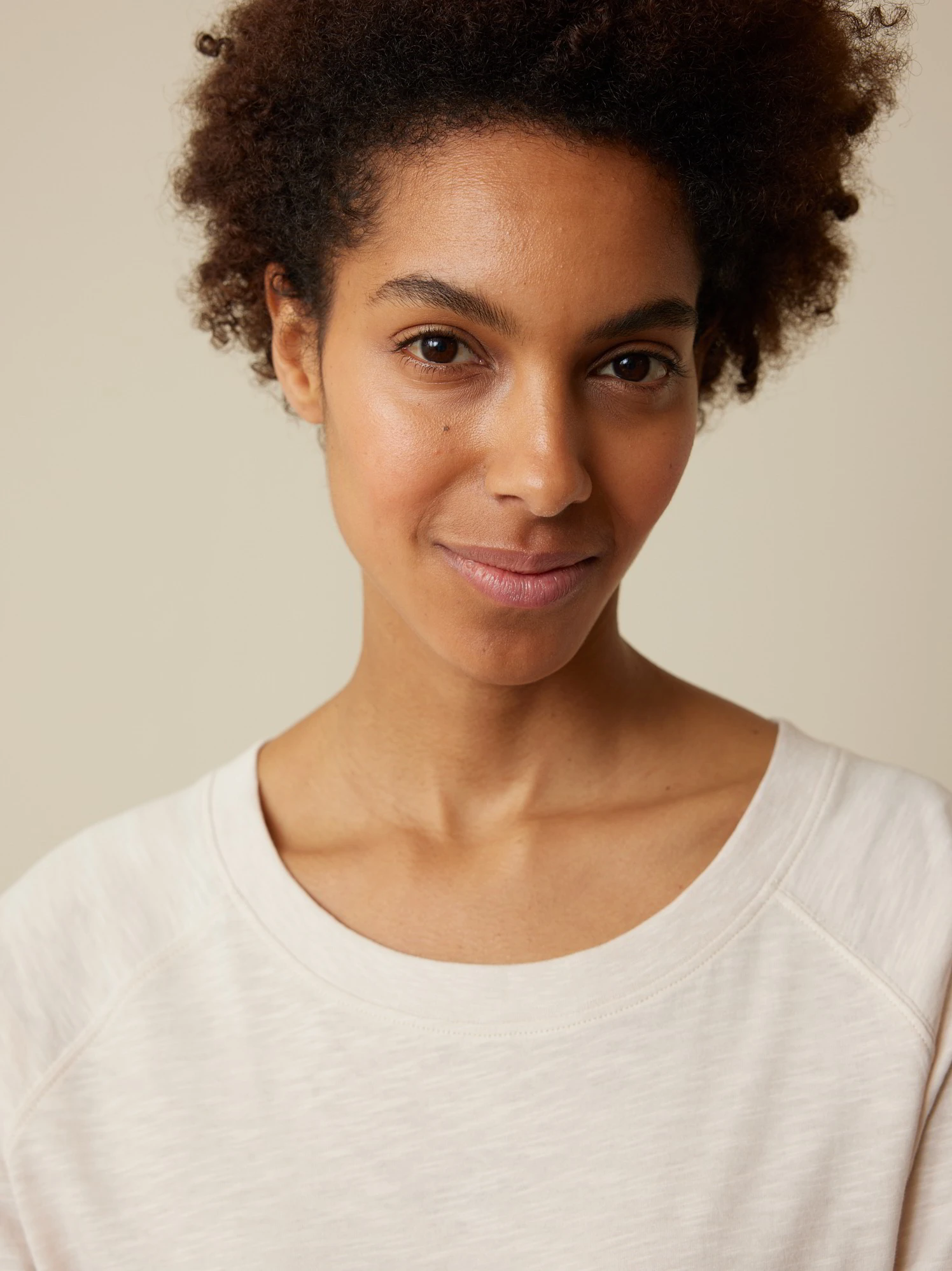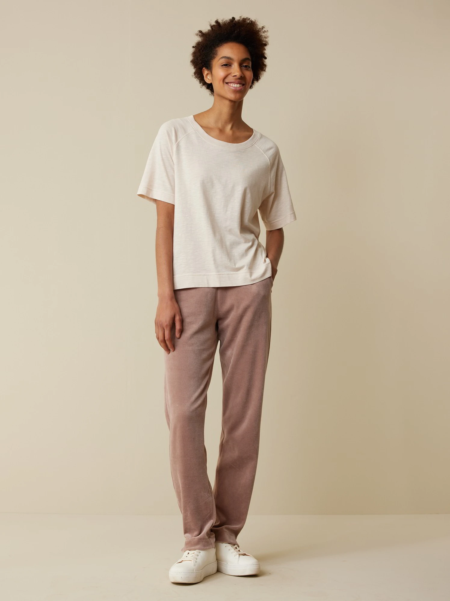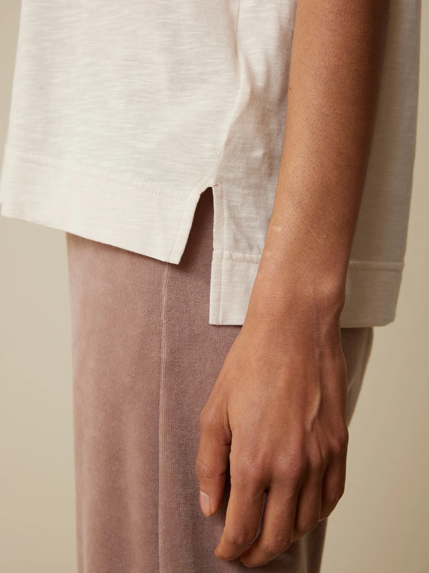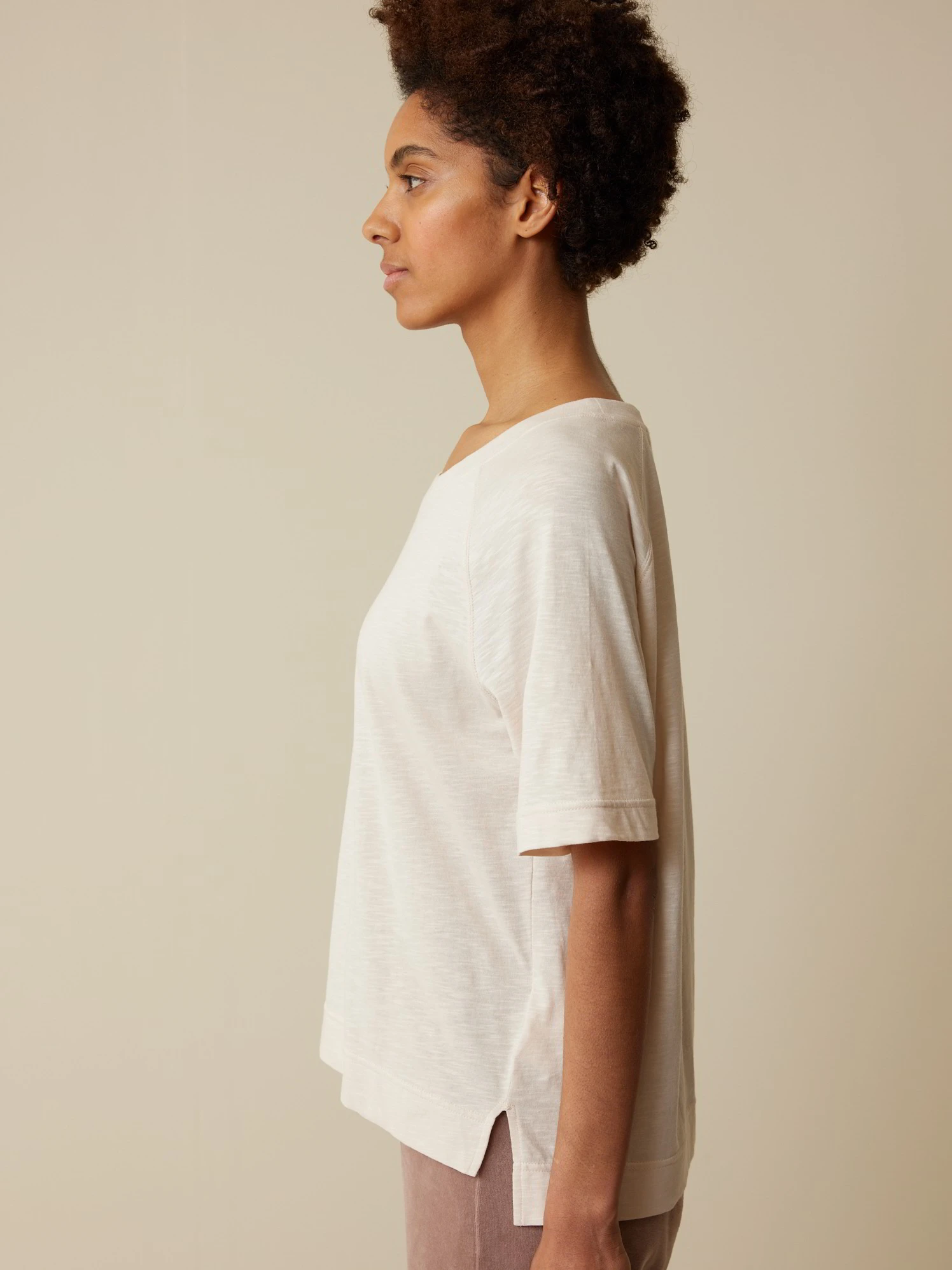 Zartes Dessin kombiniert mit einem besonderen Schnitt und einer zurückhaltend-hellen Farbe: Halbarm-Shirt aus hautfreundlicher Baumwolle. Das Modell mit der charakteristischen Flammé-Struktur hat einen Rundhalsausschnitt mit 1×1-Rippbündchen, Raglanärmel und Seitenschlitze. Die Vorderseite ist verkürzt.