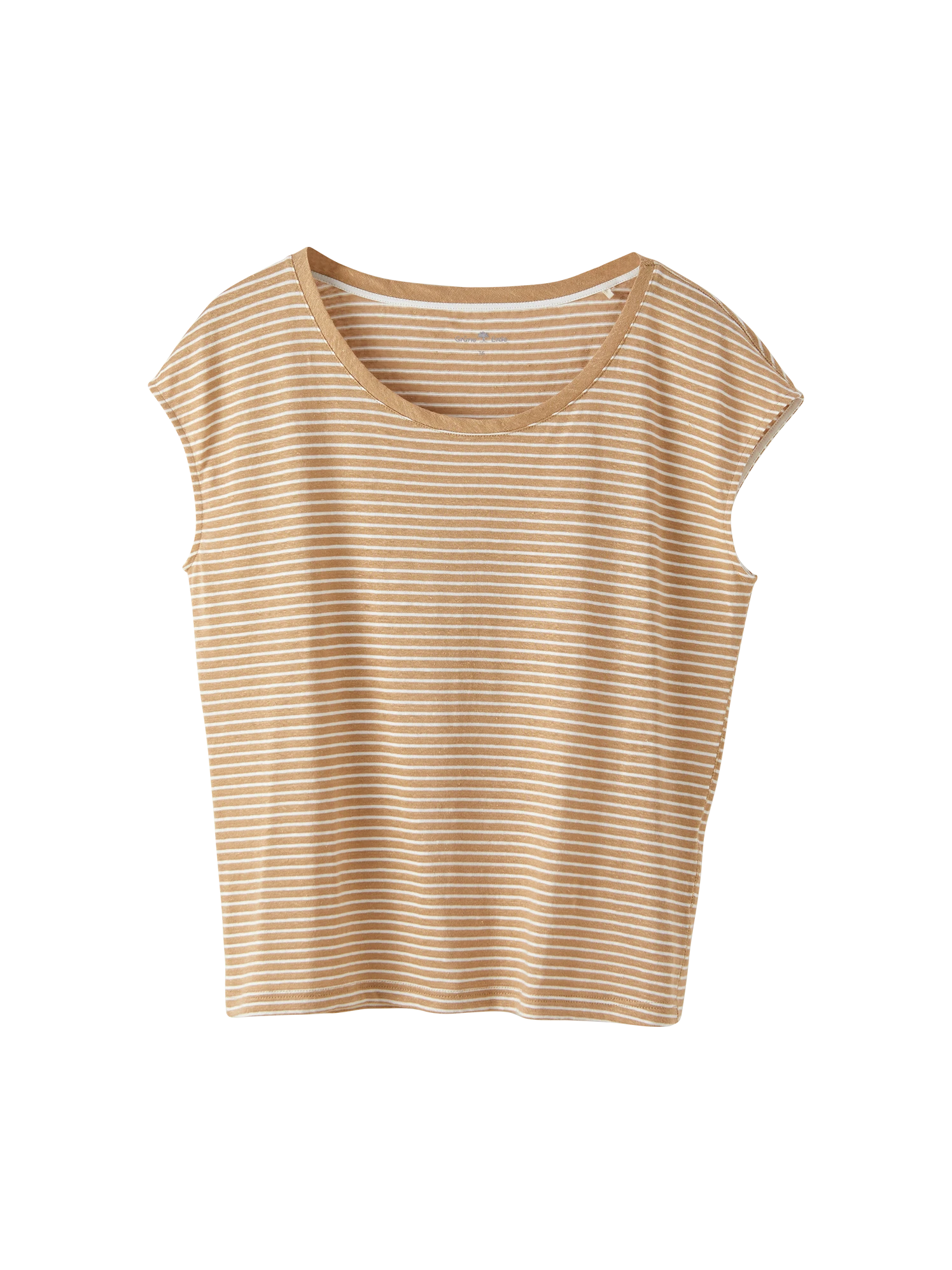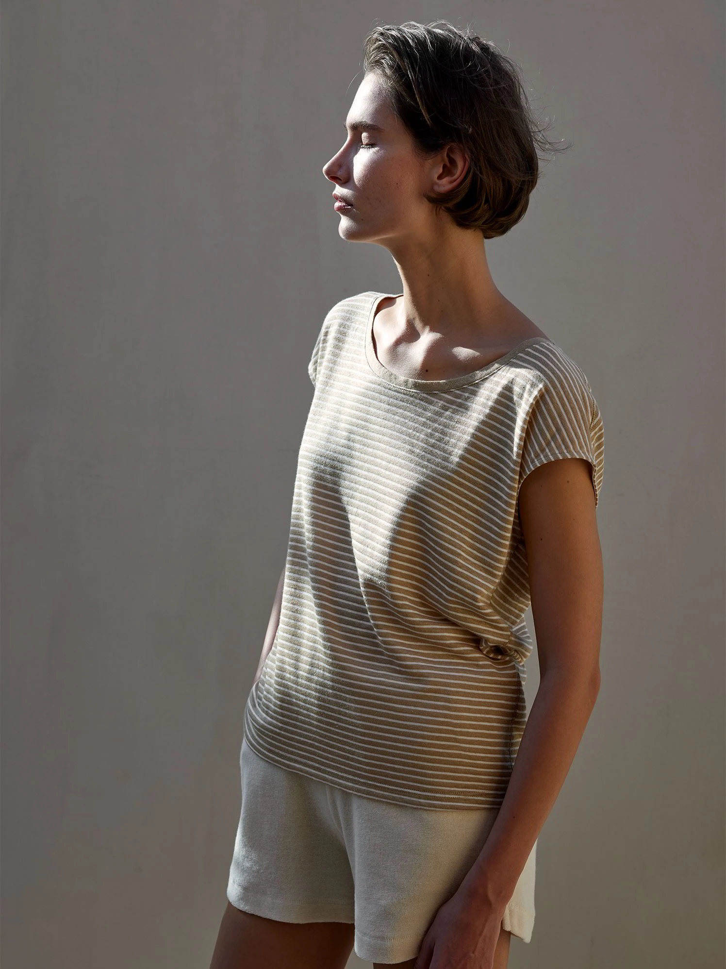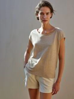 Wertvolle Naturmaterialien vereint mit einer angenehm-gemütlichen Passform und einem zart-transparenten Streifendessin. Das Kurzarmshirt entsteht aus weicher Baumwolle kbA und edlem Leinen kbA. Es hat einen weiten Rundhalsausschnitt, Flatlocknähte zieren Saum und Ärmelabschluss. Als Alternative zum 3/4-Arm-Shirt lässt sich dieses Kleidungsstück in Jersey-Qualität vielfältig zu diversen Unterteilen kombinieren.