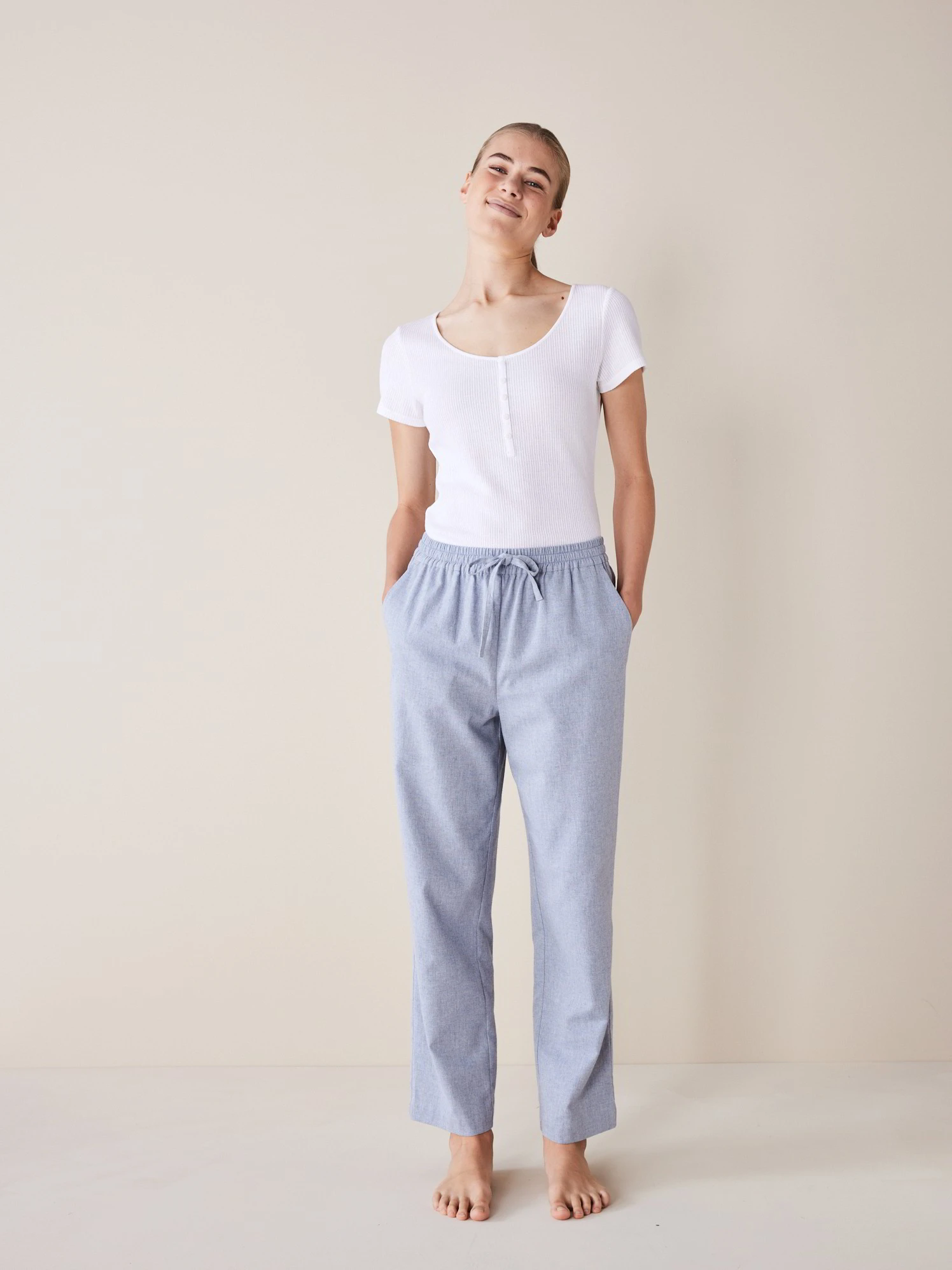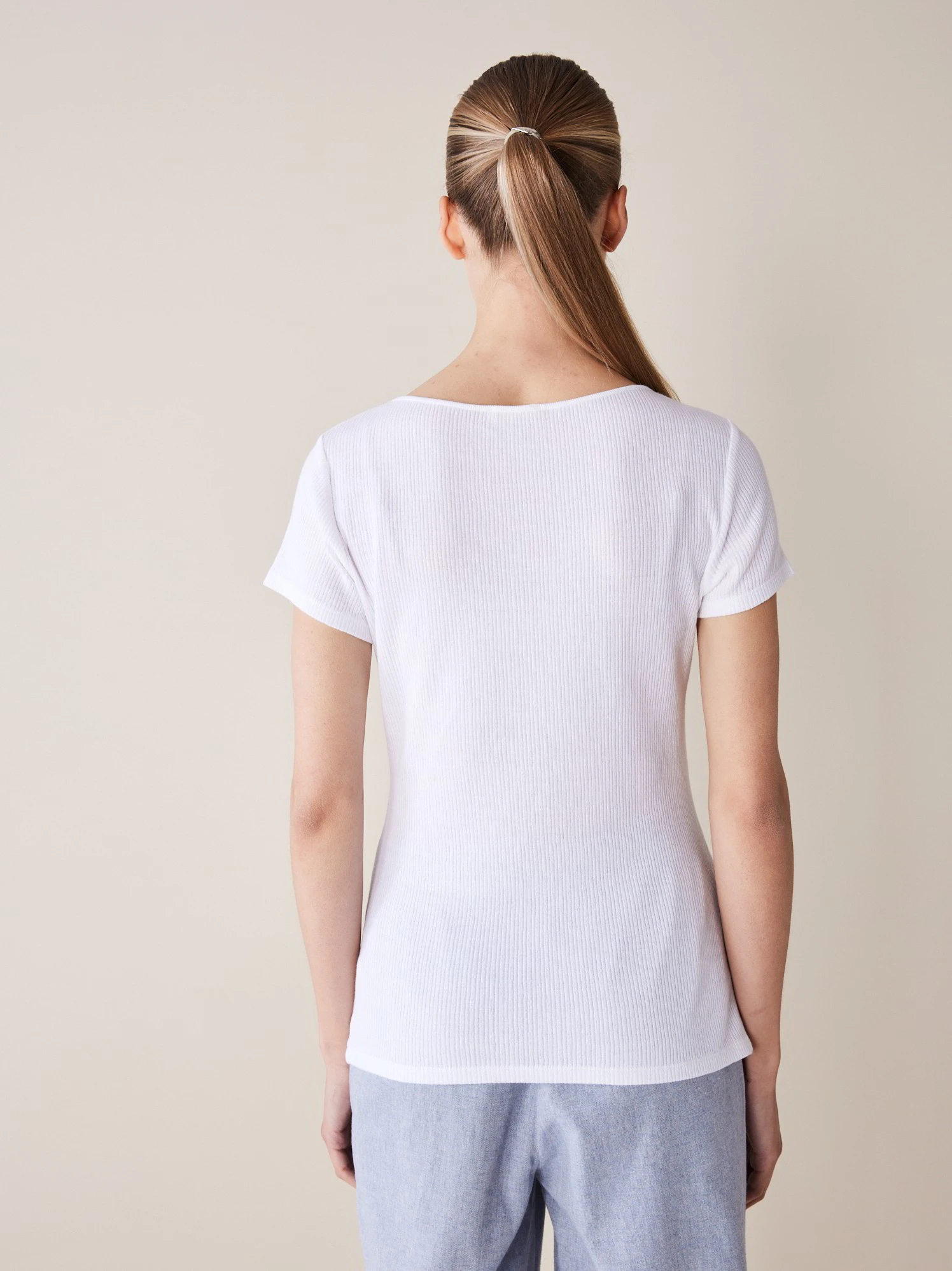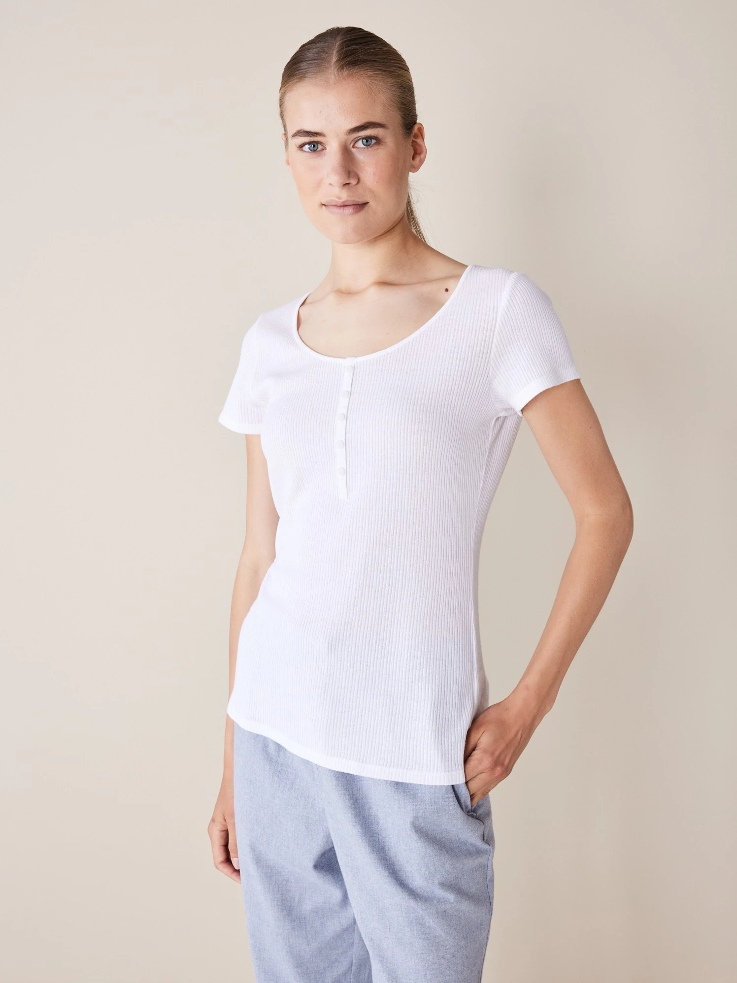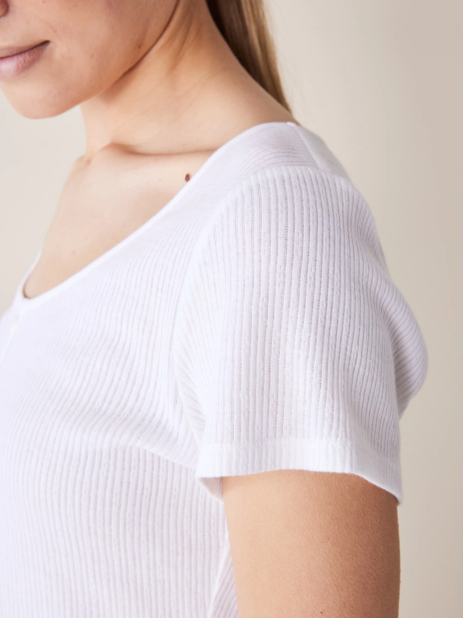 Es hat einen figurnahen Schnitt und eine sanfte Farbgebung. Kleine Details – wie eine kurze, blinde Knopfleiste und ein tiefer Rundhalsausschnitt – runden das Shirt harmonisch ab.