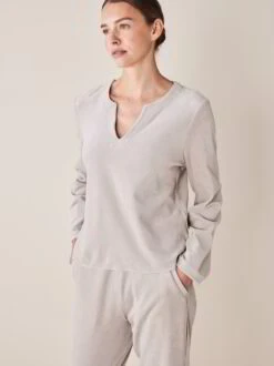 Das Modell in kuscheliger Nicki-Qualität überzeugt mit einem optisch-schönen V-Ausschnitt, leicht ausgestelltem Ärmelsaum und Seitenschlitzen am Saum.