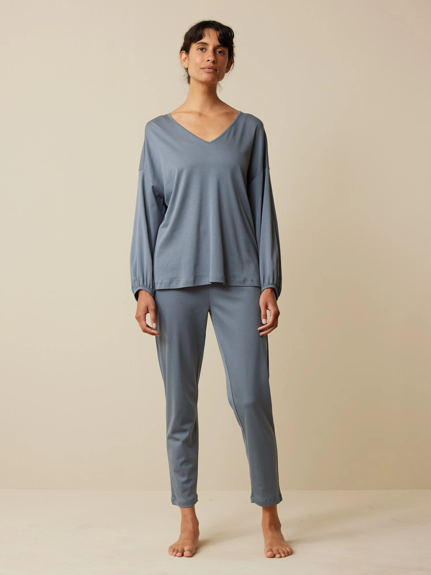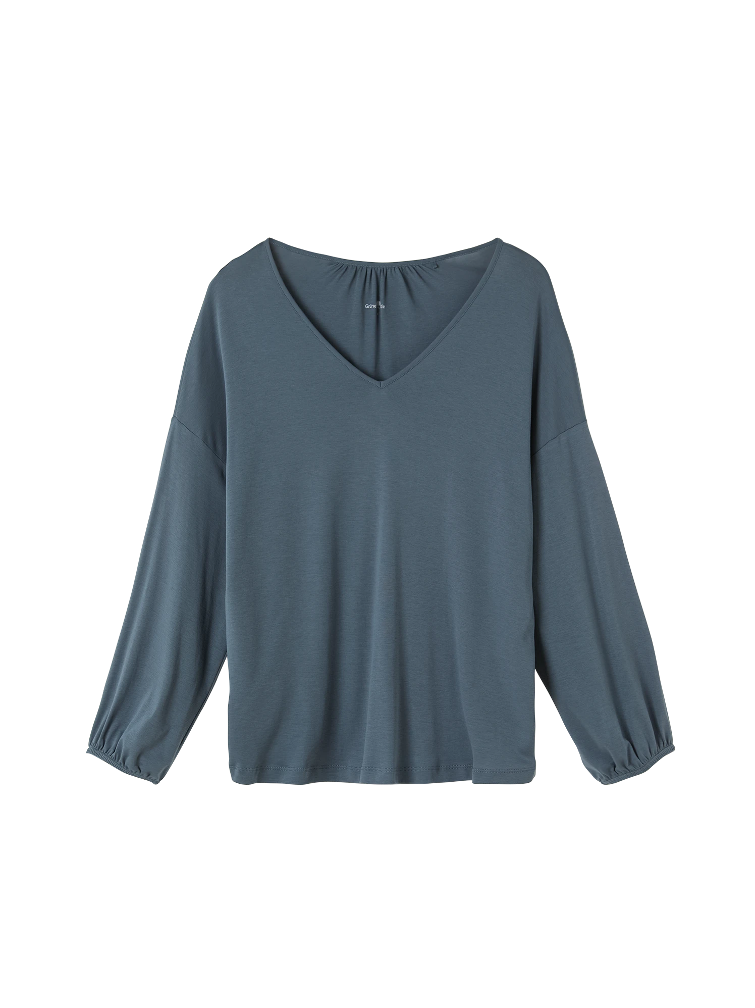 Locker geschnittenes Langarm-Schlafshirt aus fließender Jersey-Qualität. Die weiche Baumwolle umspielt sanft die Haut und sorgt für ein angenehmes Gefühl während der Nacht. Mit V-Ausschnitt, verkürzten Ärmeln mit Gummizug am Ärmelabschluss und zarter Raffung auf der Rückseite.