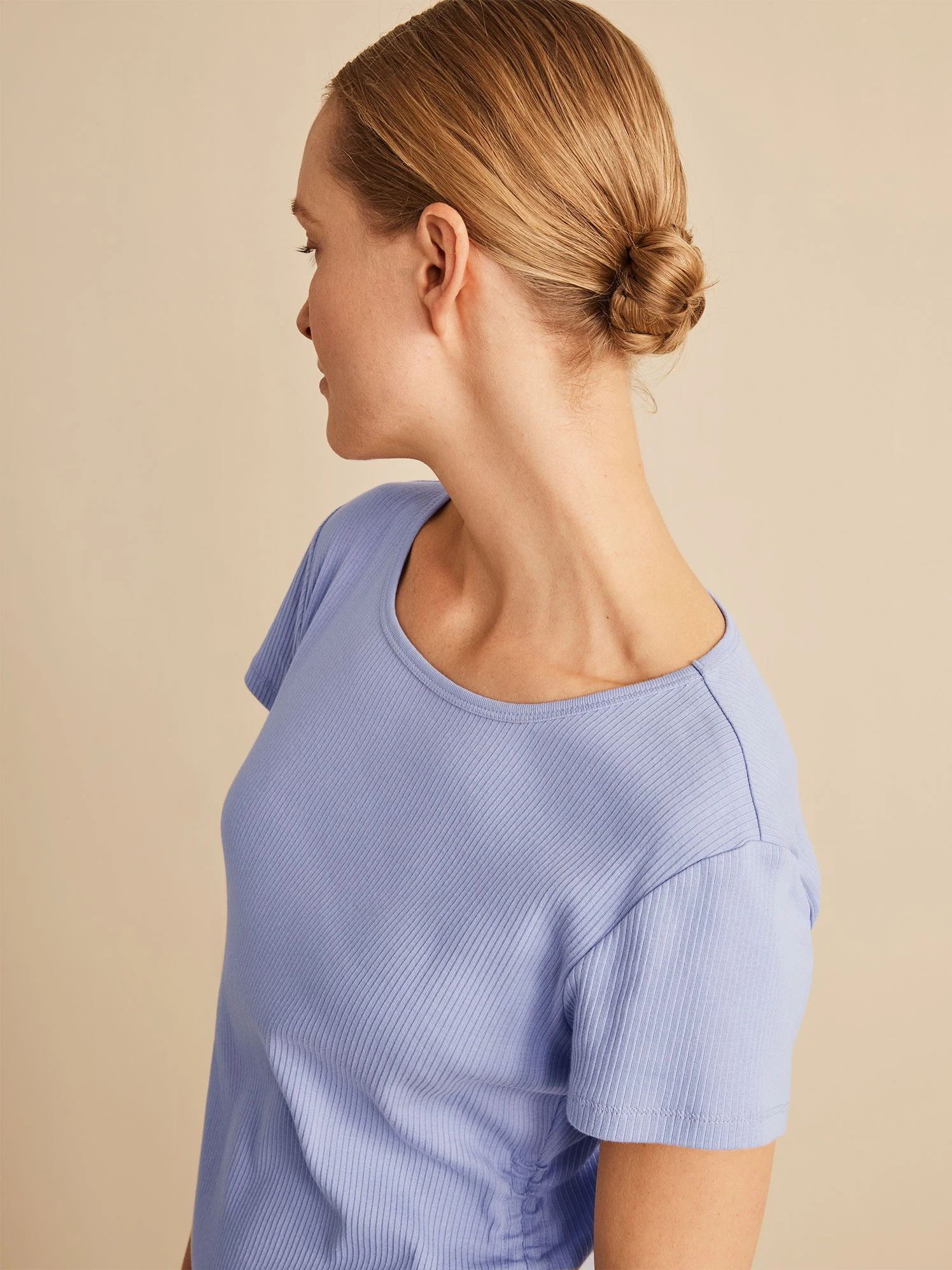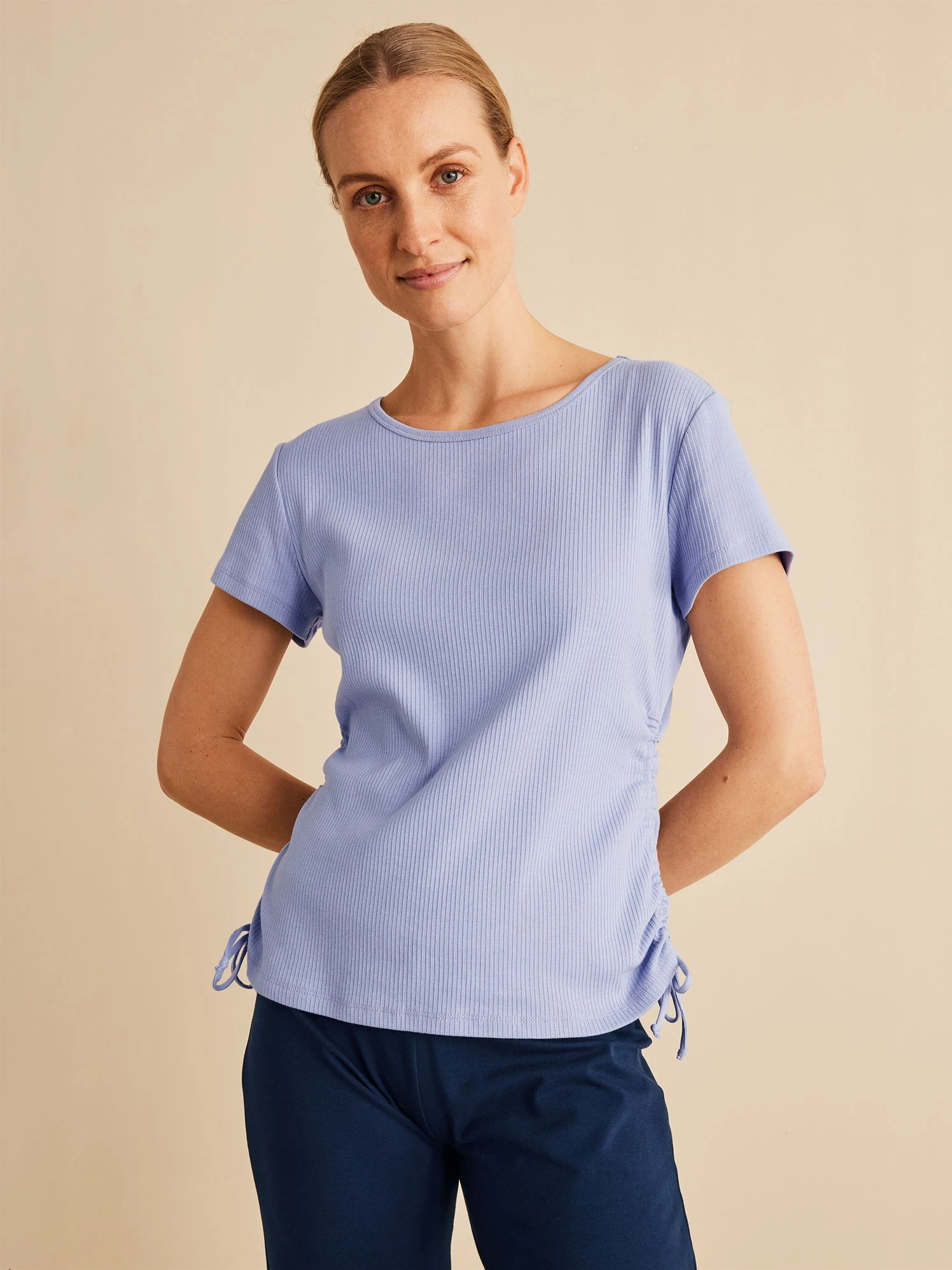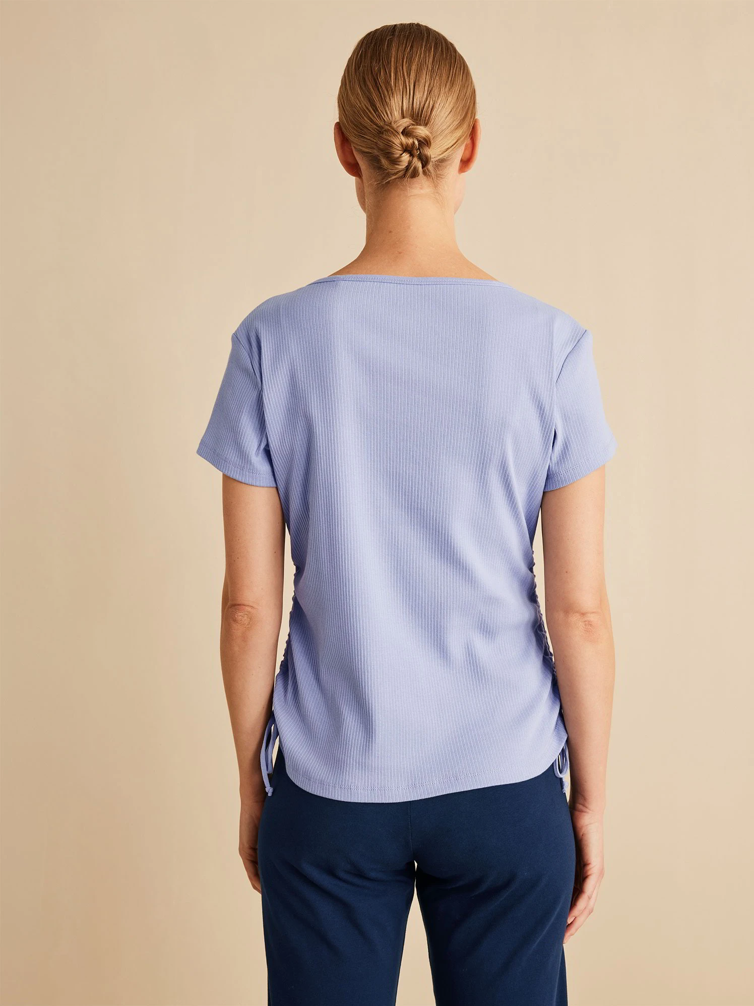 Das Rippshirt hat eine zeitlose Farbe und eine zarte Raffung entlang der Seitennaht am Rumpf.