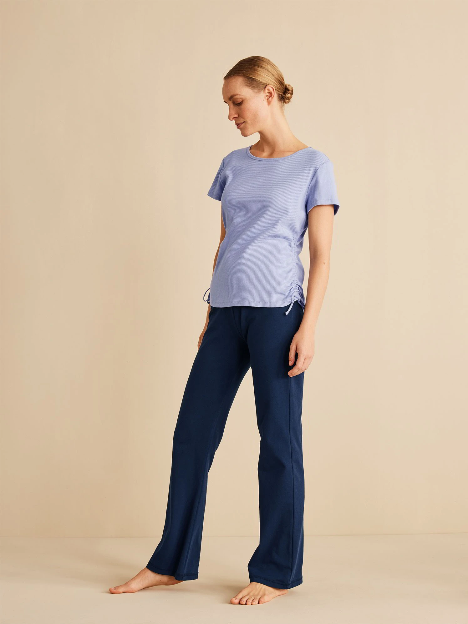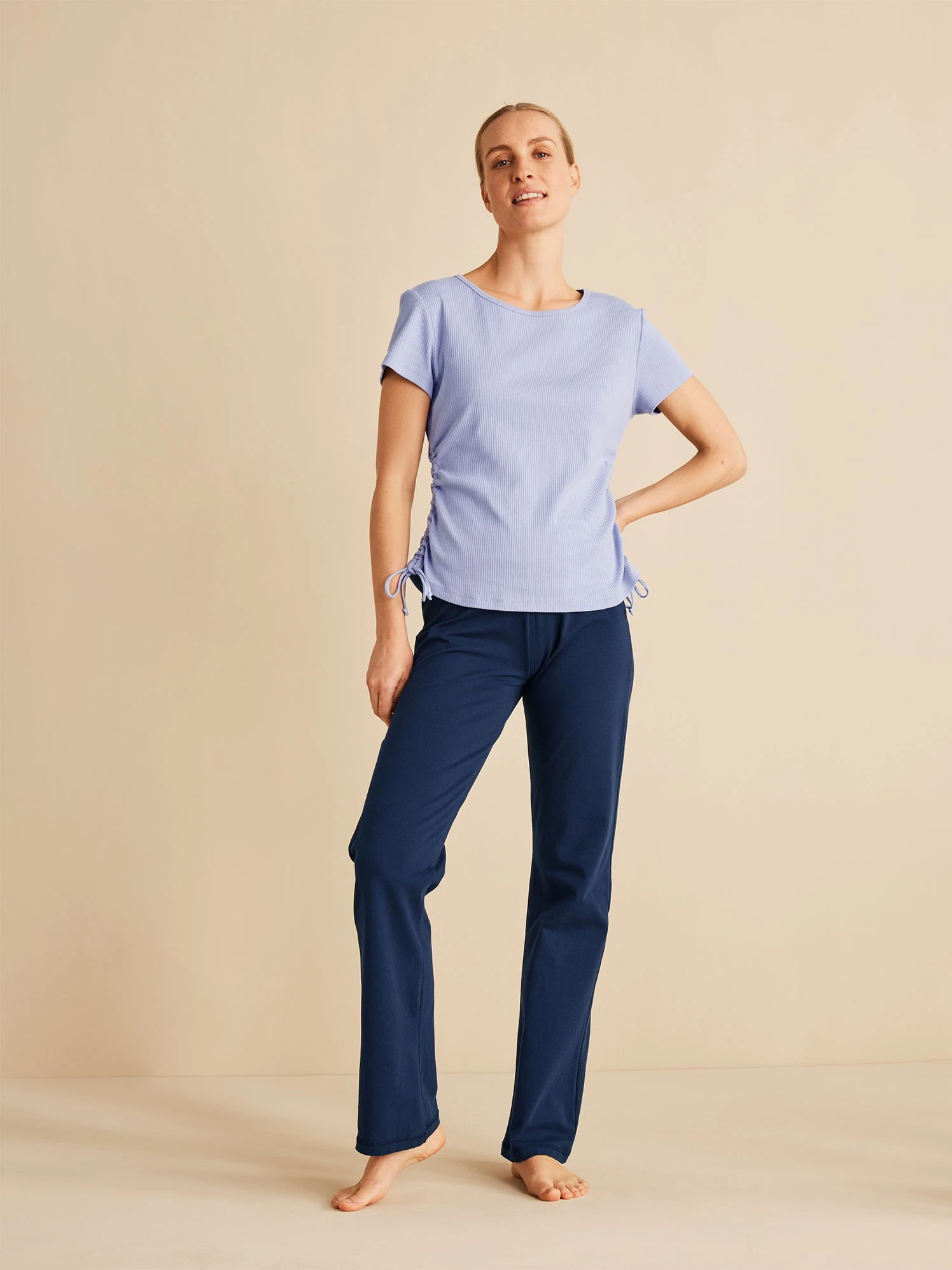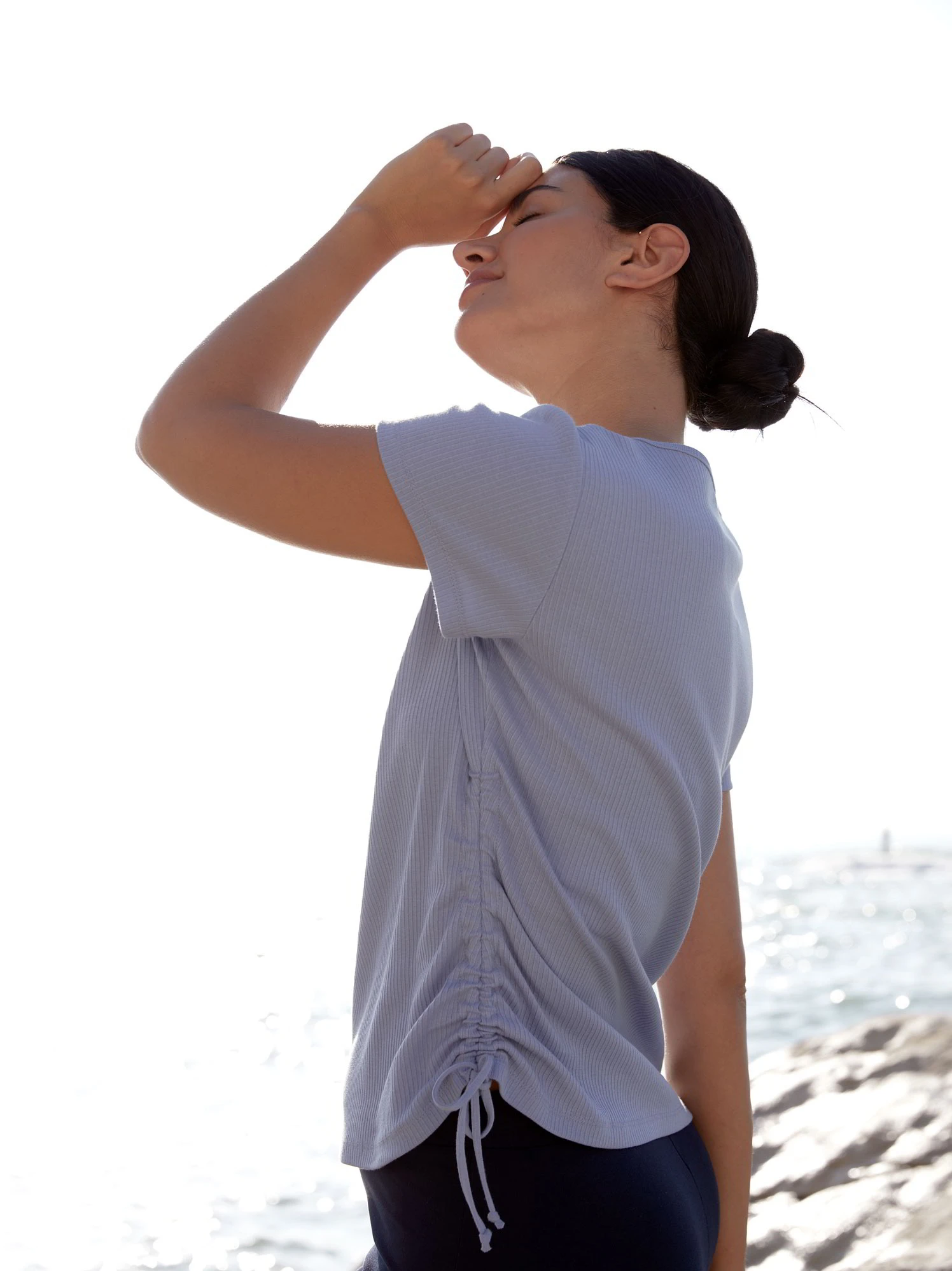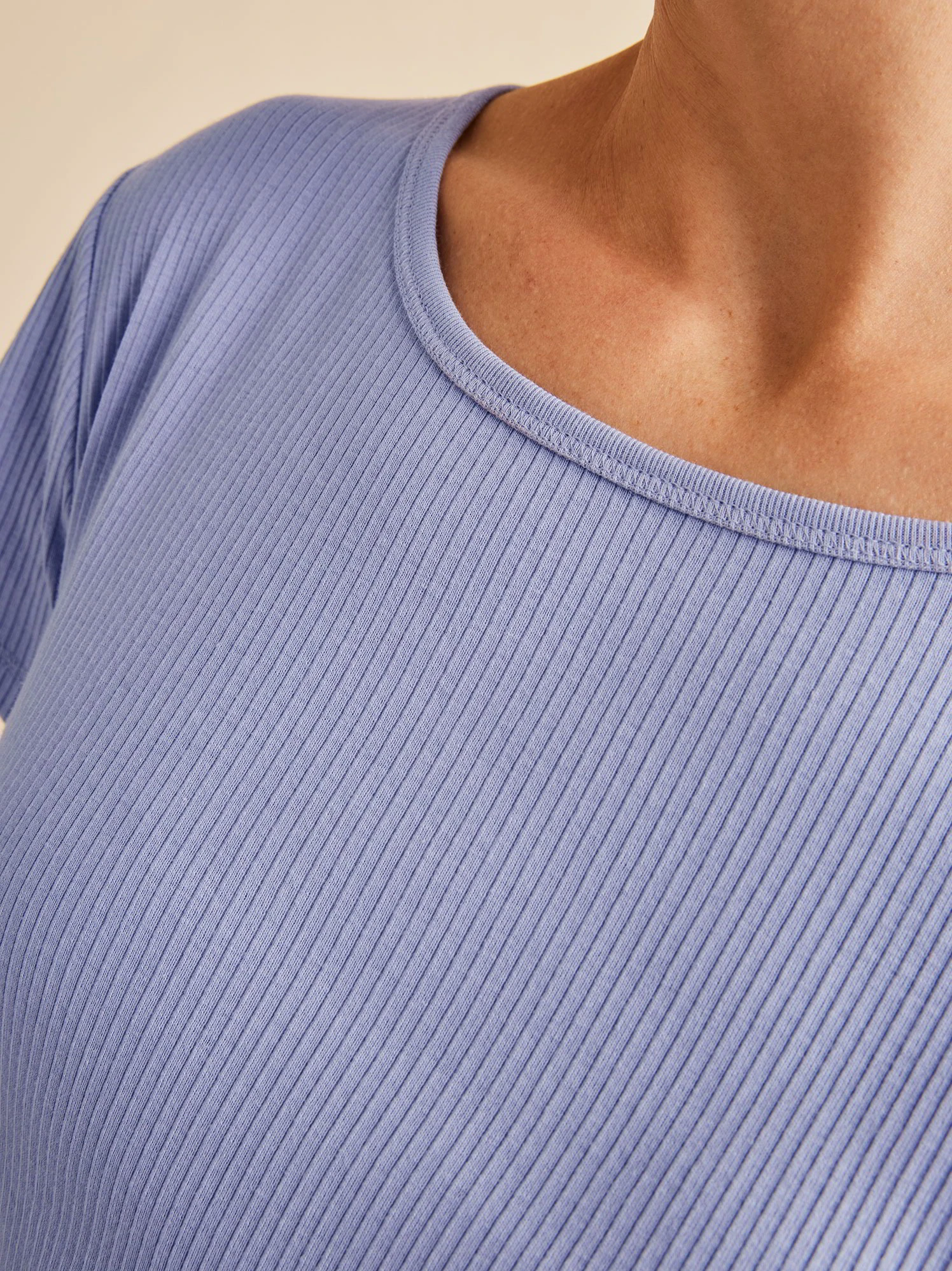 Das Rippshirt hat eine zeitlose Farbe und eine zarte Raffung entlang der Seitennaht am Rumpf.