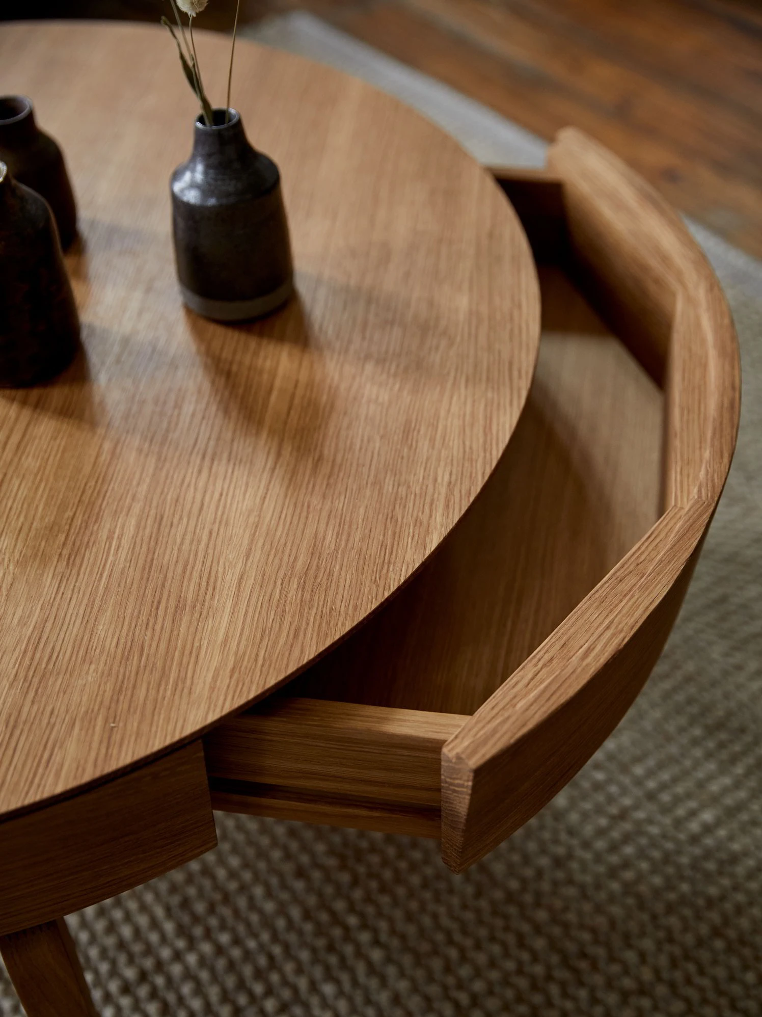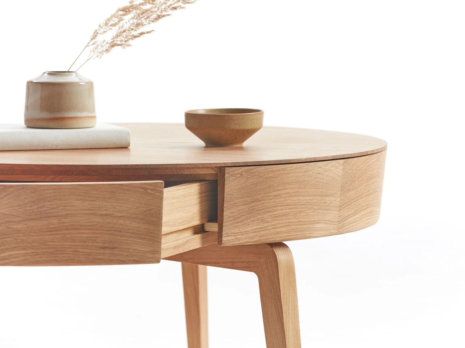Praktisch: Mitsu birgt in seinem Korpus eine sehr geräumige Schublade für viele persönliche, kleine Dinge. Aus Vollholz (Buche, Eiche oder Esche) in unserer slowenischen Partnerwerkstätte gefertigt. Die Oberfläche ist von Hand mit duftendem Naturöl eingelassen.