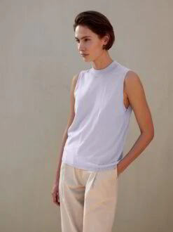 Dieses Stricktop wird garantiert ein frühlingshafter Begleiter: Es entsteht aus weicher Pima-Baumwolle kbA in hochwertiger fully-fashioned-Machart und zeigt sich zeitlos-schön. Das Modell überzeugt mit weicher Haptik, sorgsamer Verarbeitung sowie einer zeitlos-legeren Optik. Mit einem hochgeschnittenen Rundhalsausschnitt mit Rippbündchen. Ohne Ärmel.