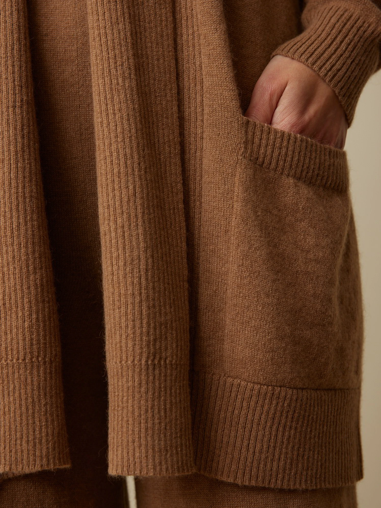 Verspricht höchsten Wohlfühl-Komfort: Strickjacke aus ungefärbtem Kamelhaar. Das Modell besticht mit seiner Haptik als auch optisch. Die weiche Strick-Qualität, die langen Raglanärmeln, die aufgesetzten Taschen und der Rippabschluss an Hals-, Ärmel- und Saumabschluss auf der Vorderseite machen den Überwurf zu einem Lieblingsteil Ihrer nachhaltigen Capsule Wardrobe. Mit der Hose aus Kamelhaar eine weiche Kombi für zuhause oder unterwegs.