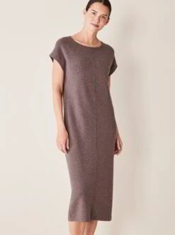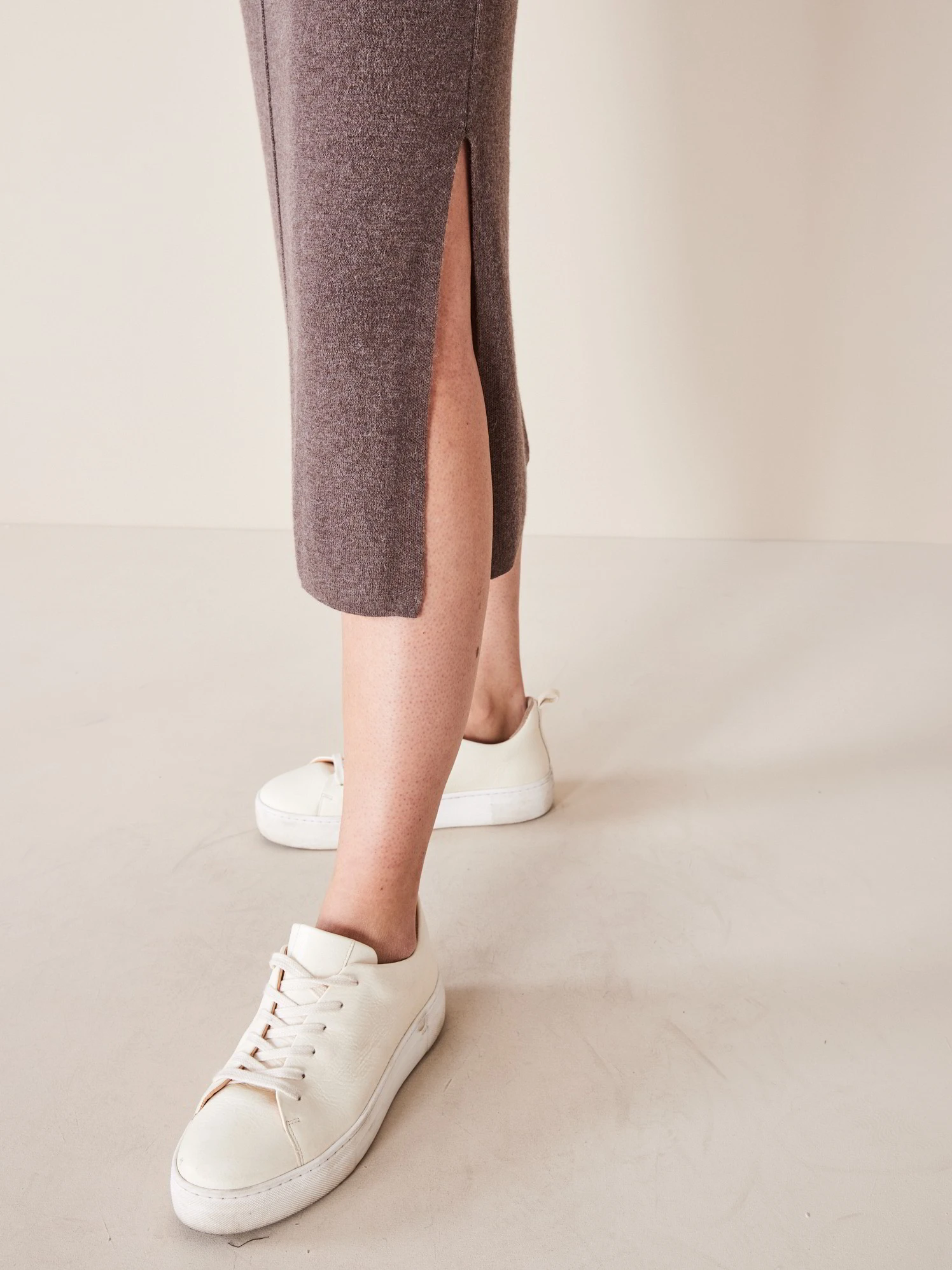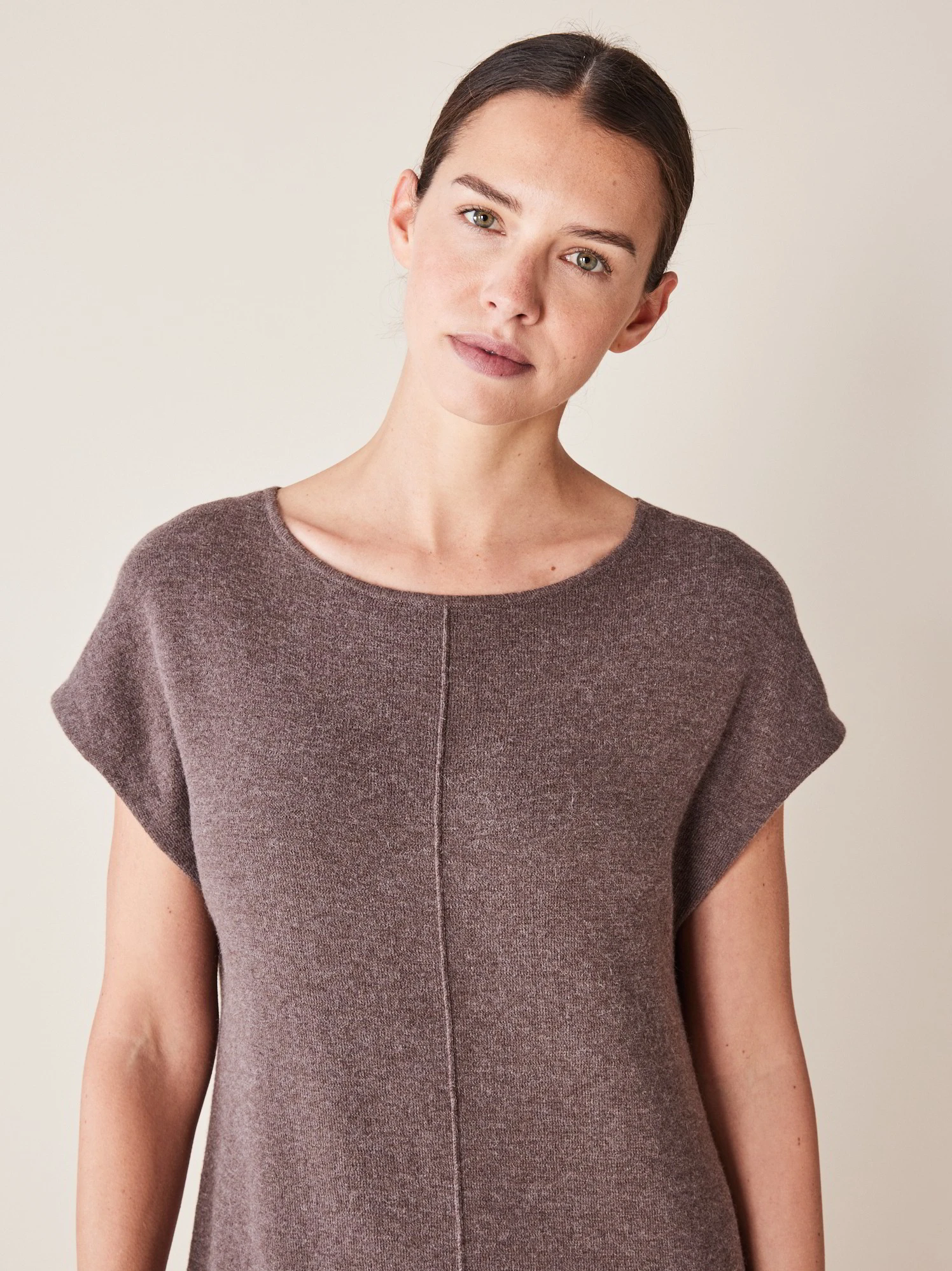 Das Modell im Milano-Strick hat einen U-Boot-Ausschnitt, überschnittene Schulterpartien, eine Mittelnaht auf der Vorderseite sowie hohe Seitenschlitze am Saum.