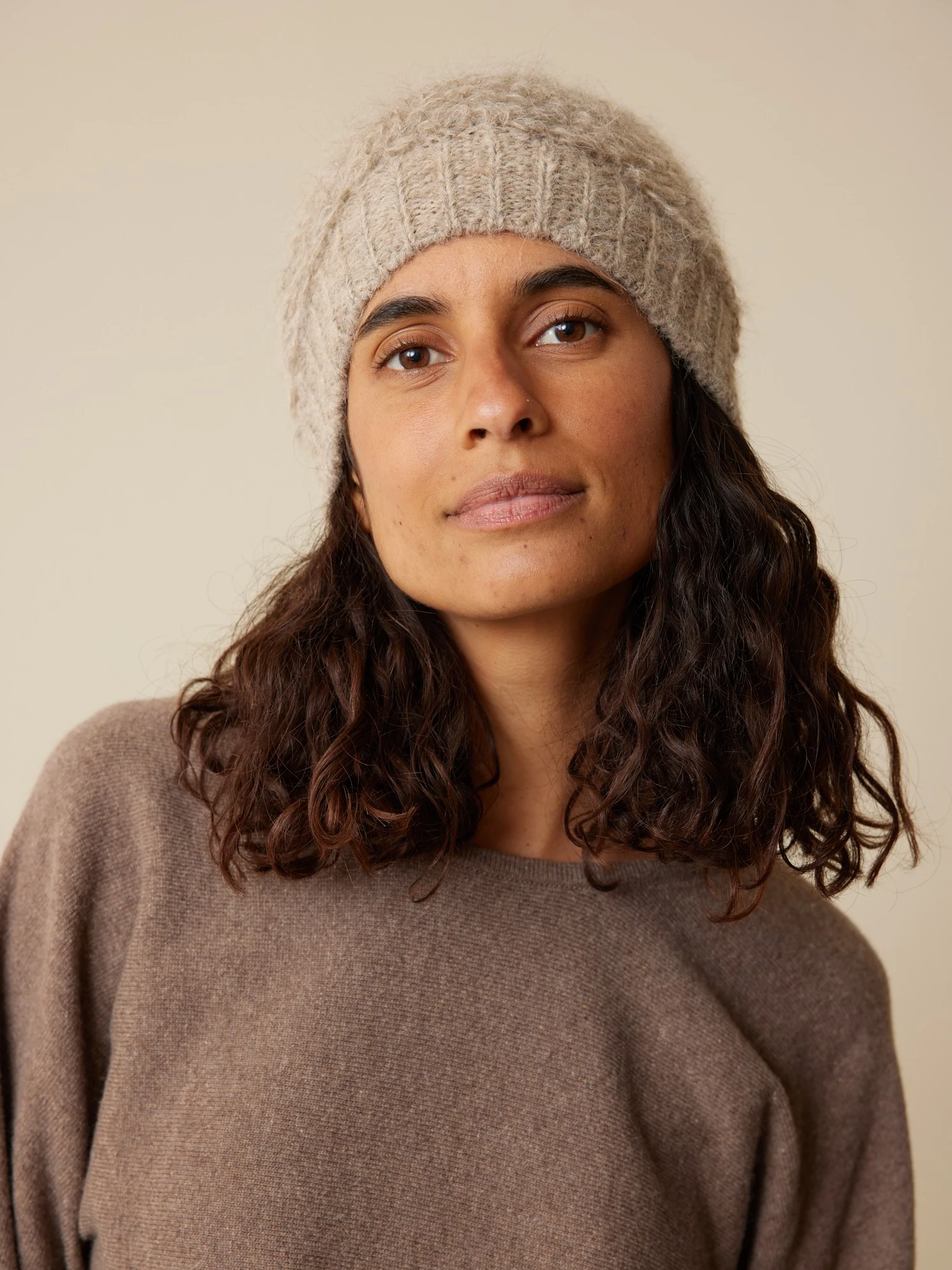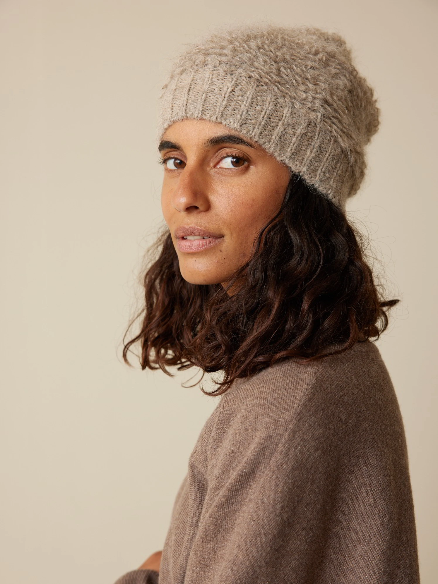 Als besonderes Lieblingsstück gilt unsere Mütze aus hochwertiger Alpakawolle. Die haarige Struktur des Garns und die besondere Loop-Strickart geben dem Modell einen unverwechselbaren Look – und eine flauschig-weiche Haptik! Abgerundet wird das Accessoire mit Rippbündchen am Bund.