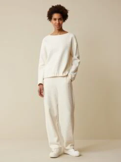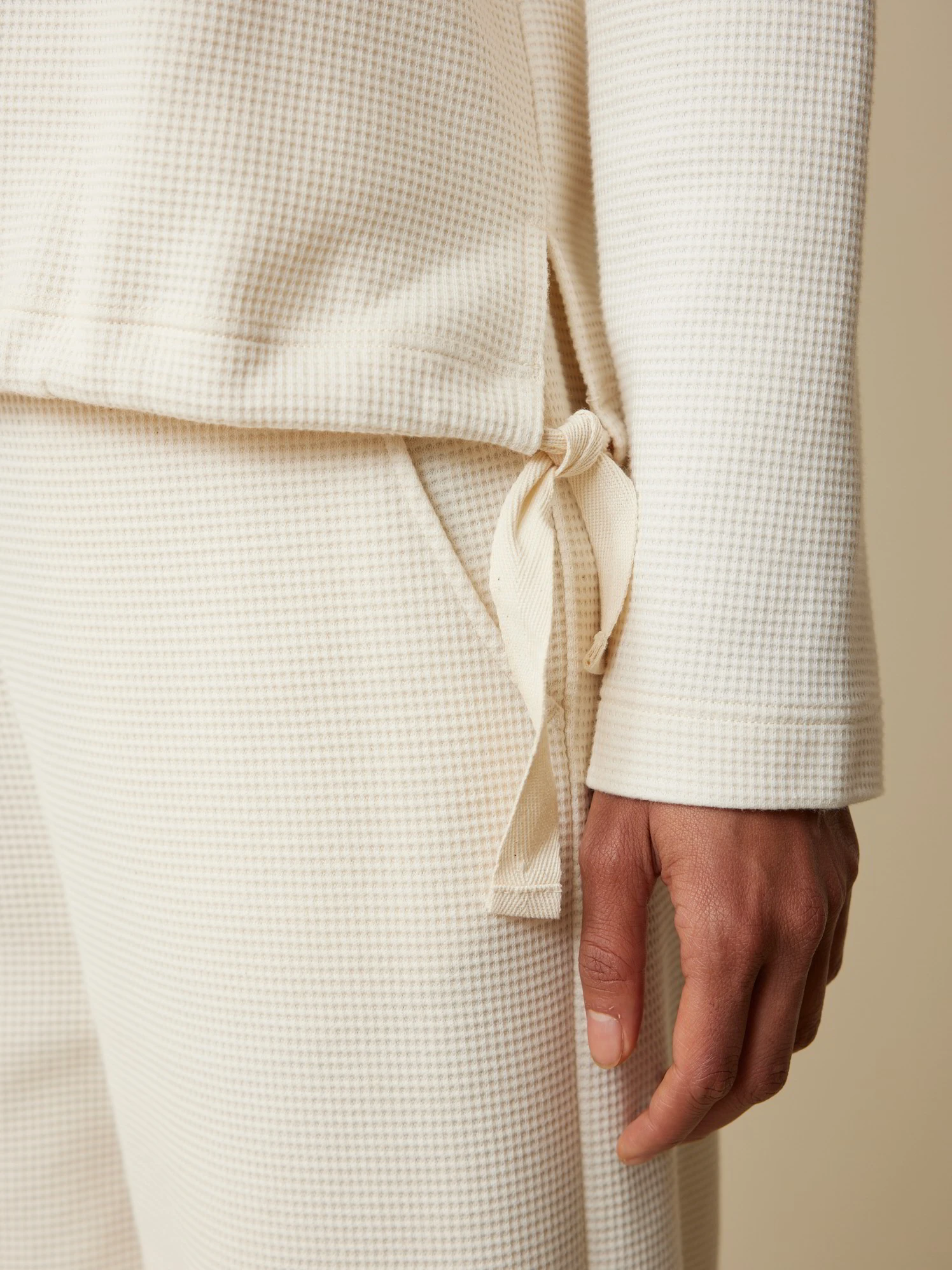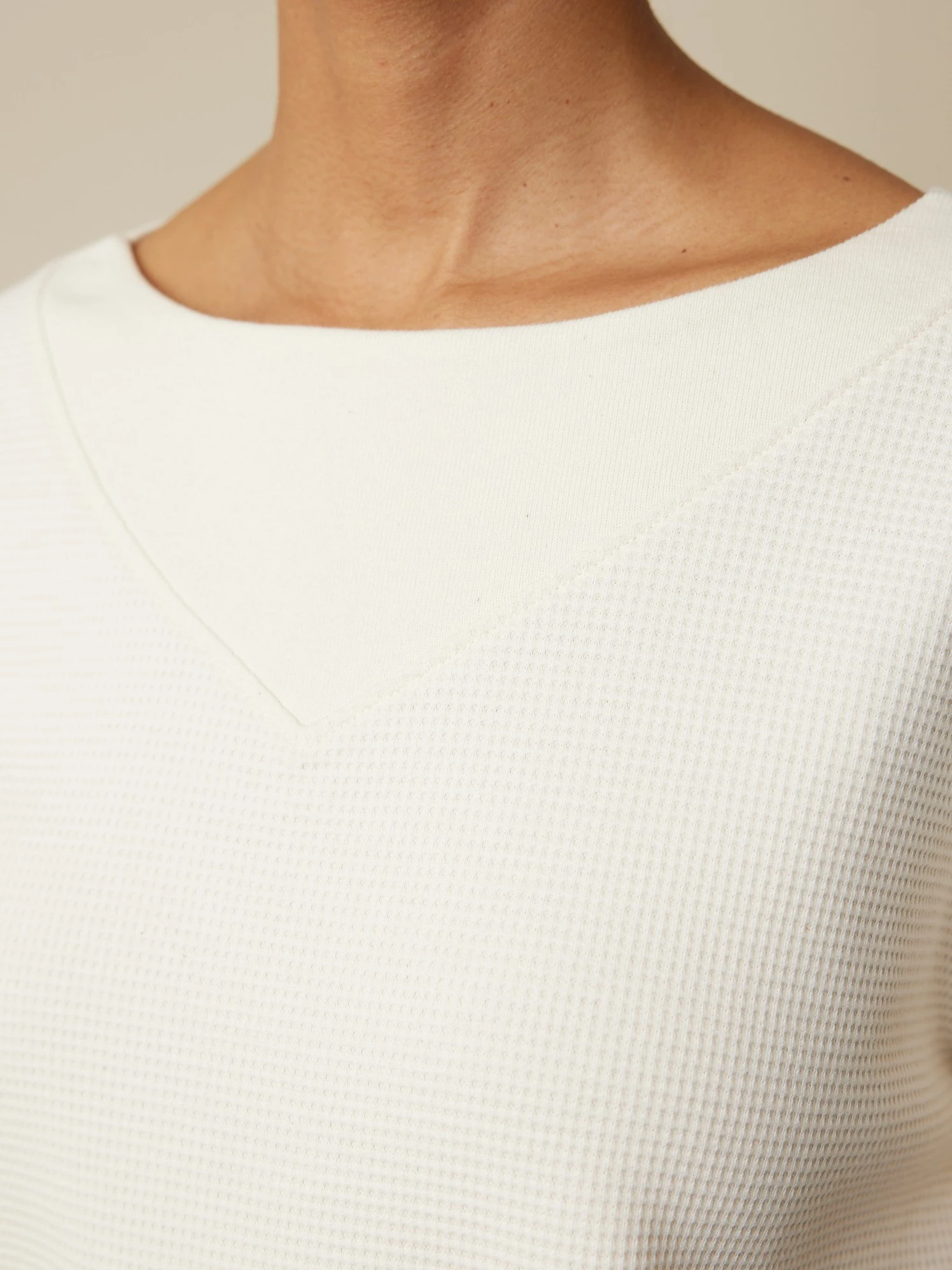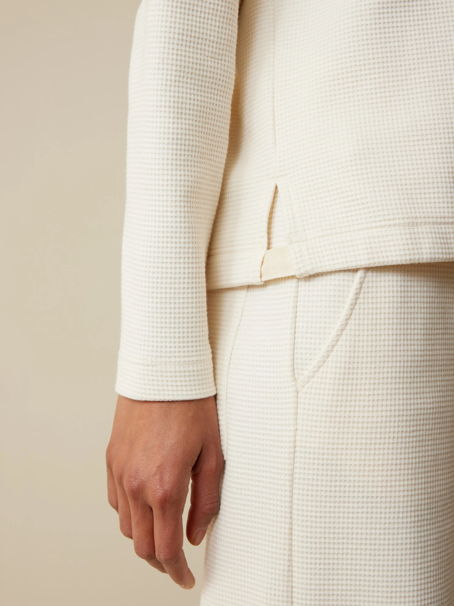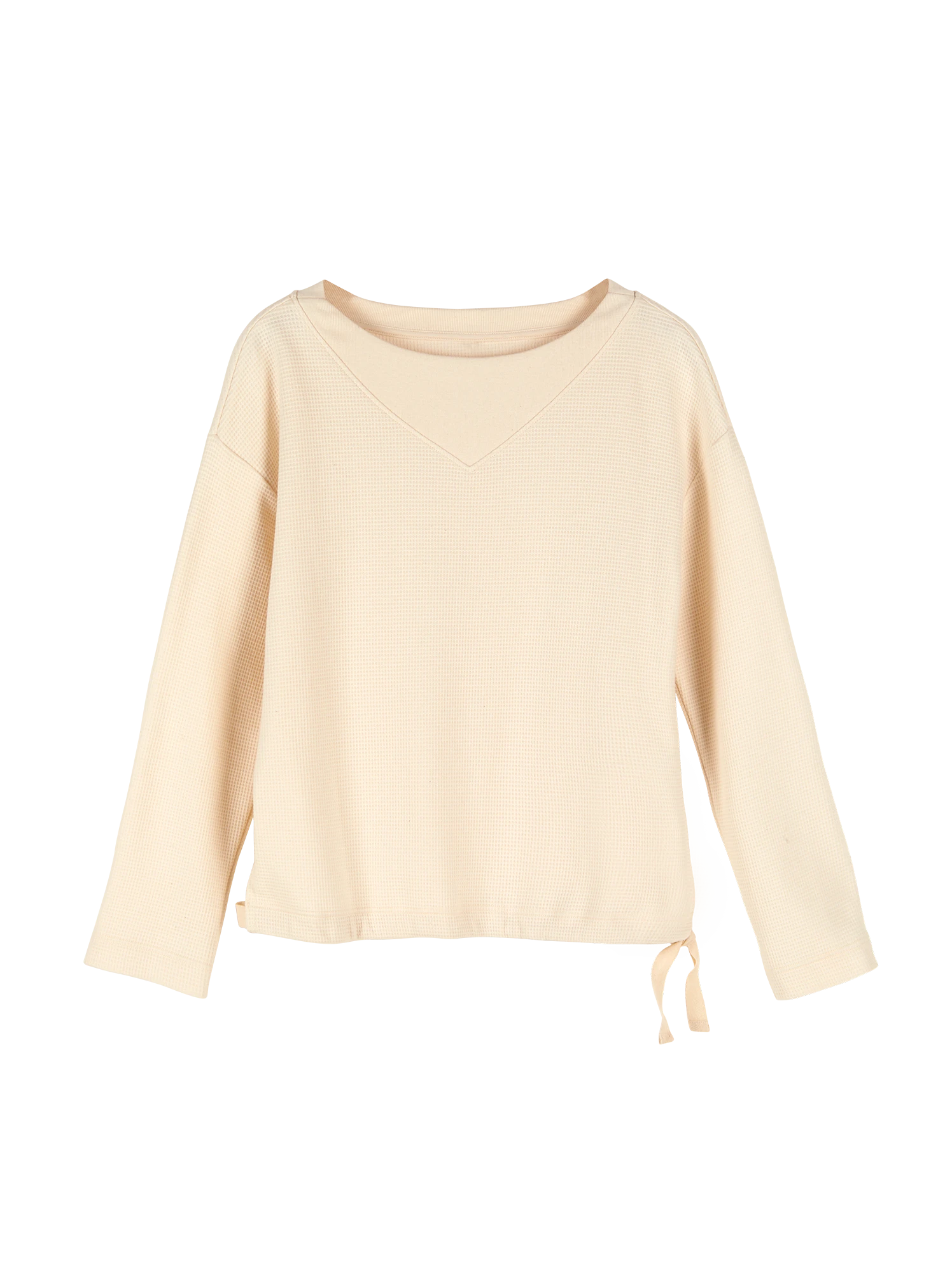Gemütliches Sweatshirt aus feinem Waffelpiqué, mit leichter Struktur. Das Modell besticht mit einem dekorativen Halsausschnitt in feiner 1×1-Ripp-Qualität, überschnittenen Schulterpartien und einem einseitigen Zugband am Saum, um die Weite individuell zu regulieren. Feine Baumwolle sorgt für ein weiches Gefühl auf der Haut. Kombiniert mit der Hose aus Waffelpiqué entsteht ein lässiger Alltagslook.