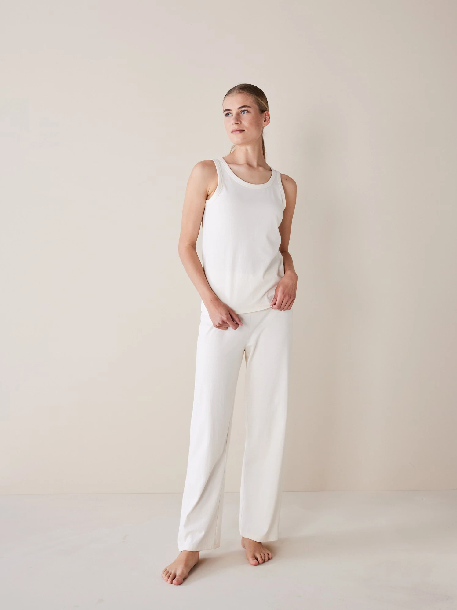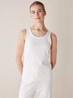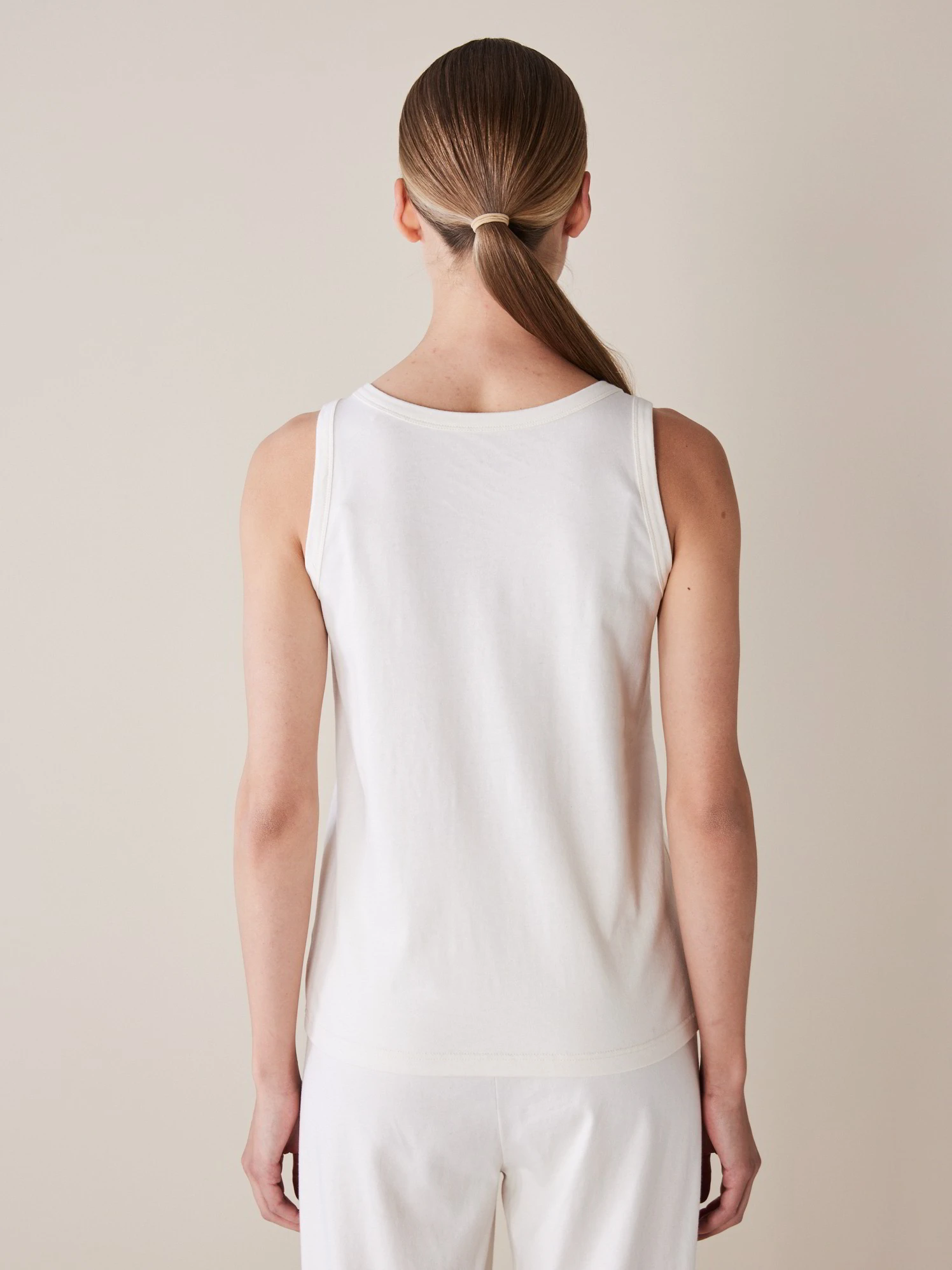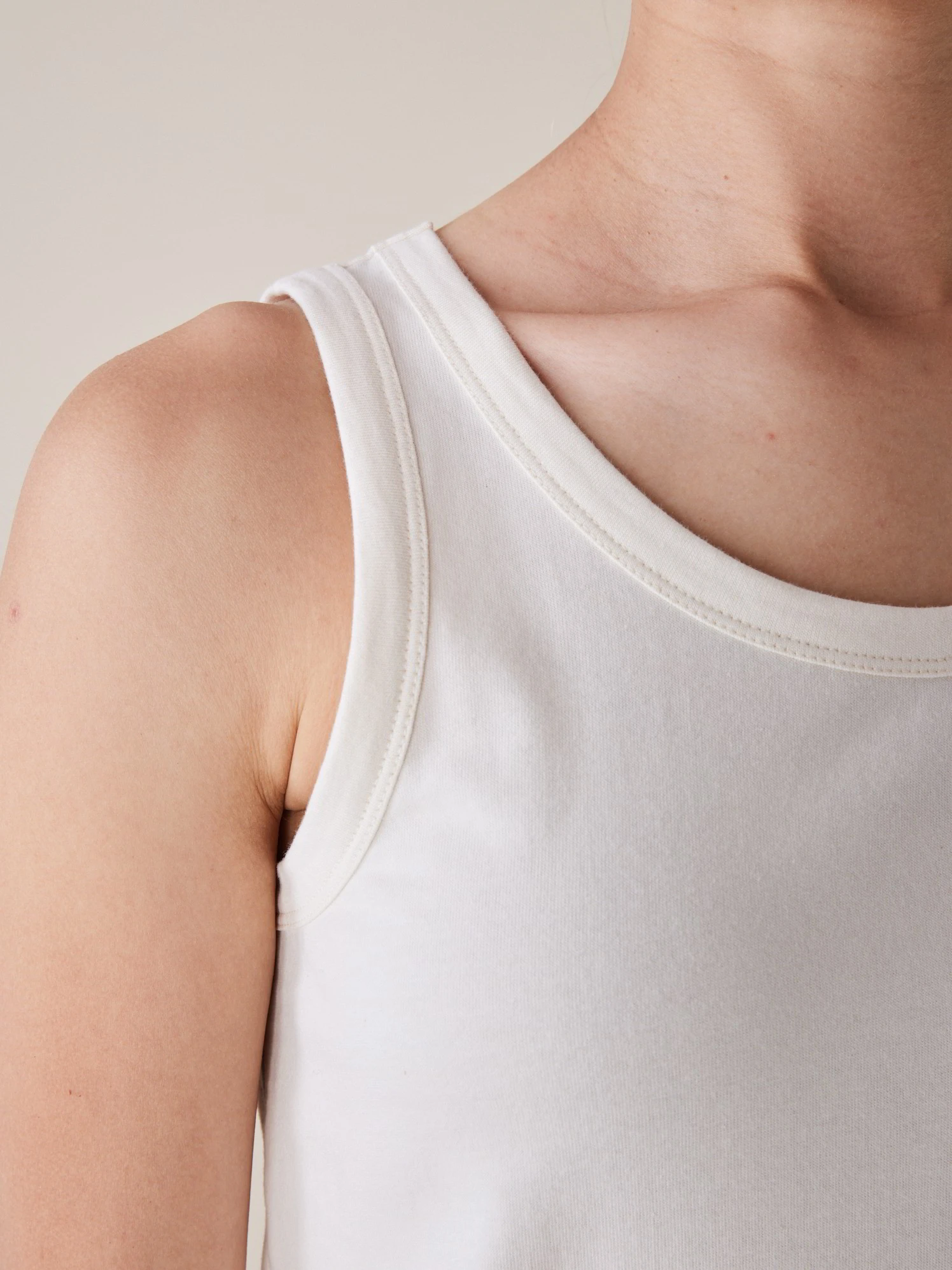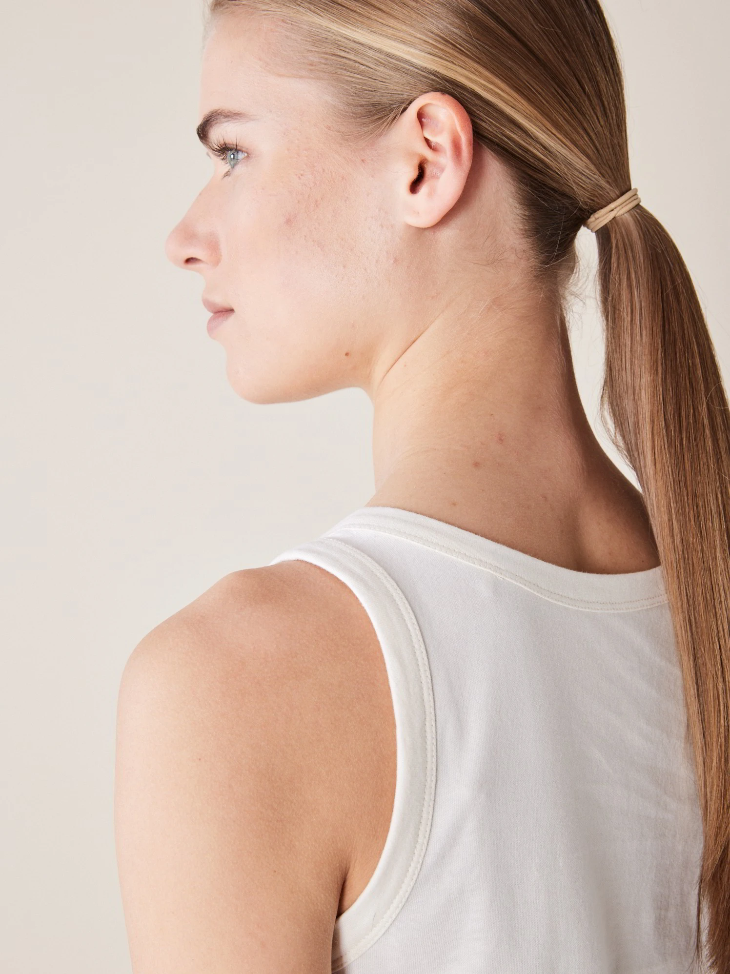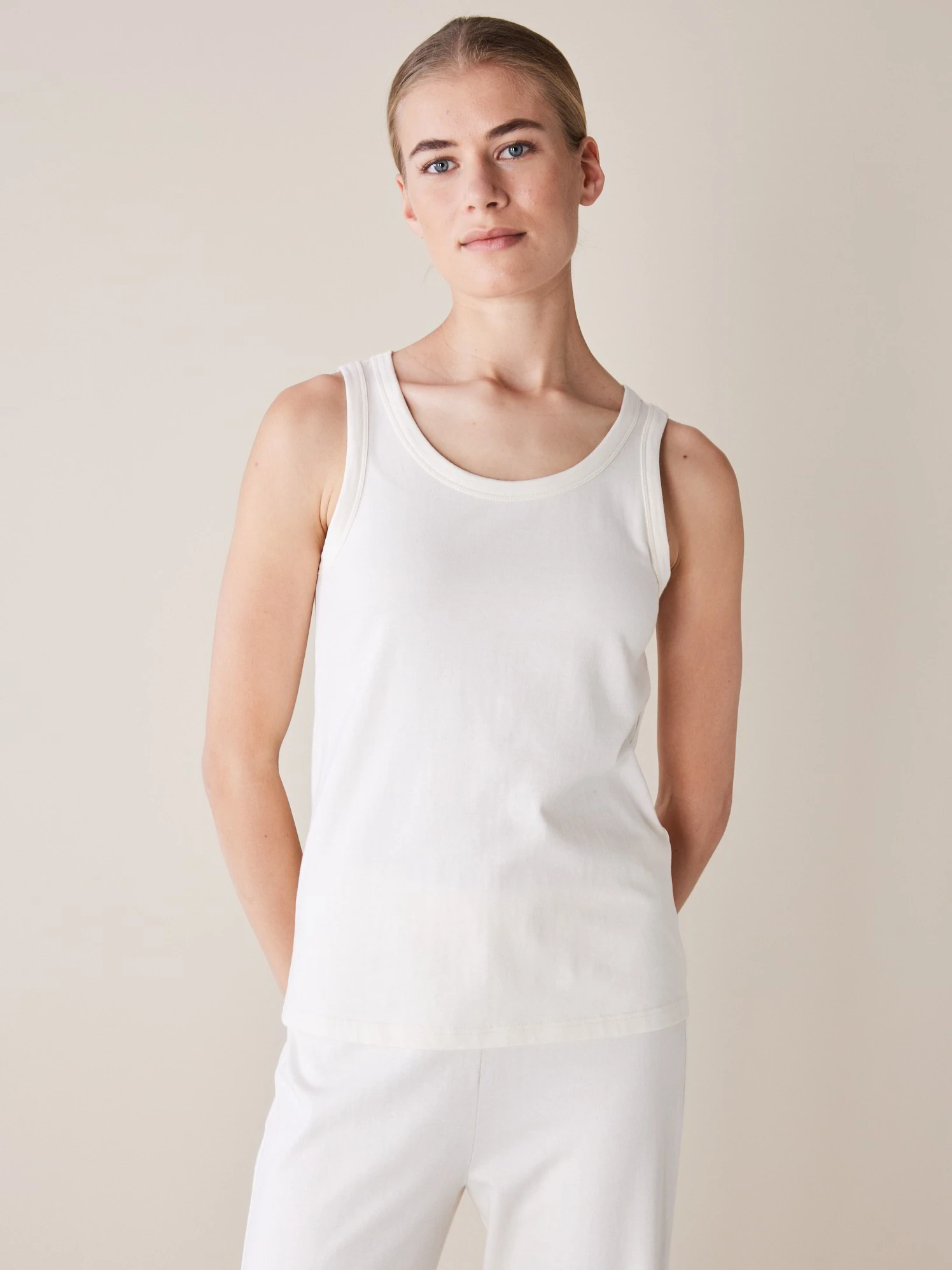 Das Besondere an dem Modell aus feinem Baumwoll-Jersey: Es ist zur Gänze ungefärbt! Das VEGAN-zertifizierte Top mit den breiten Einfassungen hat einen Rundhalsausschnitt und besticht durch seine Schlichtheit – ideal als Solist oder in Kombination.
