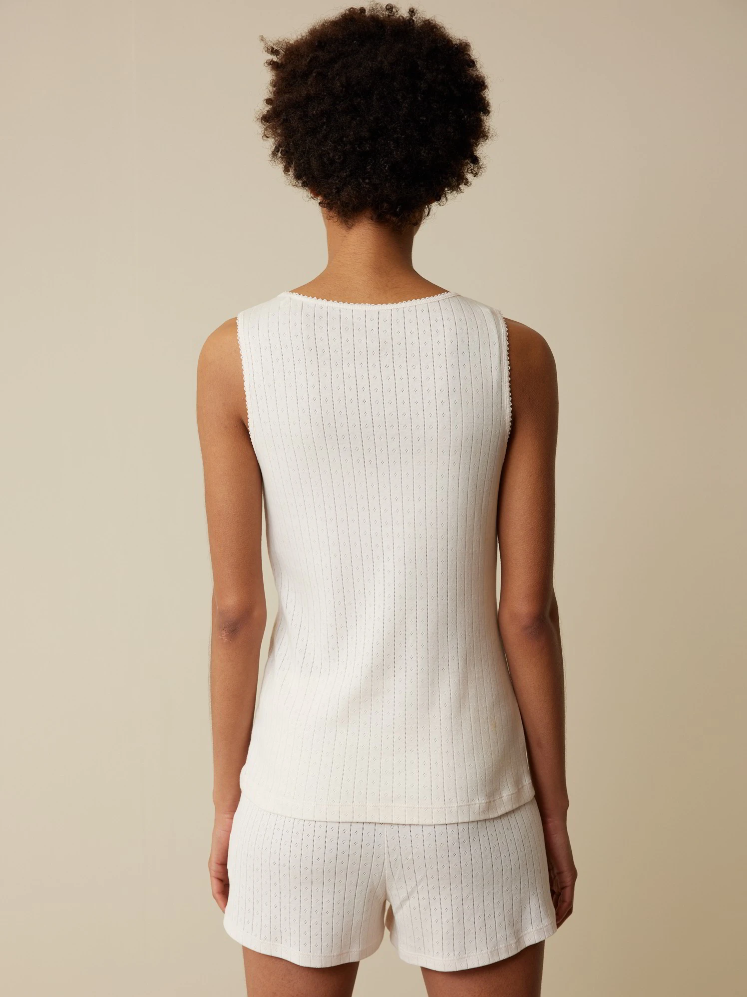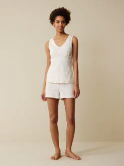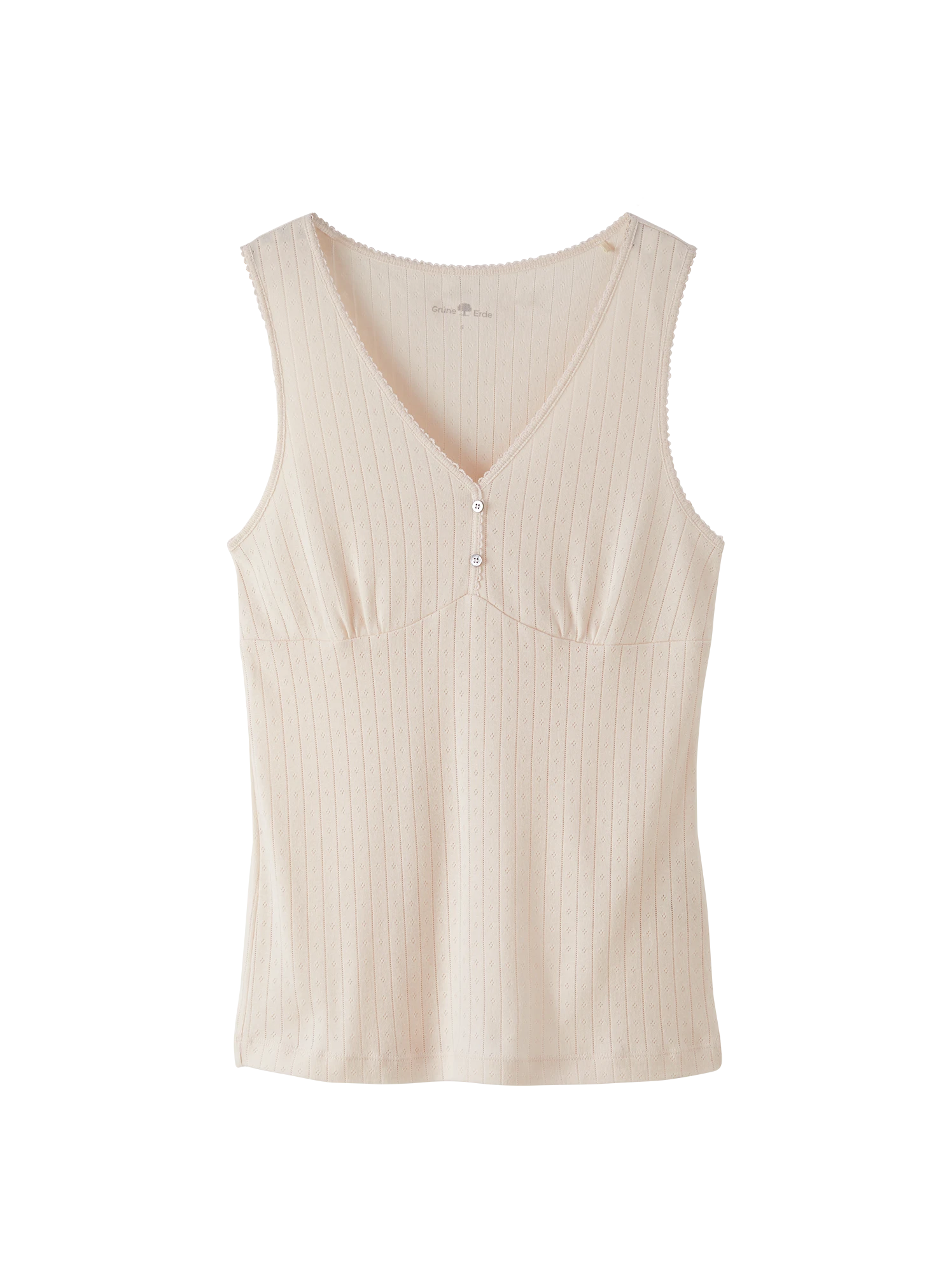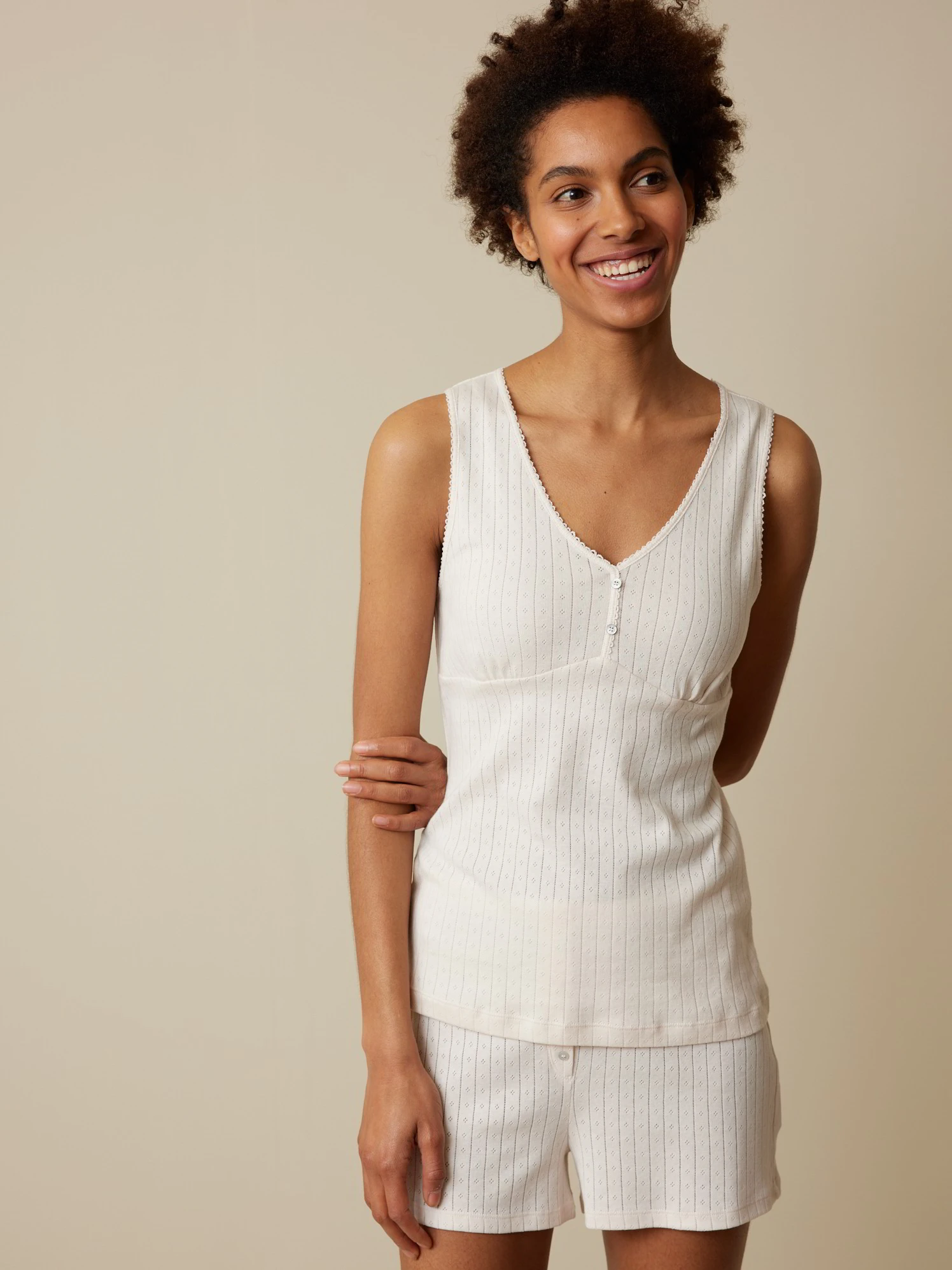 Garantiert ein Lieblingsstück: Schlaftop aus hochwertiger, weicher Baumwolle. Das Modell mit der feinen Ajour-Dessinierung überzeugt mit seiner zarten Optik, dem weichen Griff und der hochwertigen Fertigung – garantiert ökologisch & sozial fair! Abgerundet mit V-Ausschnitt mit kurzer Zier-Knopfleiste und zarten Crochetta-Nähten, Brustabnäher sowie Teilungsnaht auf der Vorderseite.