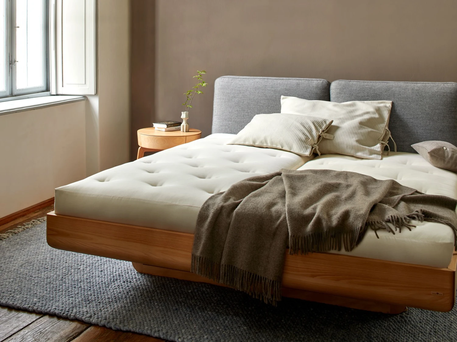 Füllung: Naturlatex aus Malaysia und Indien, Kokoslatex aus Indien, Schurwolle kbT aus England, Baumwolle kbA aus Tadschikistan, Zirbenspäne aus Österreich.