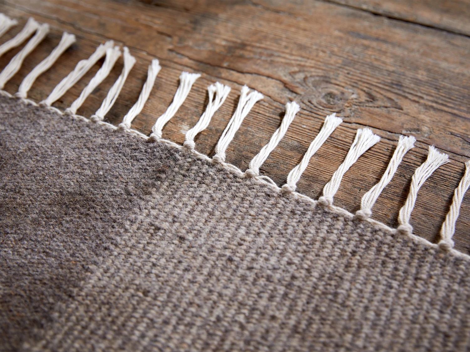 Unser Kelim entsteht in reiner Handarbeit auf 50 Jahre alten, hölzernen Webstühlen in unserem ungarischen Partnerbetrieb. Die Schussfäden aus Schurwolle aus kontrolliert biologischer Tierhaltung (kbT) sind aus sehr flauschig gezwirnten Streichgarnen. Sie werden kräftig ans bereits fertige Gewebe angeschlagen, sodass die Kettfäden aus Baumwolle aus kontrolliert biologischem Anbau (kbA) im fertigen Teppich nicht mehr sichtbar sind. Der Webkörper ist sehr flach und extrem dicht, ca. 1,6 kg/m2. Jeweils 8 Kettfäden sind zu 8 cm langen Fransen geknotet.