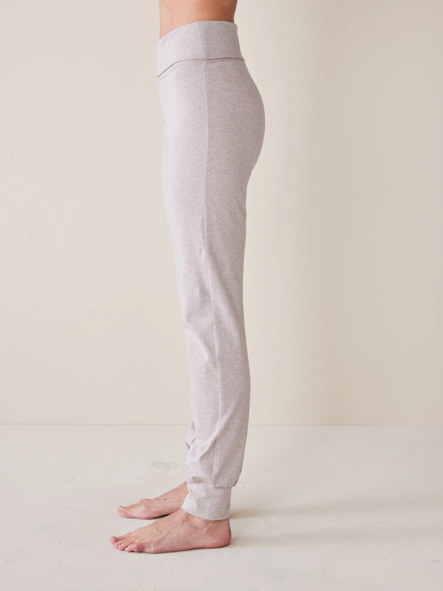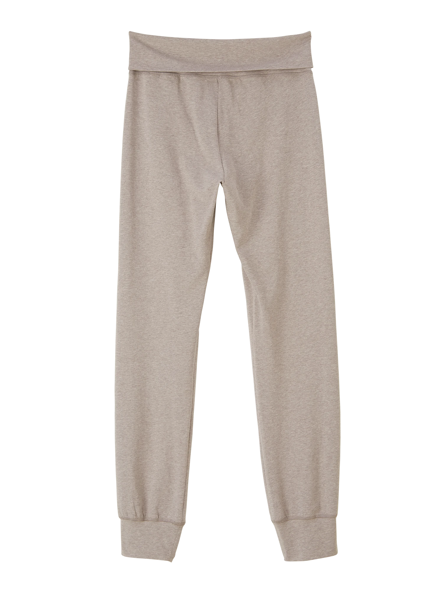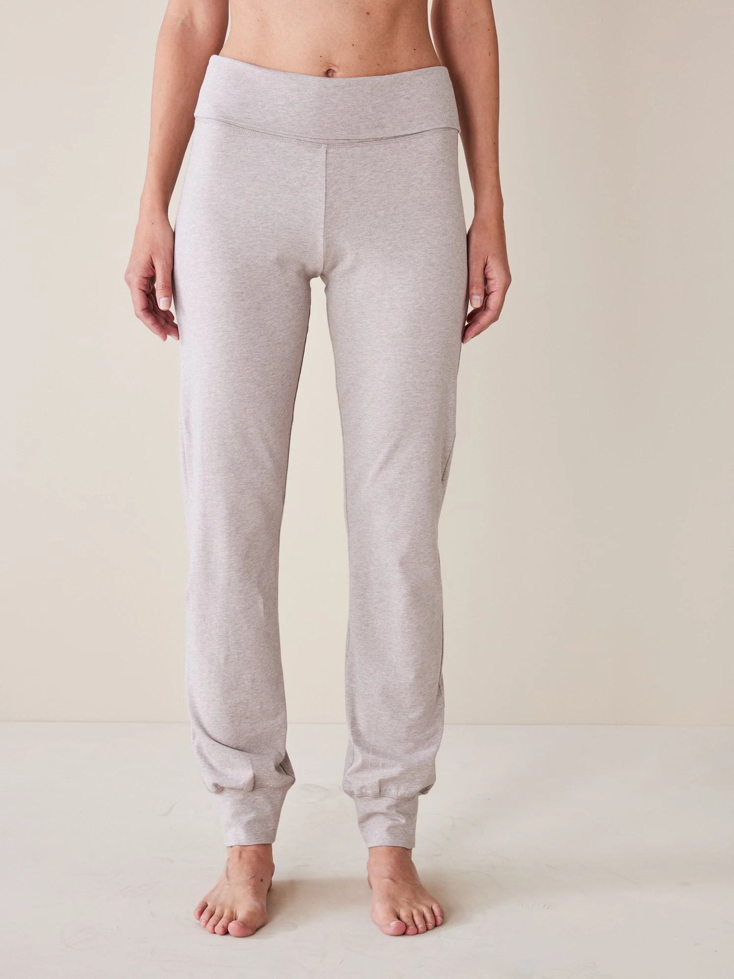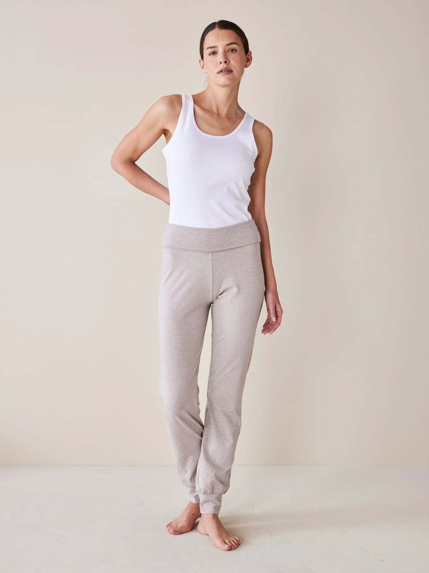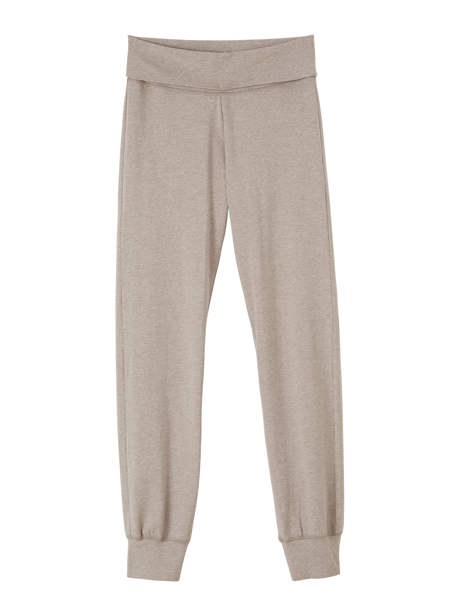 Ob bei Meditationen oder während sanften Yogaeinheiten: Die Hose aus weicher Baumwolle kbA und geringem Elasthan-Anteil bietet uneingeschränkte Bewegungsfreiheit und höchsten Tragekomfort. Während Flatlocknähte am Bundansatz und Saumbündchen als optisches Detail punkten, unterstützt der breite Umschlagbund die formtreue, geschmeidige Single-Jersey-Yogahose.
