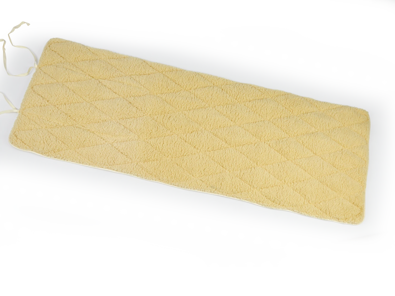 Diese Yogamatte entsteht aus der Kombination reiner Baumwolle und weicher Schafschurwolle und wird bei unserem Partnerbetrieb sozial fair und umweltschonend gefertigt. Der Bezug der Oberseite besticht mit angenehmer Schurwolle auf atmungsaktivem Baumwollrücken auf der Ober- und mit leichtem, dicht gewebtem Baumwoll-Perkal auf der Unterseite, welche mit einer mittig platzierten hauchdünnen Antirutsch-Beschichtung veredelt wurde, um ein eventuelles Rutschen von Händen und Füßen während der Yoga-Übungen zu vermeiden. Die Füllung ist reine Schafschurwolle (800 g). Die unterschiedlichen Schichten sind rautenförmig miteinander versteppt und mit einem Einfassband sauber verarbeitet. Zwei Baumwollbändchen sorgen für ein unkompliziertes Zusammenrollen der Yogamatte.